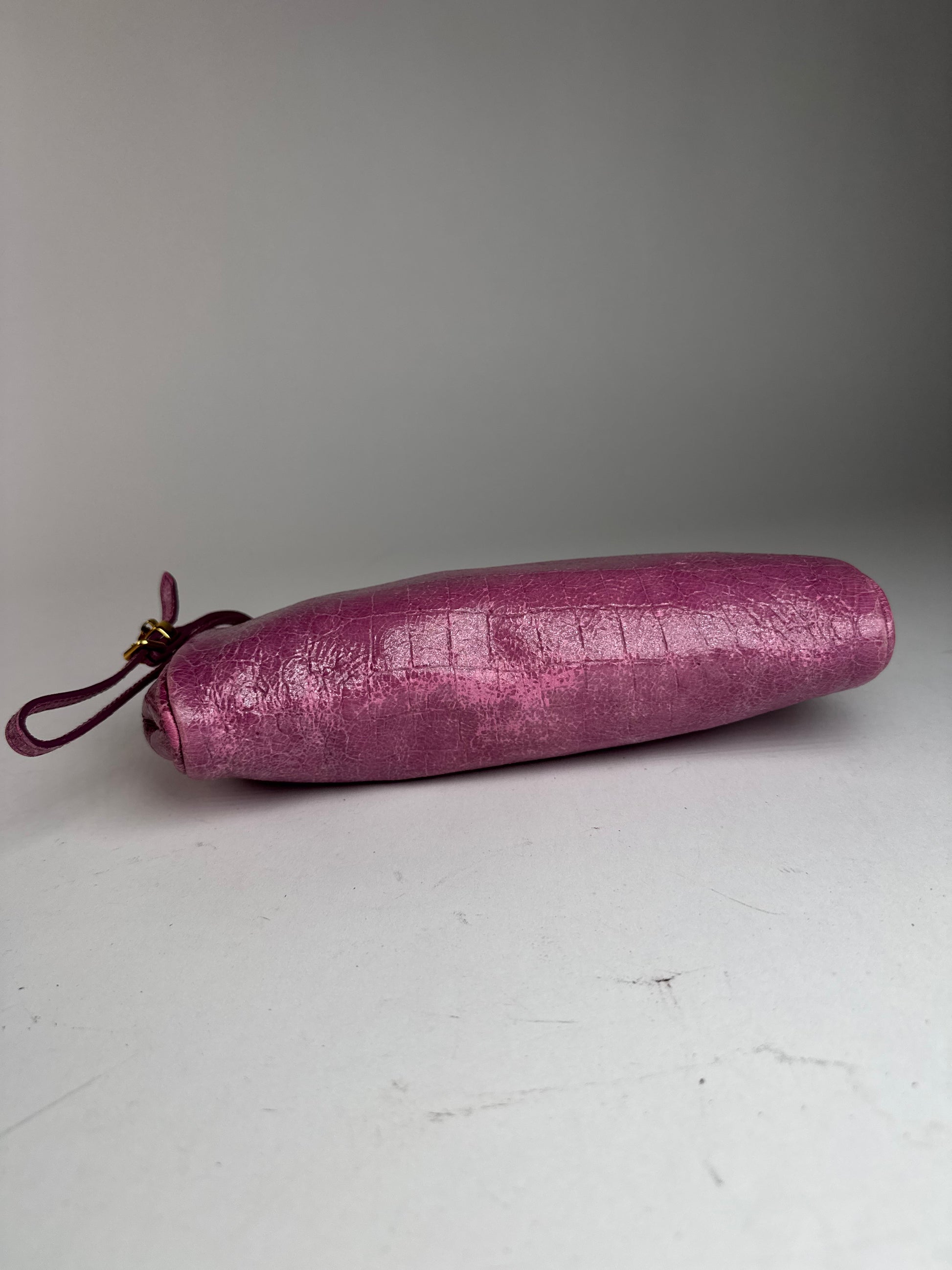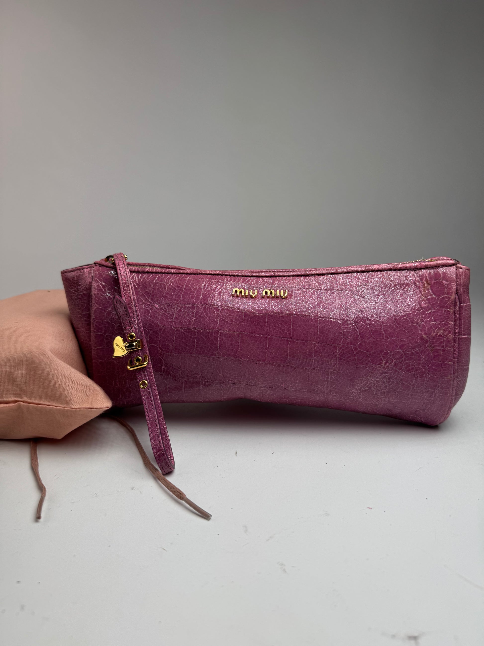 Pochette MIU MIU Vintage en cuir lilas effet croco. Cette élégante pochette est confectionnée en cuir lilas effet croco et est dotée d'une longue boucle en cuir assortie fixée à la fermeture éclair supérieure, pour une utilisation polyvalente et une manipulation aisée. Les finitions sont en acier doré. Le devant est orné du logo Miu Miu doré. L'intérieur est doublé de toile lilas. Fabriquée en Italie, cette pièce allie texture, couleur et fonctionnalité dans un design intemporel.