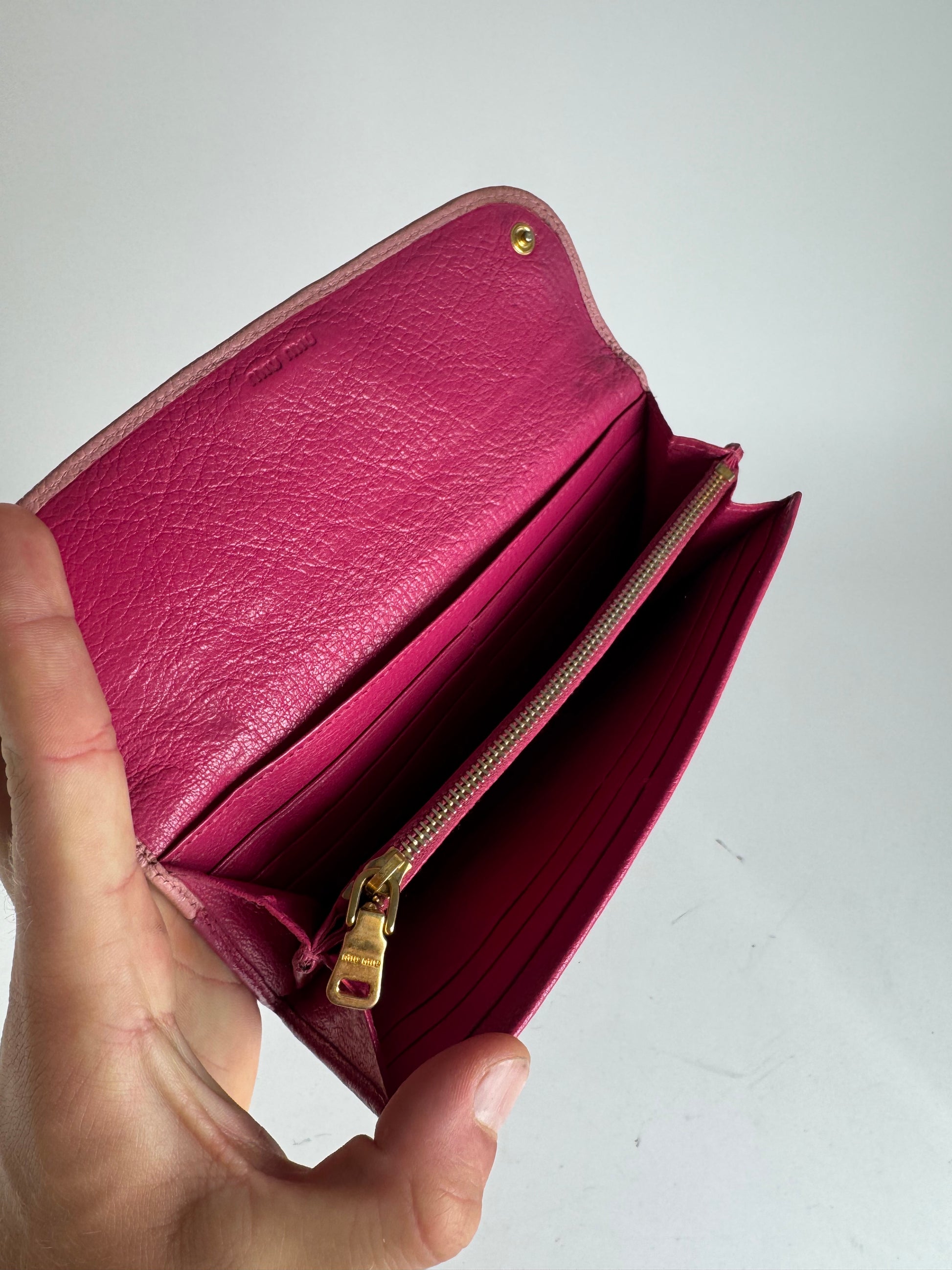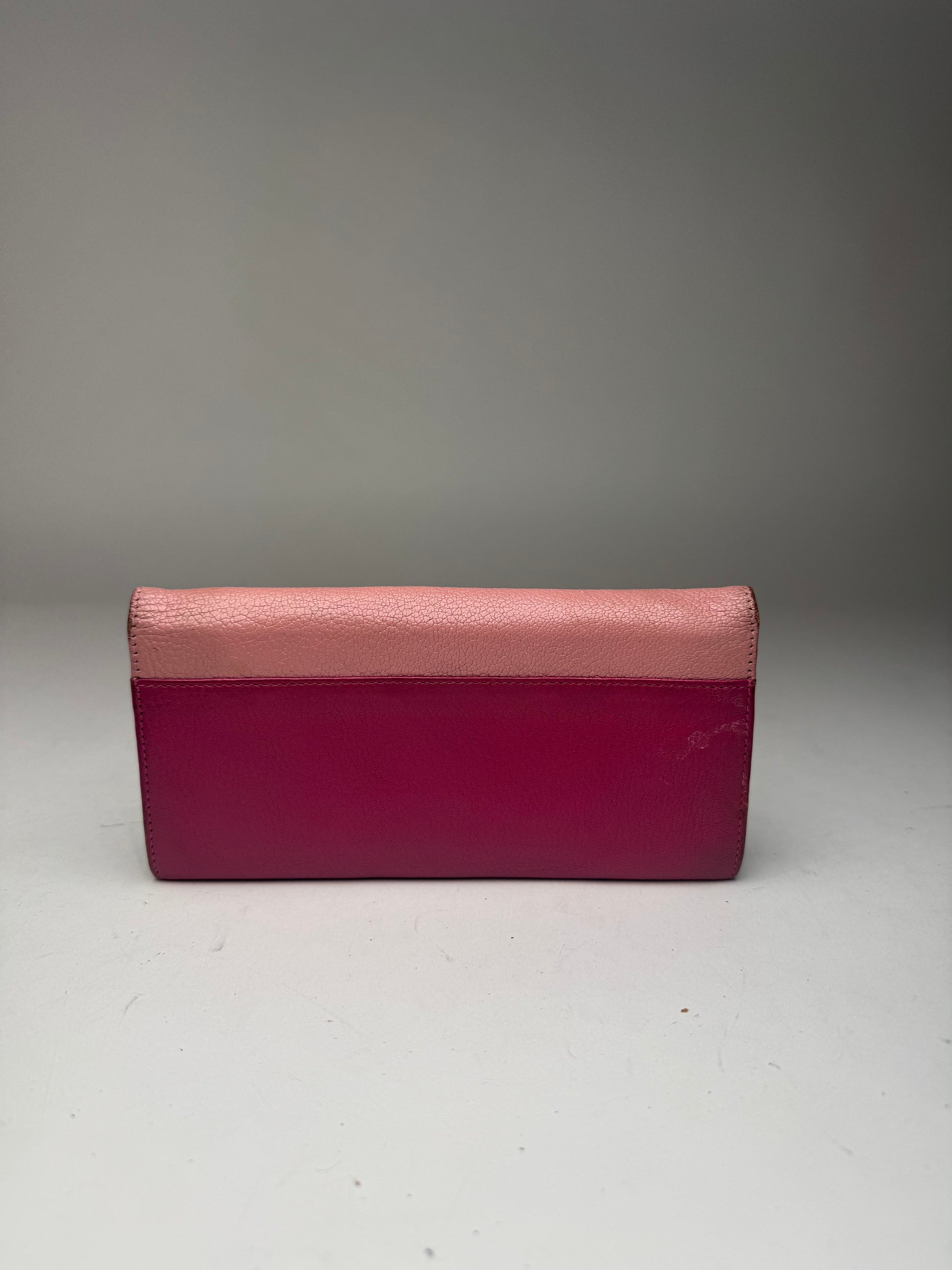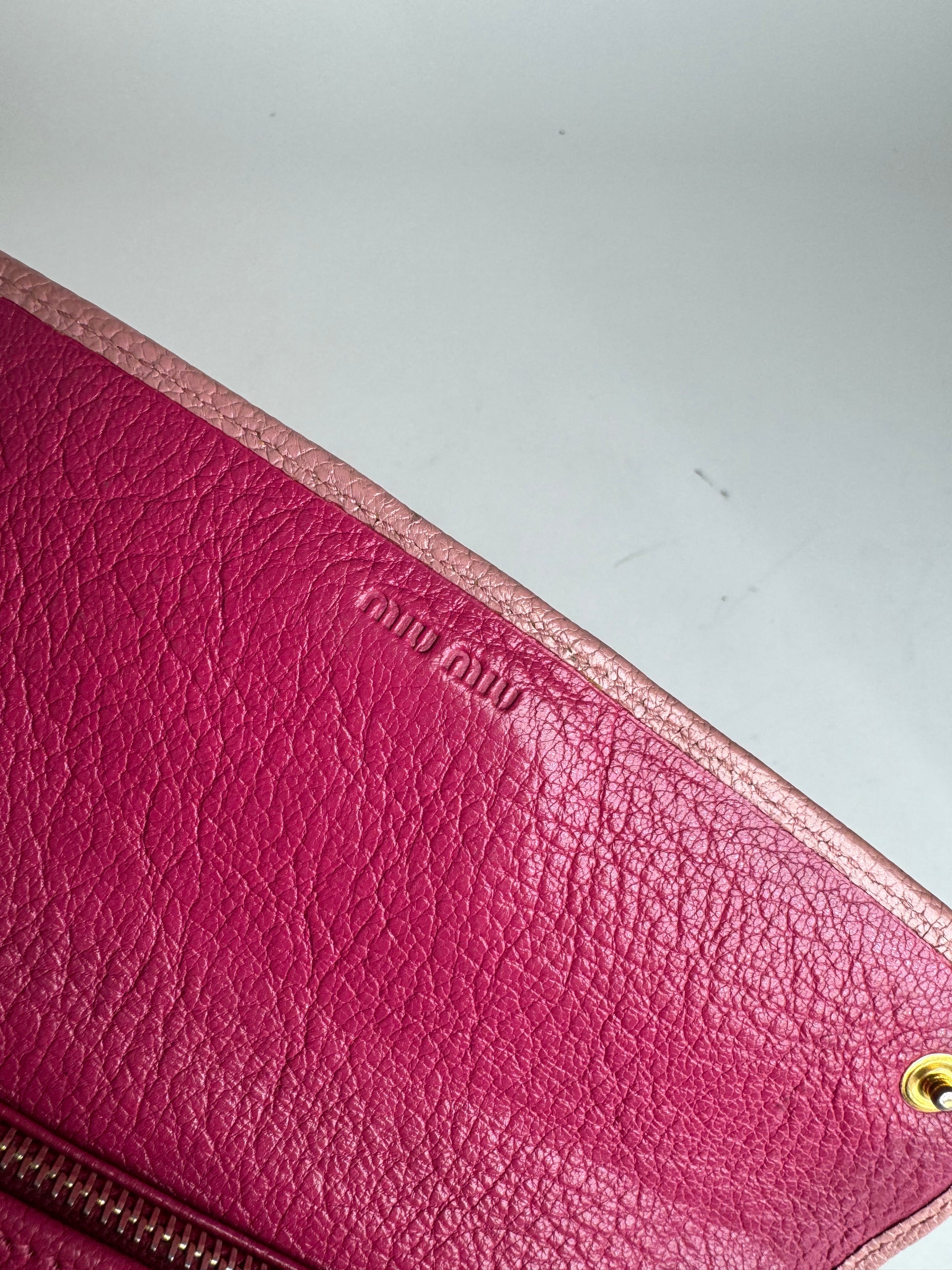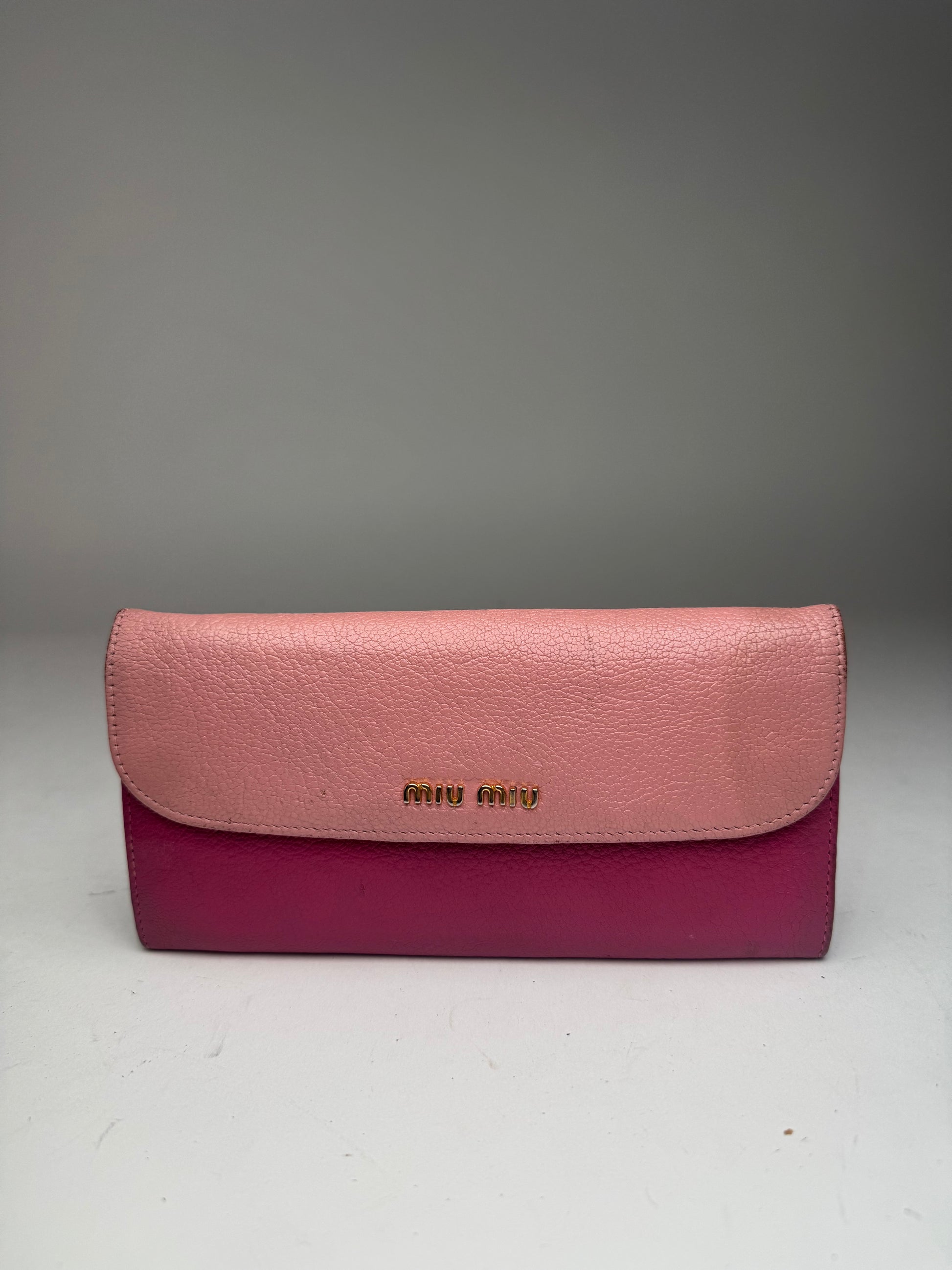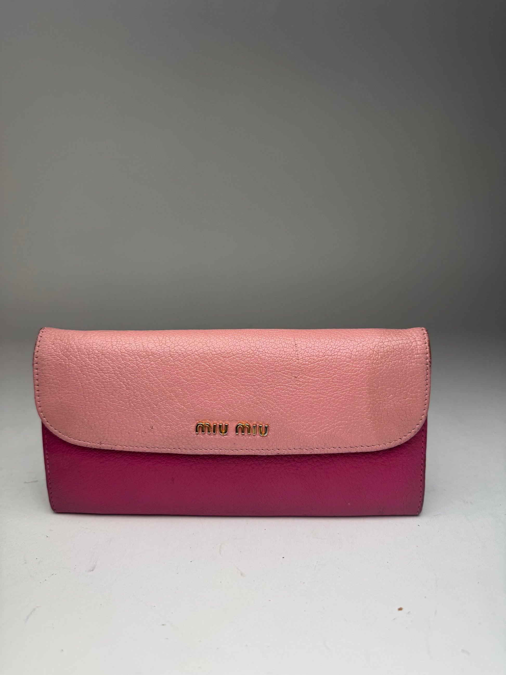 Portefeuille vintage MIU MIU. Cet élégant portefeuille est finement confectionné en cuir rose et violet. Il est doté d'un fermoir à pression en acier doré et d'un logo Miu Miu en acier doré sur le devant. L'intérieur est doublé de cuir rose et comprend un compartiment zippé.