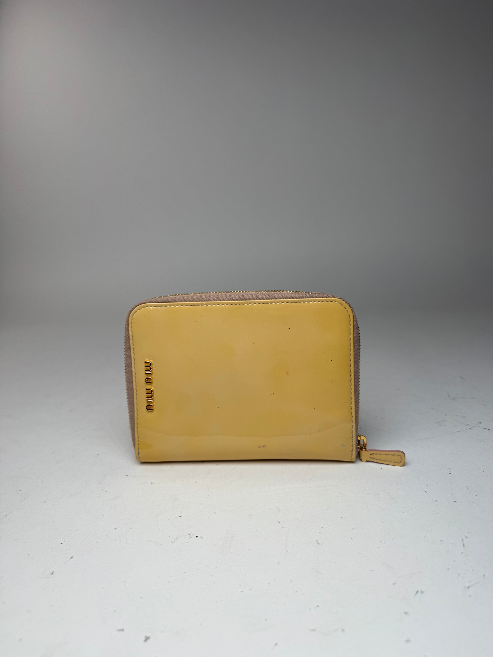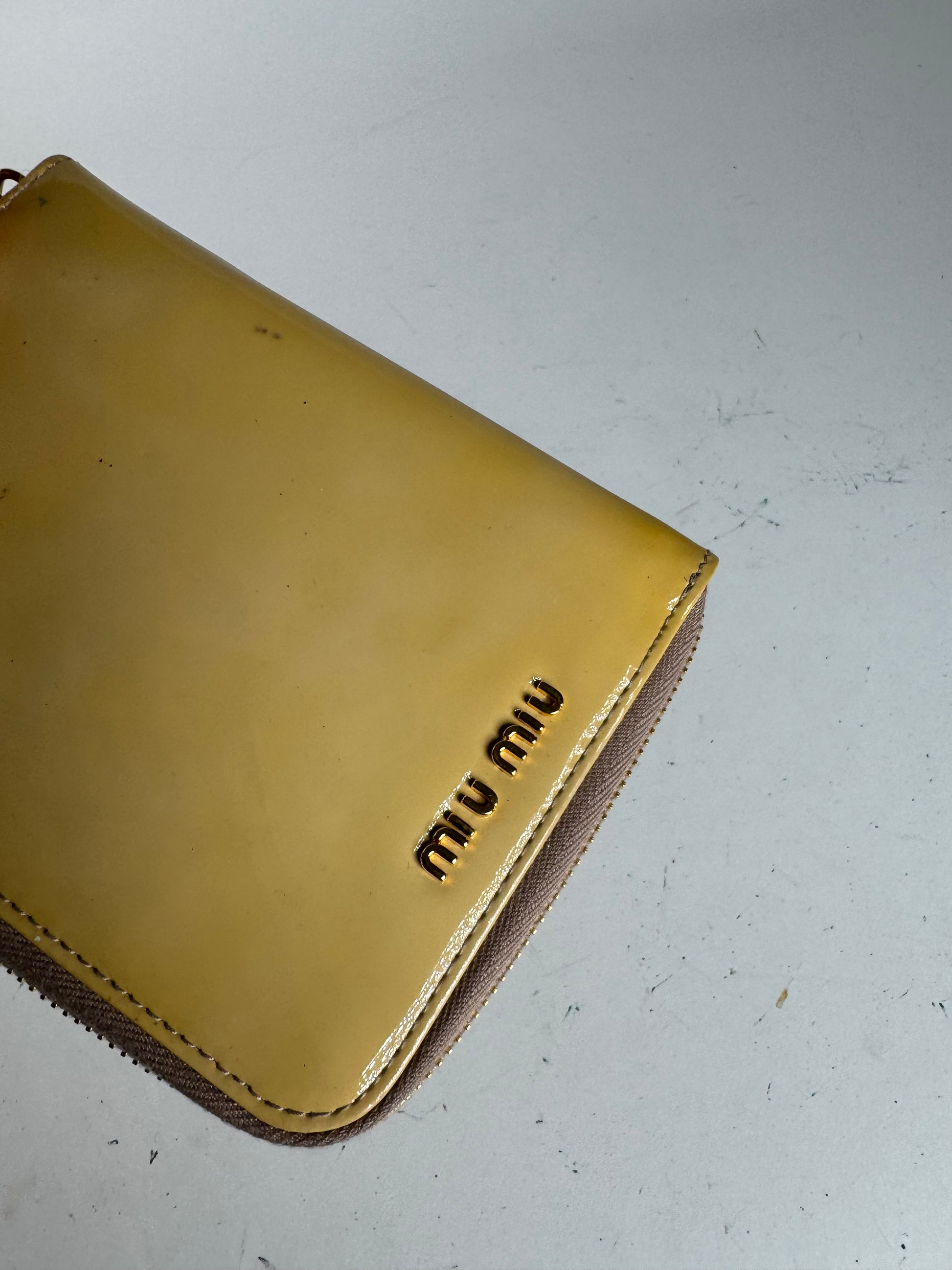 Cet élégant organiseur est finement confectionné en cuir verni jaune. Il est orné d'un nœud décoratif appliqué au dos, d'accessoires en acier doré et d'une fermeture éclair sur le dessus. L'intérieur est doublé de cuir lilas.