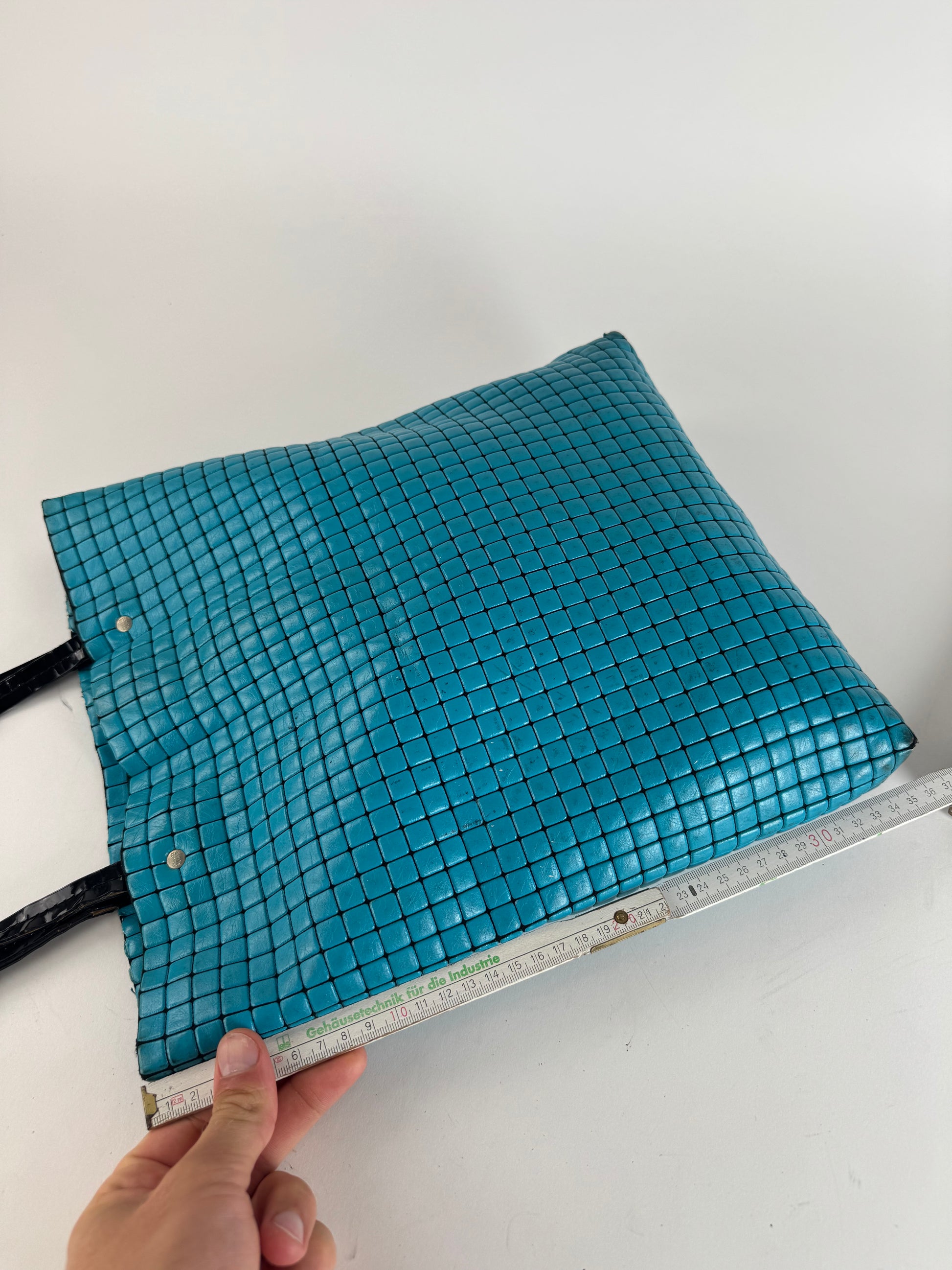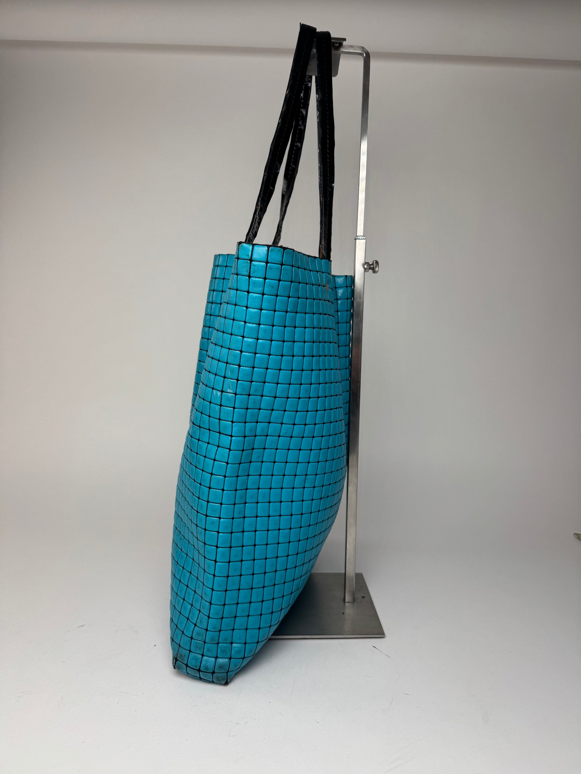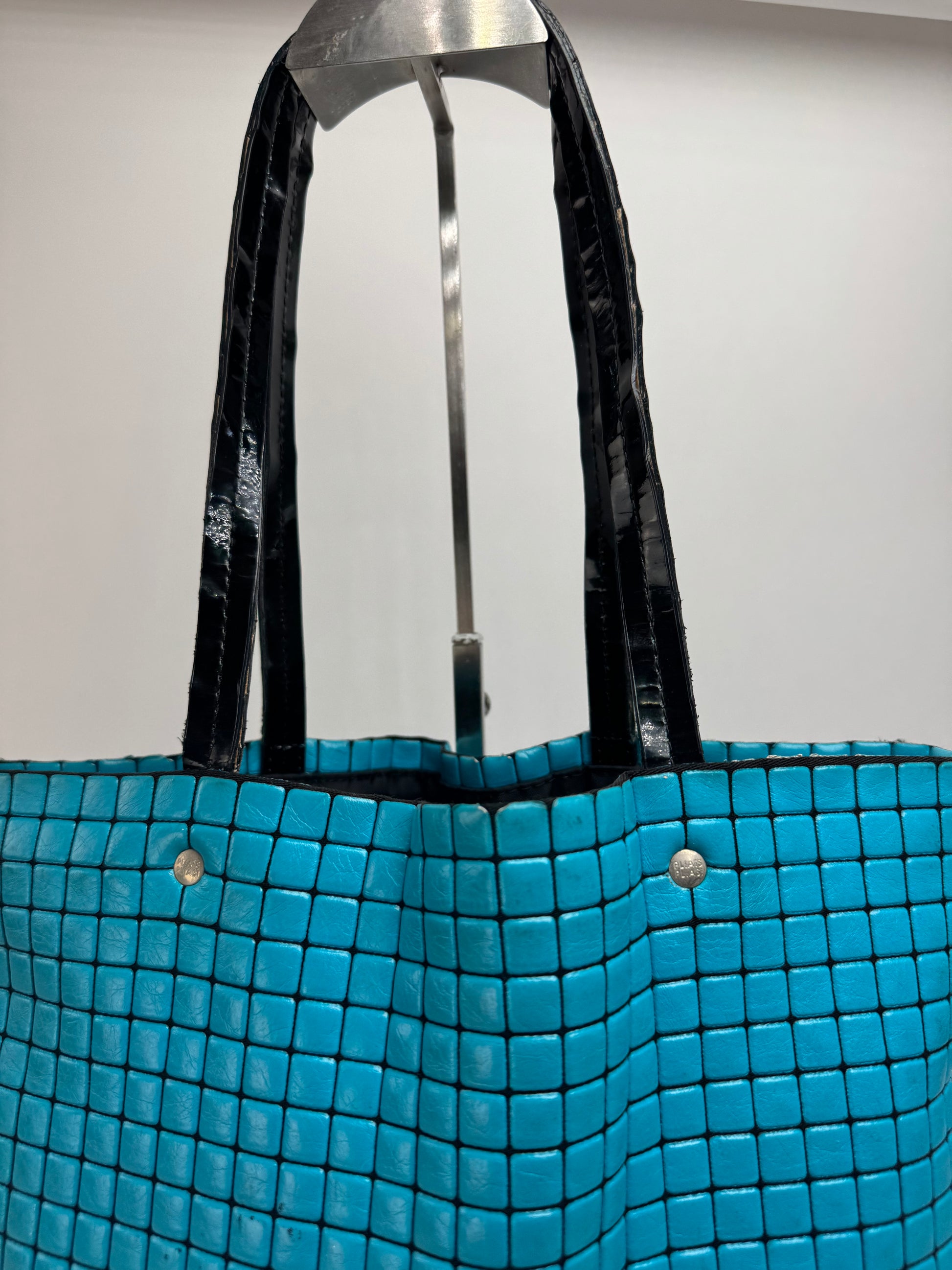 Sac fourre-tout vintage en cuir verni noir et bleu ISSEY MIYAKE.