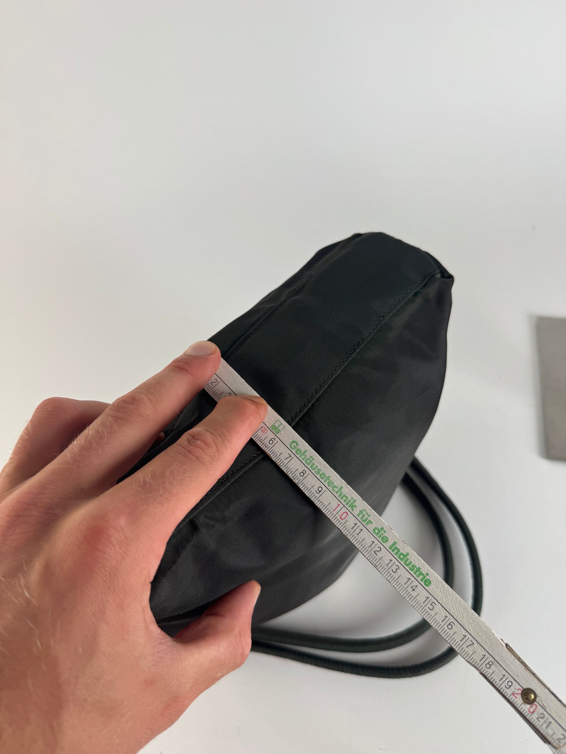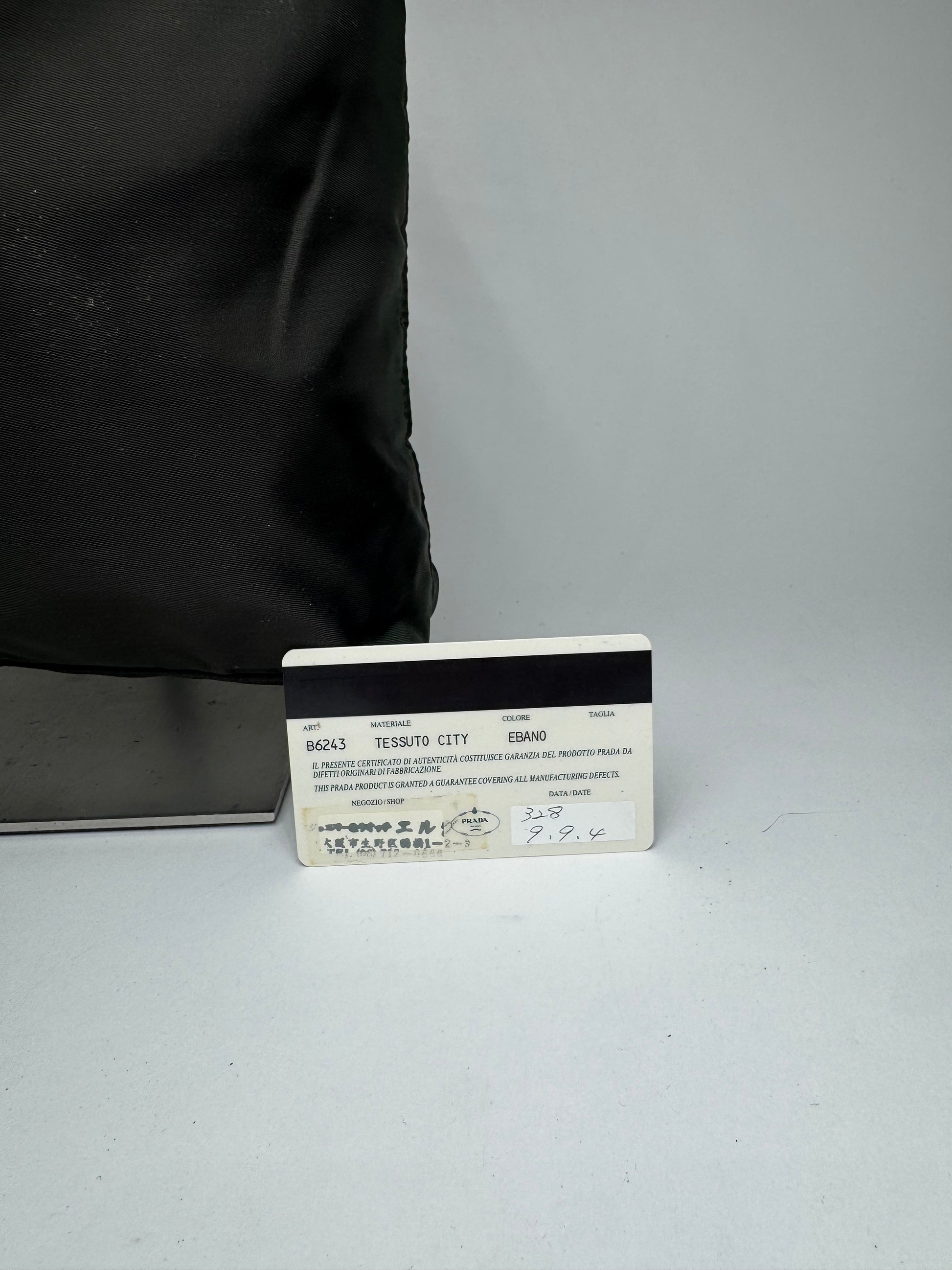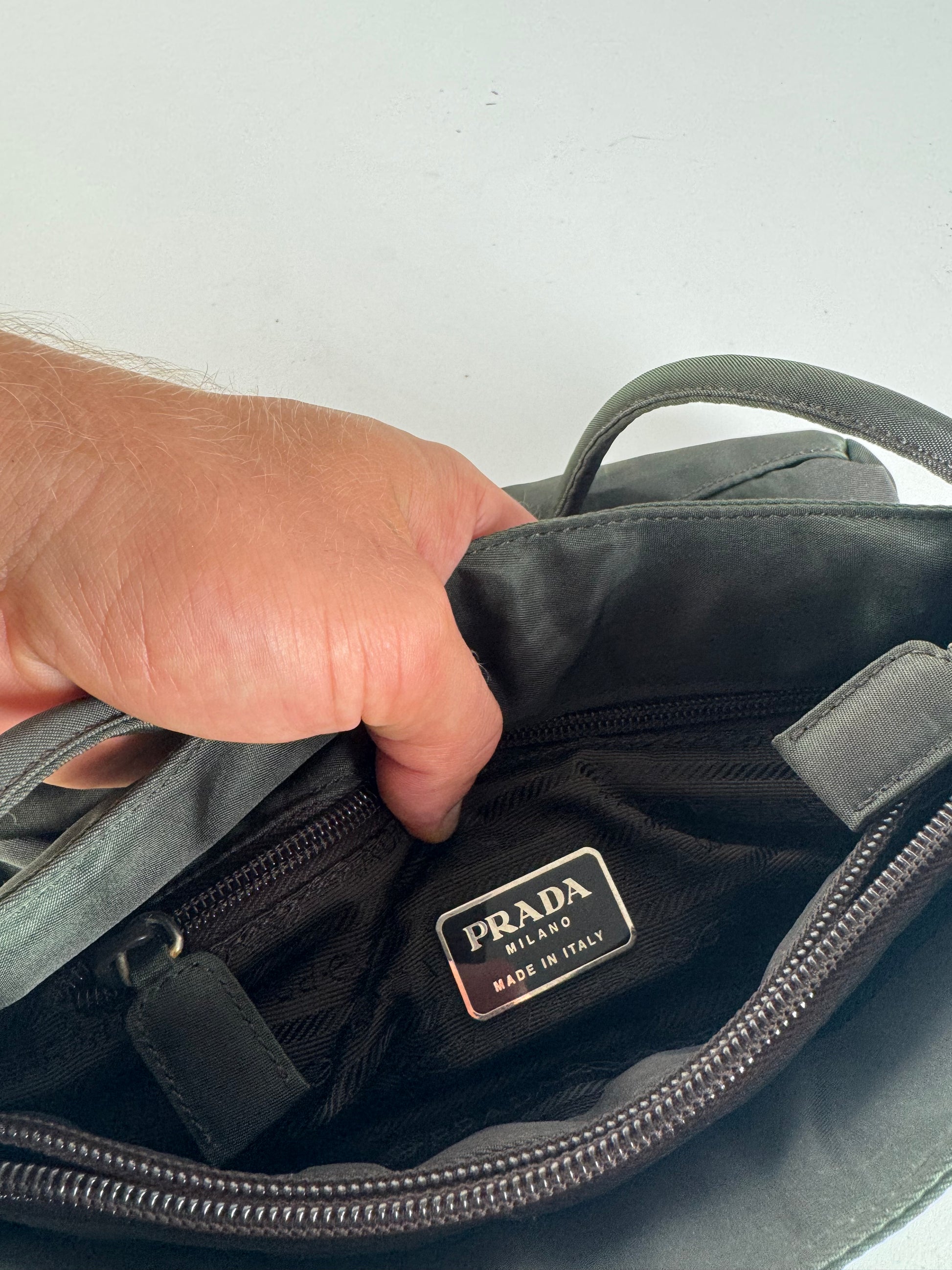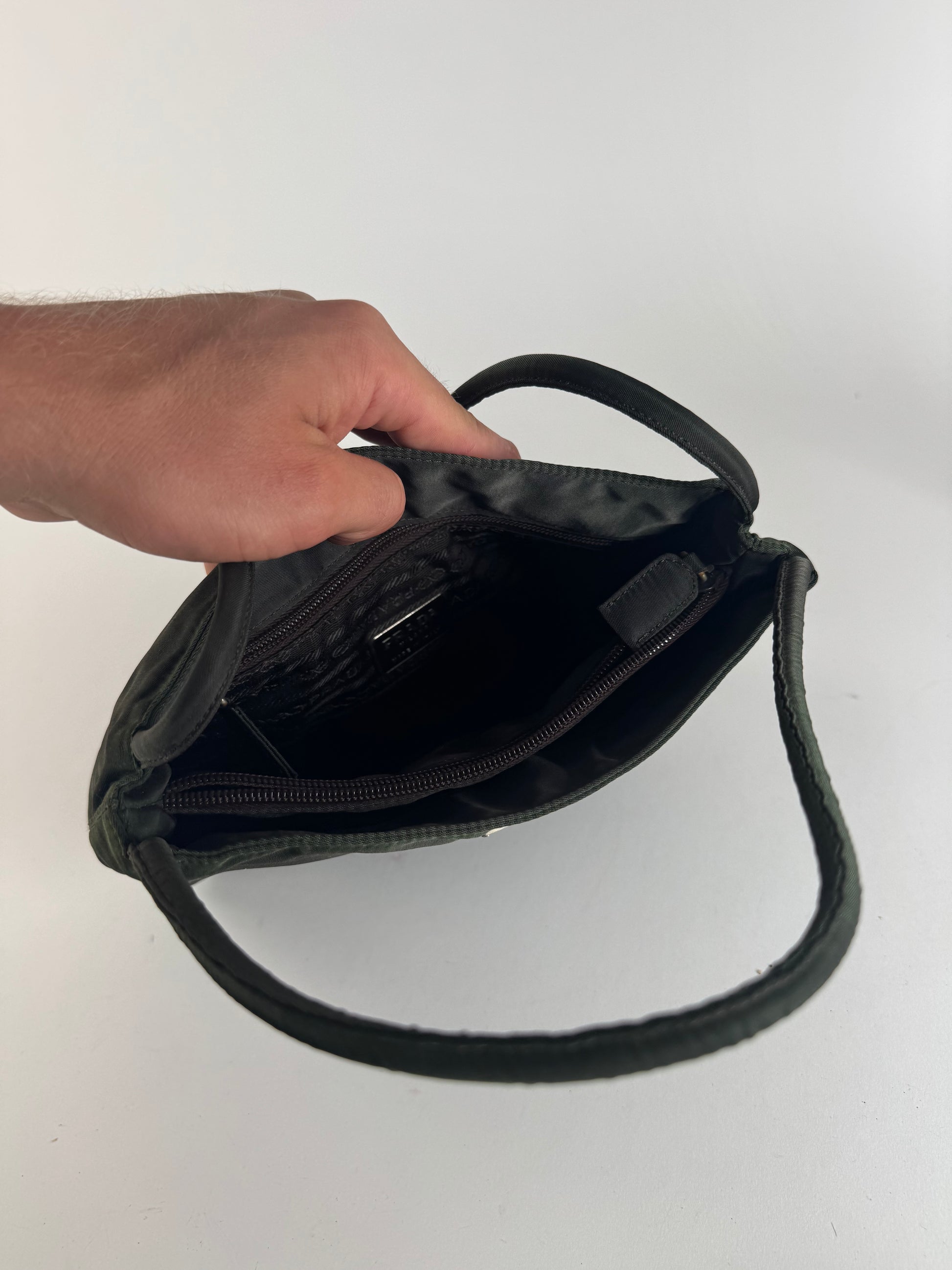Ce sac à main chic est finement confectionné en polyester vert et doté de deux poignées élastiques synthétiques pour une silhouette sportive et moderne. Créé en 2004, il fait partie de la ligne emblématique Tessuto City de Prada. Le devant est orné du logo triangulaire Prada en acier argenté. L'intérieur, doublé de toile monogrammée Prada noir et marron, comprend trois compartiments.