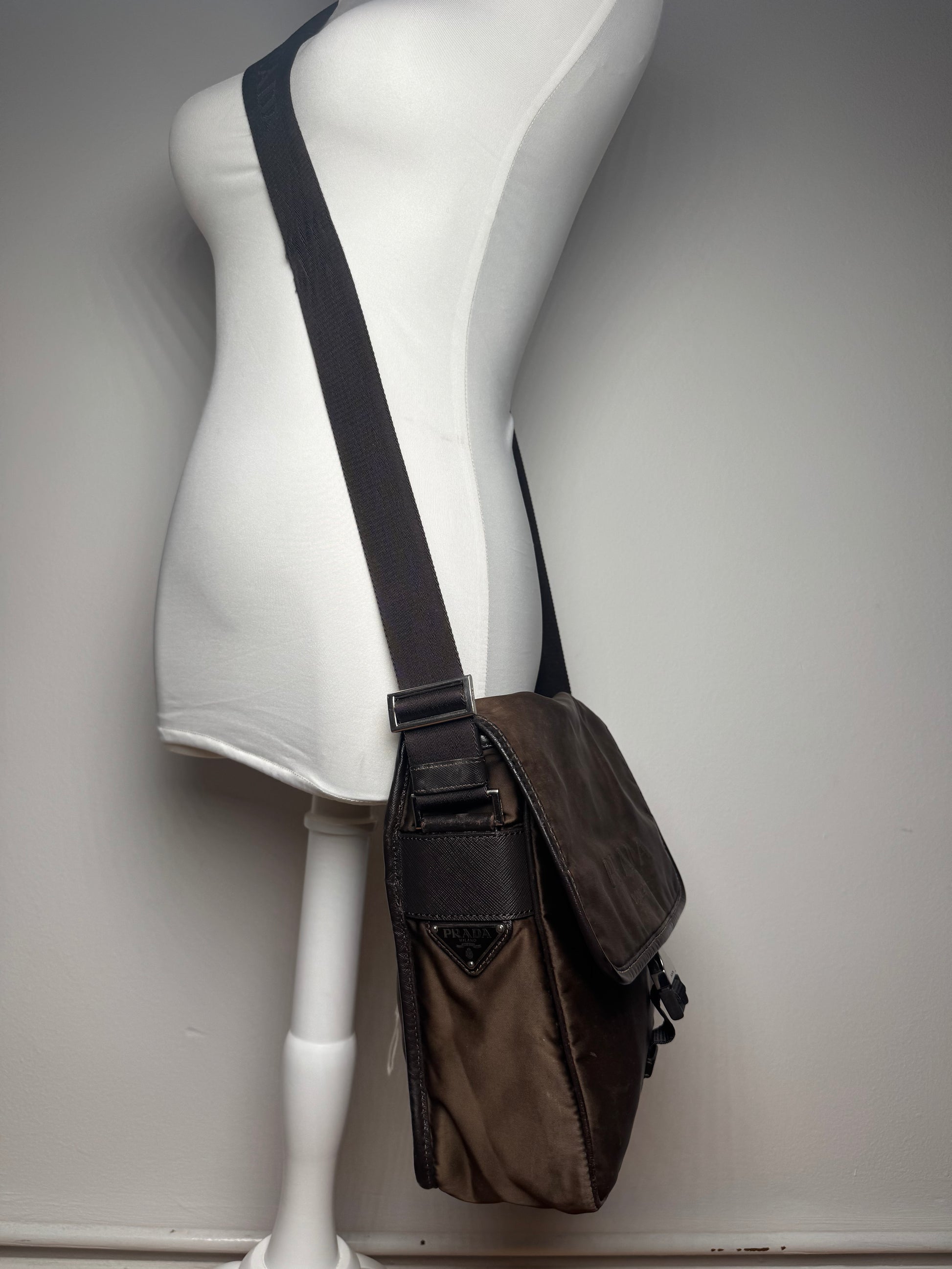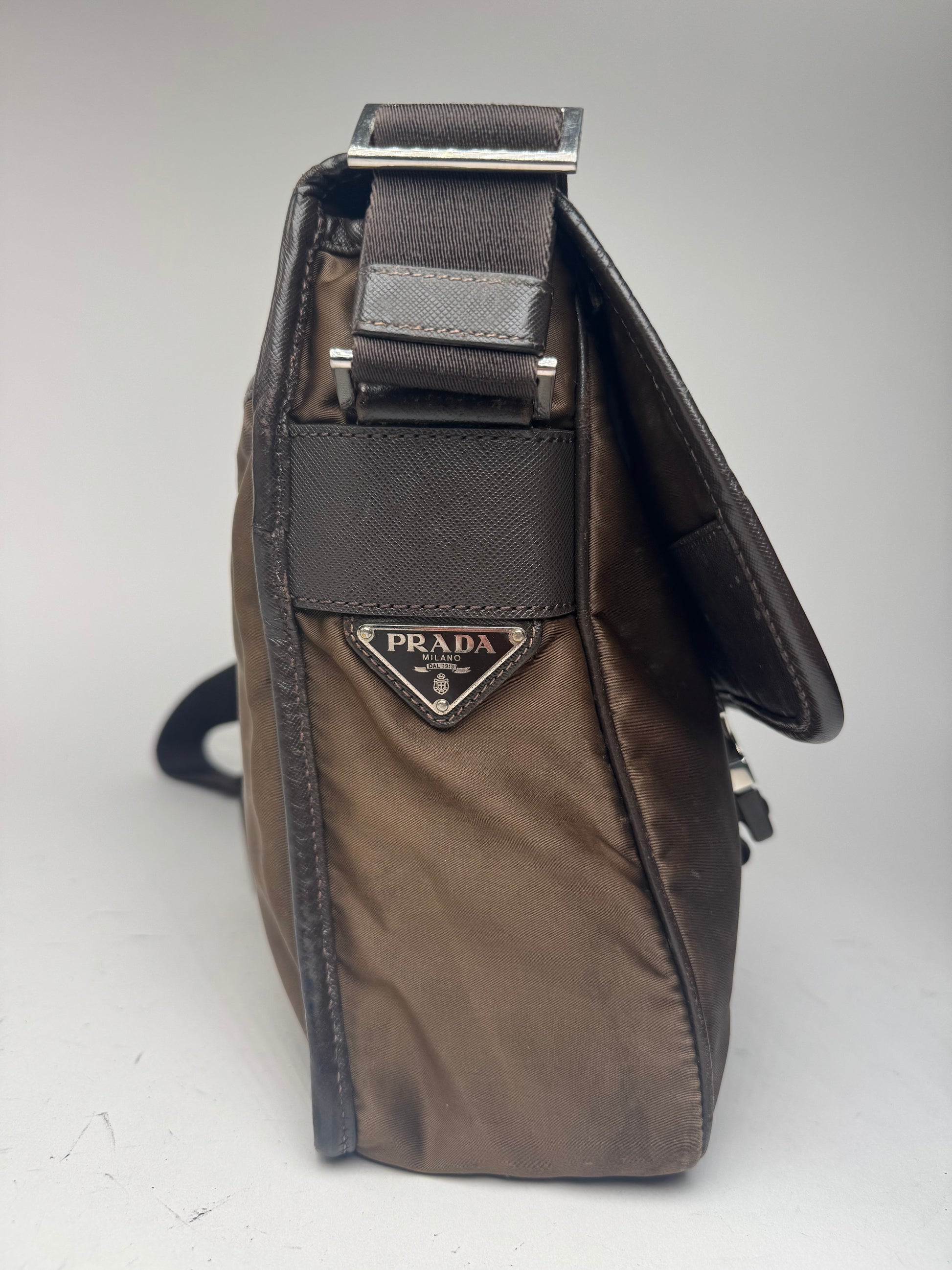 Sac bandoulière vintage PRADA en nylon. Polyvalent et unisexe, ce sac bandoulière est confectionné en polyester marron et arbore le logo « Prada Milano » imprimé sur le devant. Il est doté d'une bandoulière réglable en toile noire ornée du logo Prada ton sur ton, de finitions en acier argenté et d'une fermeture à boucle sur le devant. Les finitions en cuir noir et marron apportent structure et contraste. Un logo triangulaire Prada argenté est apposé sur le côté. Ce modèle, introduit en 1913 et inspiré des plaques métalliques utilisées pour les bagages de luxe, est aujourd'hui un symbole mondial de luxe discret et d'innovation.