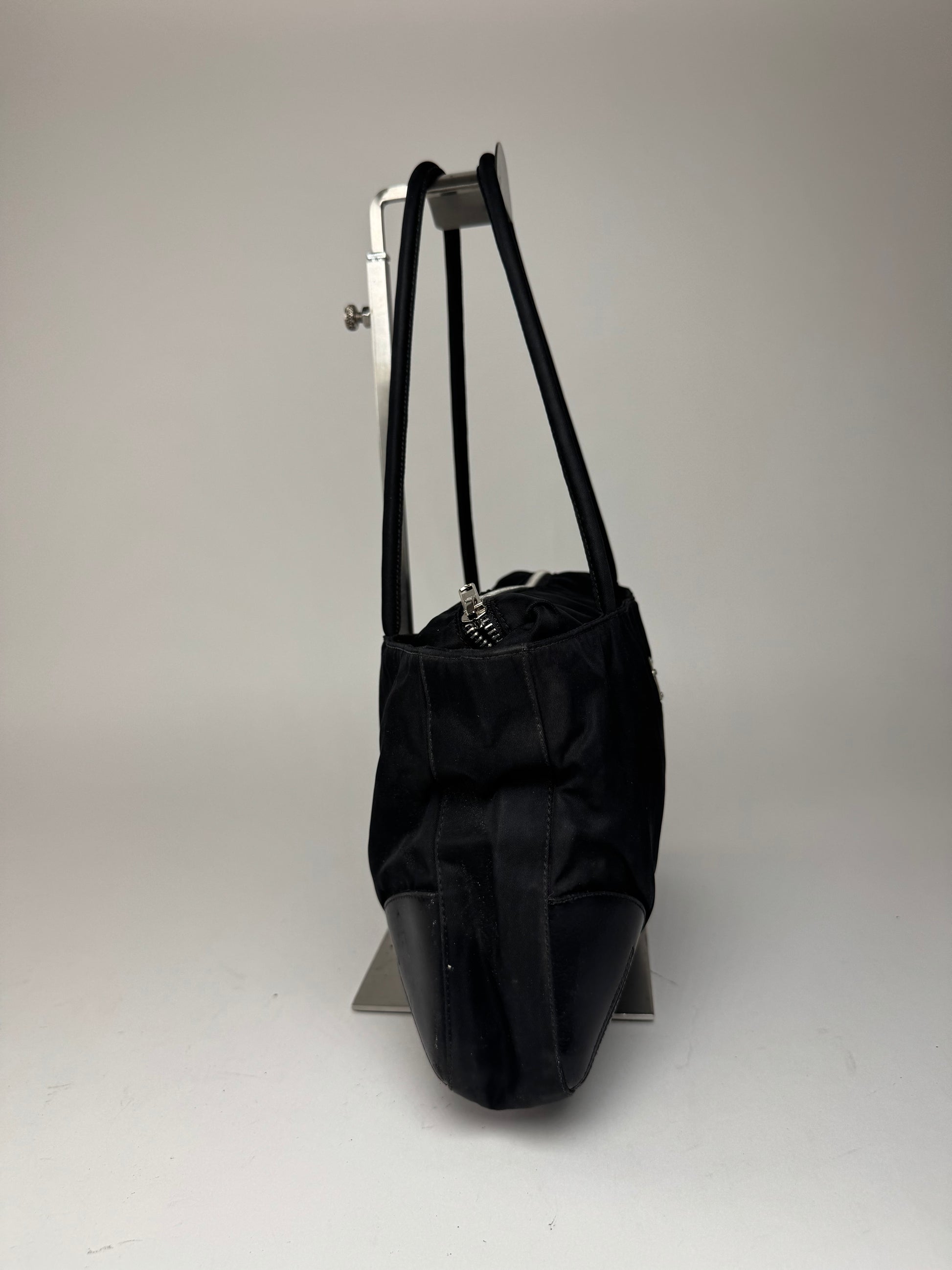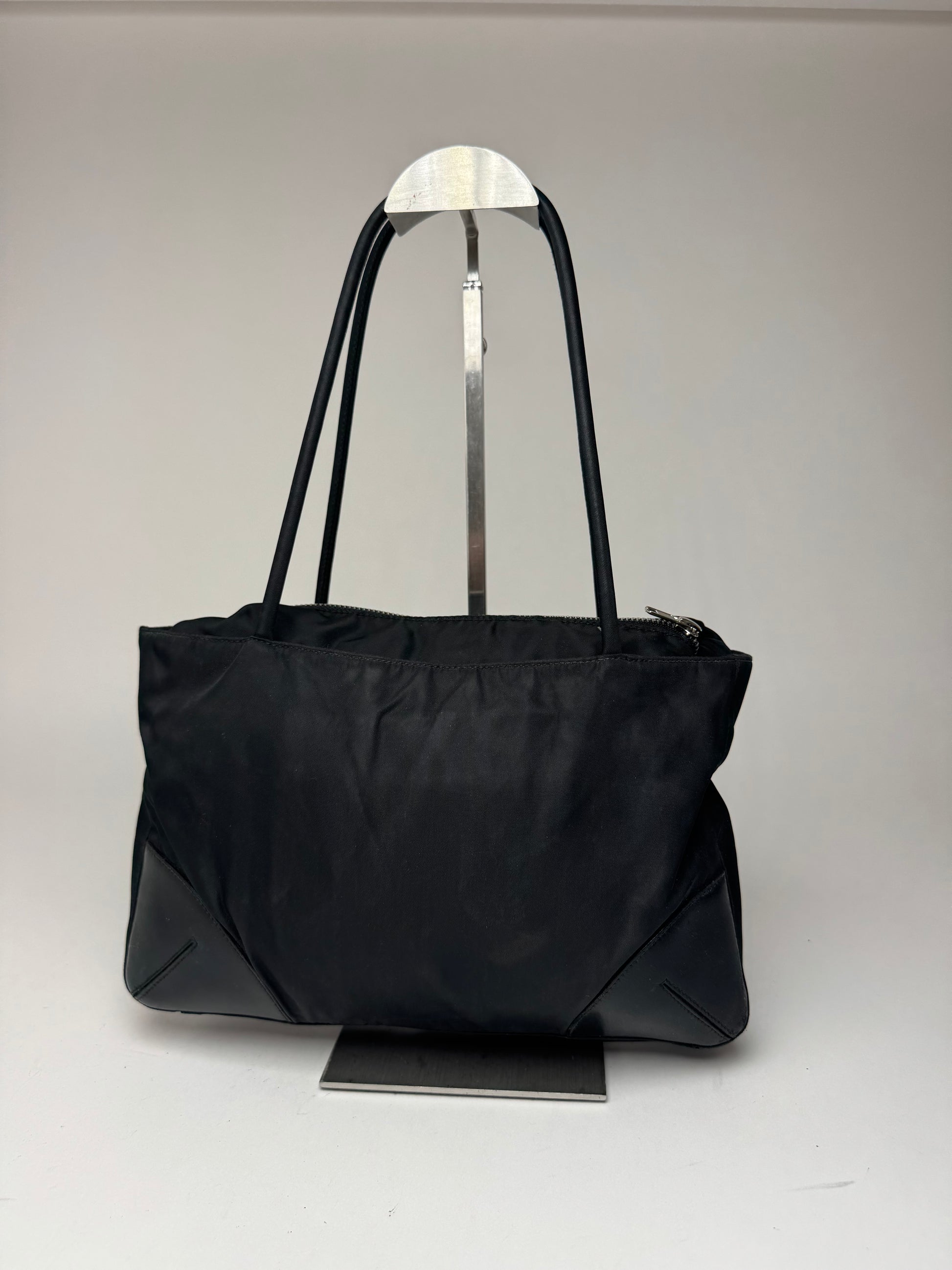 Ce sac à main vintage chic est finement confectionné en polyester noir avec des finitions en cuir noir sur les poignées et les coins. Il est fermé par une fermeture éclair sur le dessus, qui a été remplacée. L'intérieur est doublé en polyester noir orné du monogramme Prada.