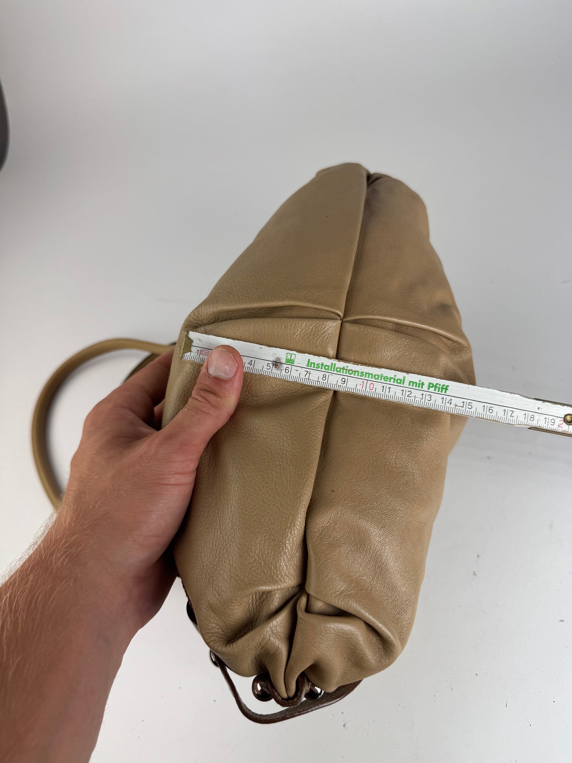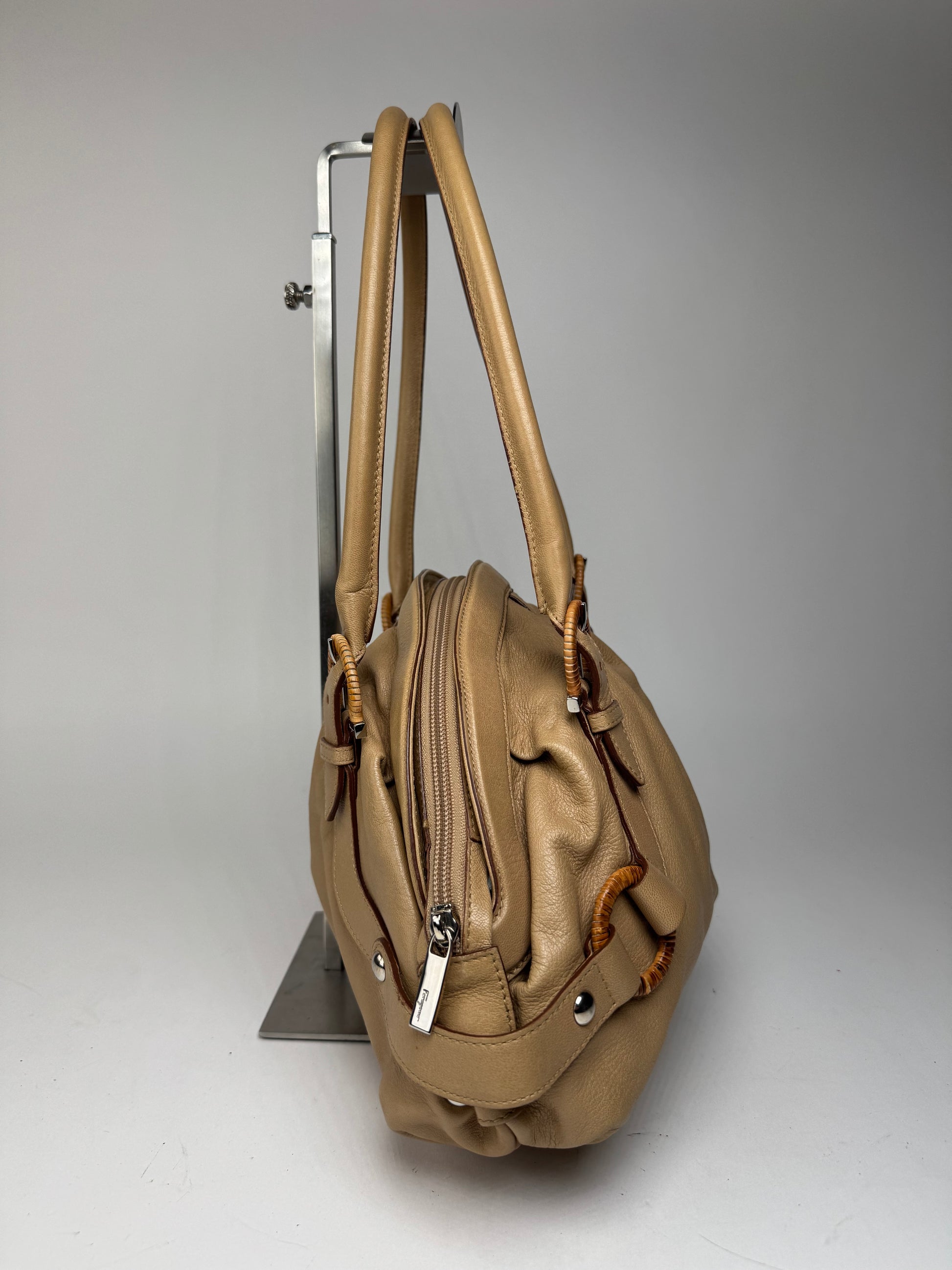 Sac bandoulière en cuir SALVATORE FERRAGAMO. Ce sac à main chic est finement confectionné en cuir beige. Il est doté de deux longues poignées supérieures avec finitions en acier argenté et du logo emblématique Ferragamo, ce qui le rend idéal pour un porté épaule. Il est doté d'une fermeture zippée sur le dessus. L'intérieur est doublé de toile marron.