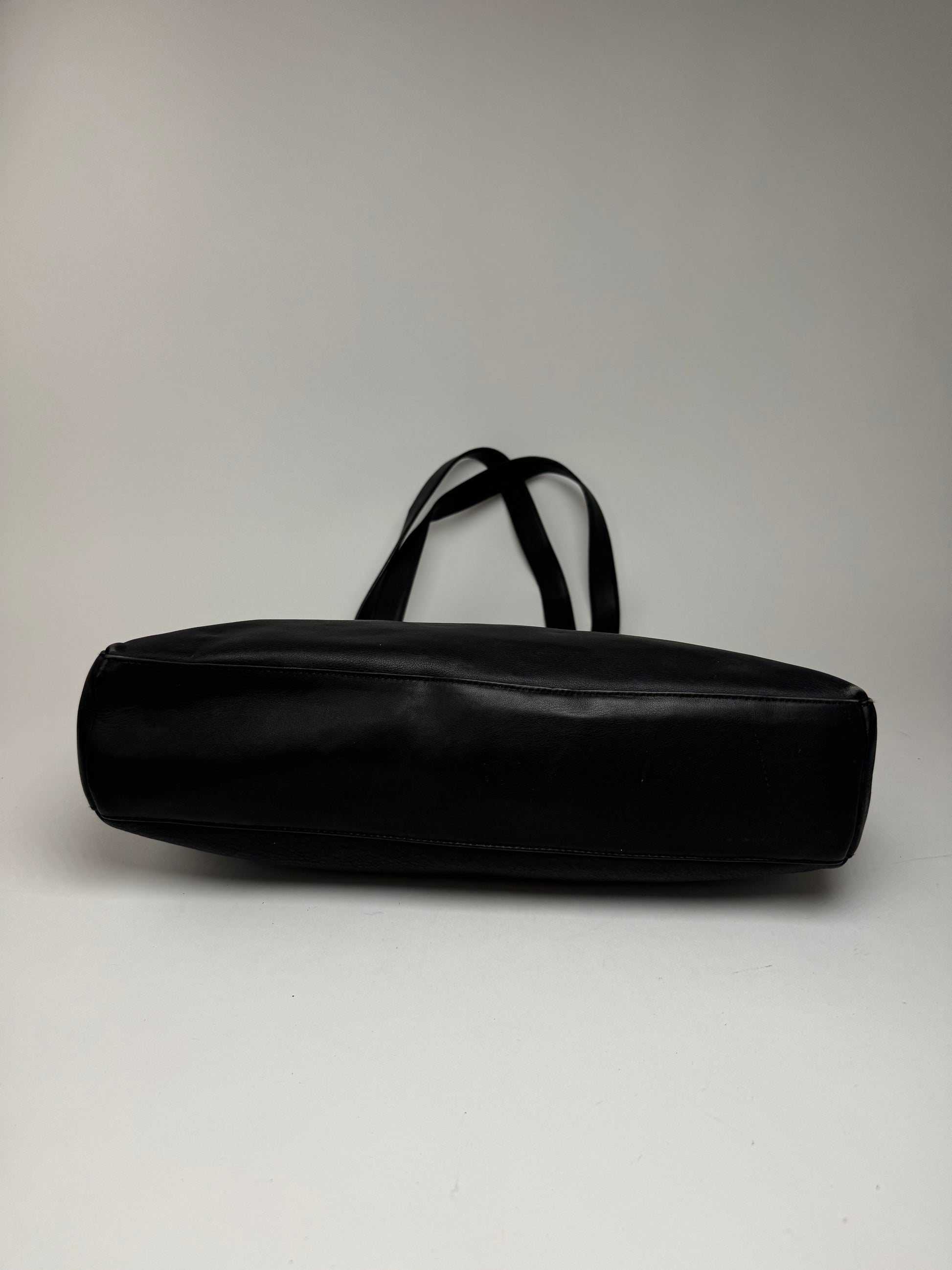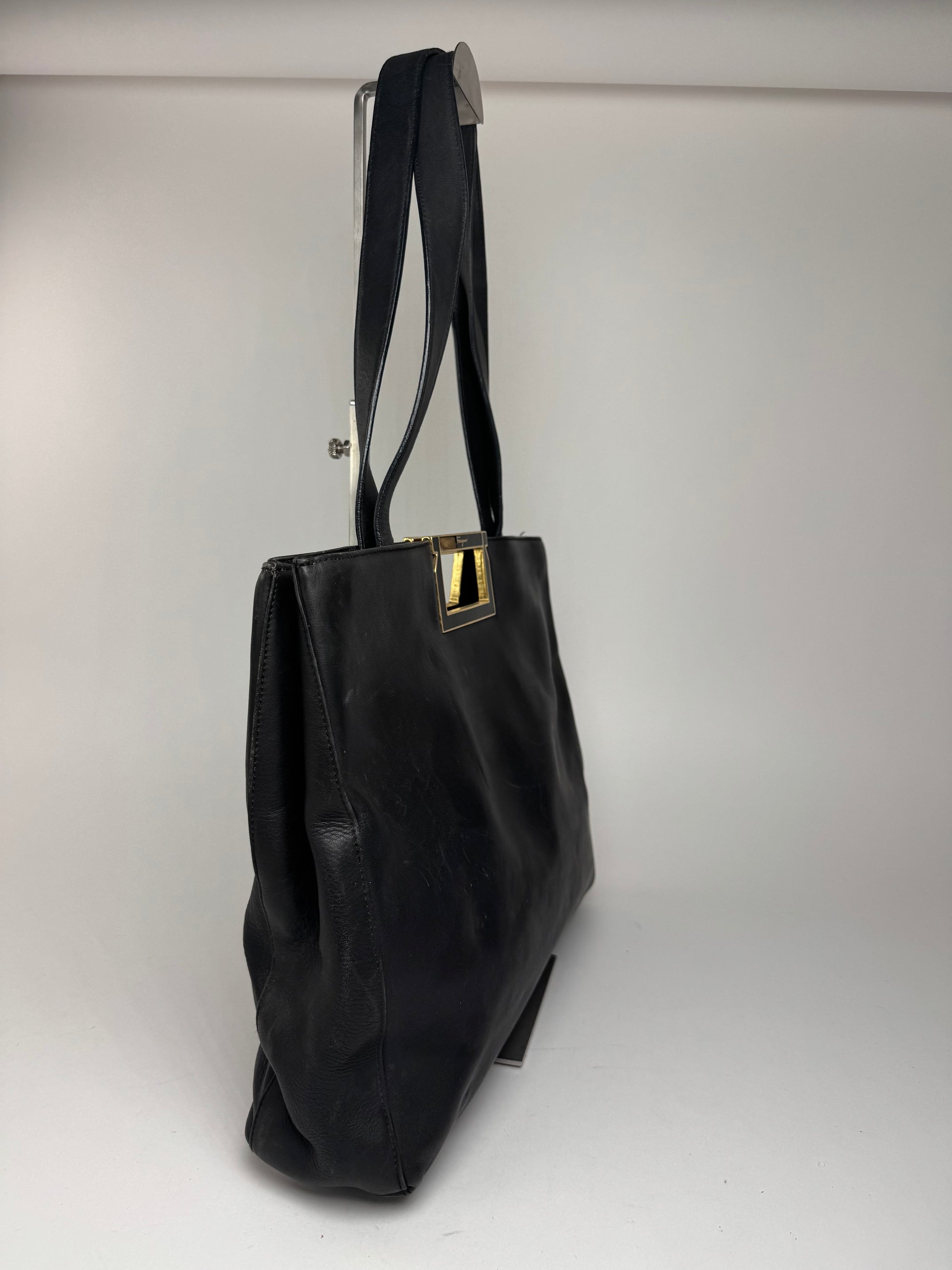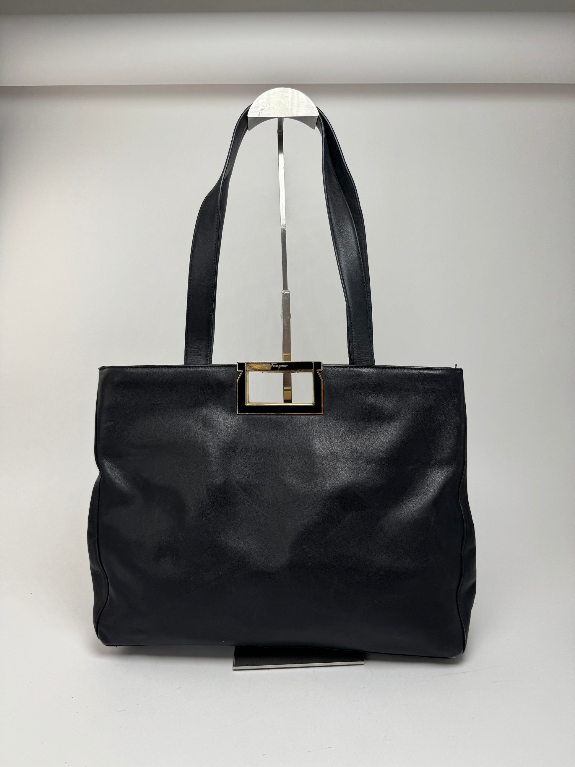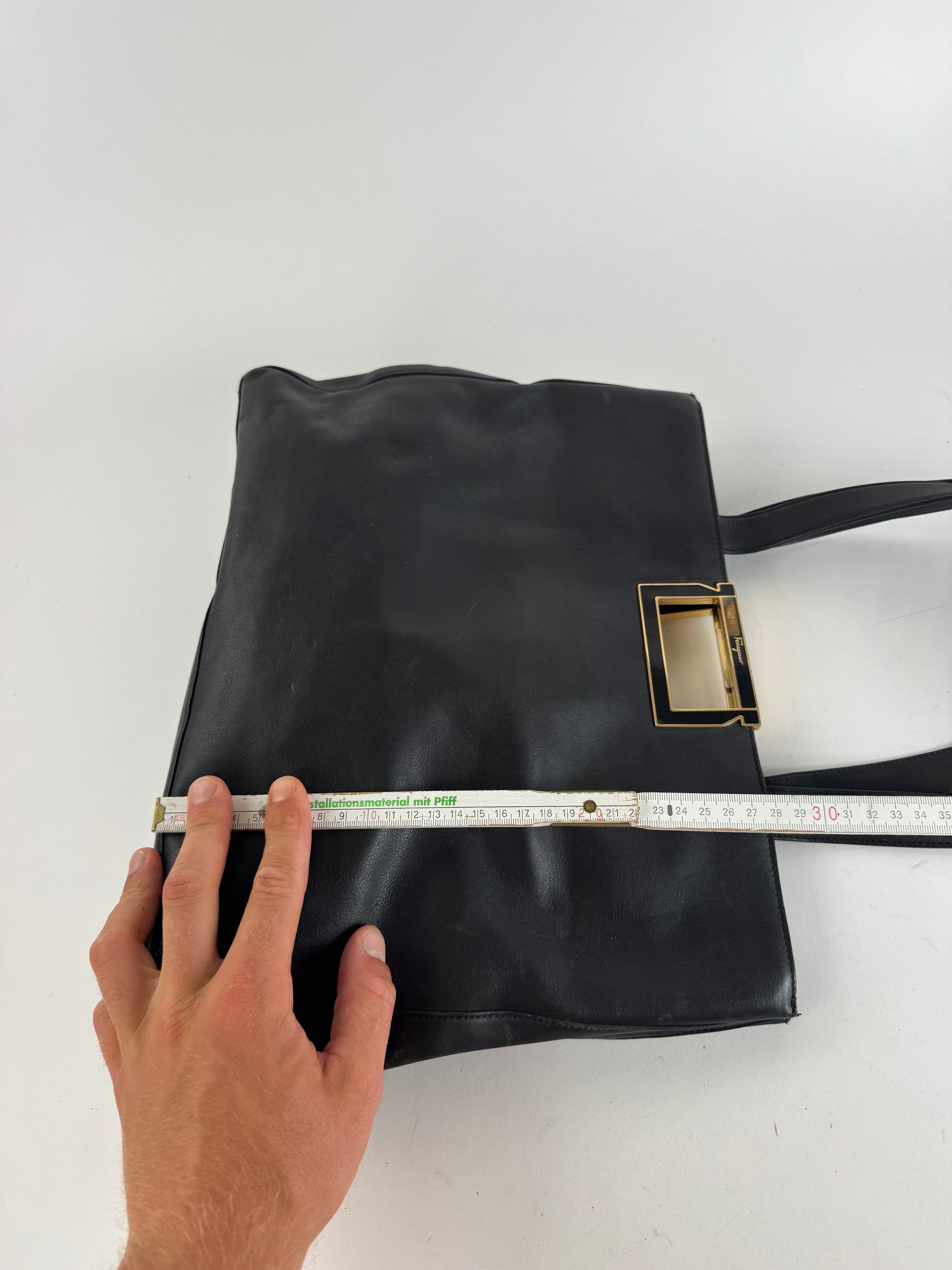 Sac bandoulière vintage SALVATORE FERRAGAMO en cuir noir. Cet élégant sac à main vintage est confectionné en cuir noir lisse et doté de finitions en acier doré. Doté d'un rabat et de deux longues anses, il est confortable à porter à l'épaule. L'intérieur est doublé de toile noire ornée du monogramme Ferragamo. Fabriqué en Italie, ce modèle intemporel porte le numéro de série BC218238 et date probablement des années 1990.
