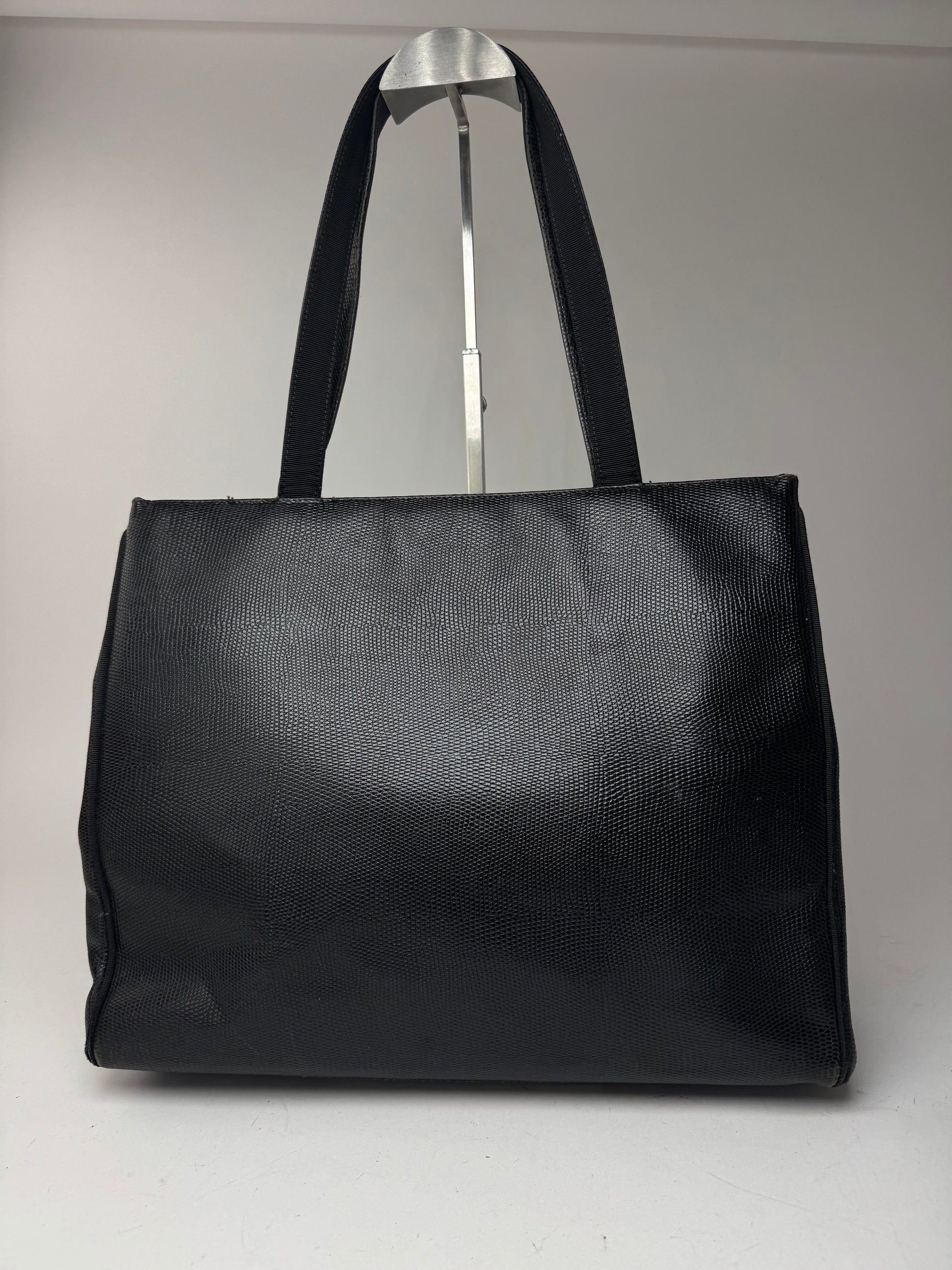Sac cabas SALVATORE FERRAGAMO vintage en cuir noir et imprimé serpent. Cet élégant sac à main est finement confectionné en cuir noir lisse avec des touches d'imprimé serpent. Il est doté de deux longues anses en cuir assorti, d'un fermoir en acier doré et d'une double fermeture magnétique. Le dessus s'ouvre sur un spacieux intérieur en polyester noir orné du monogramme Ferragamo.