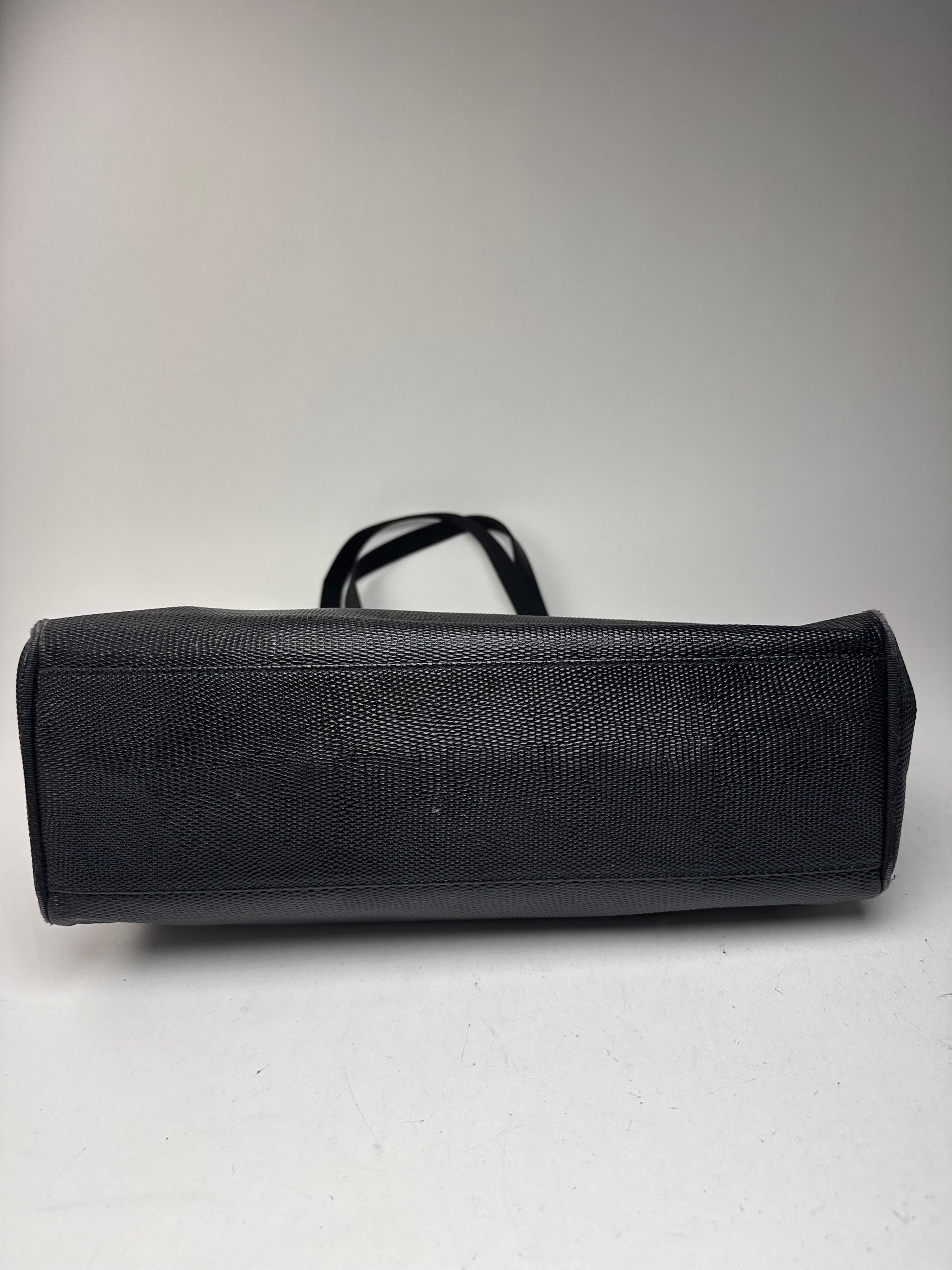 État : L'extérieur en cuir gaufré présente de légères rayures et de légères taches. Les longues poignées sont intactes et bien conservées. La quincaillerie argentée conserve son éclat, avec une légère usure superficielle. La doublure intérieure est propre et en excellent état, avec de légères traces d'utilisation.