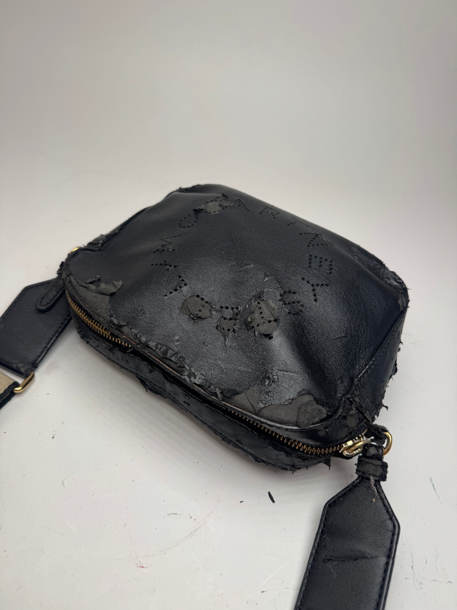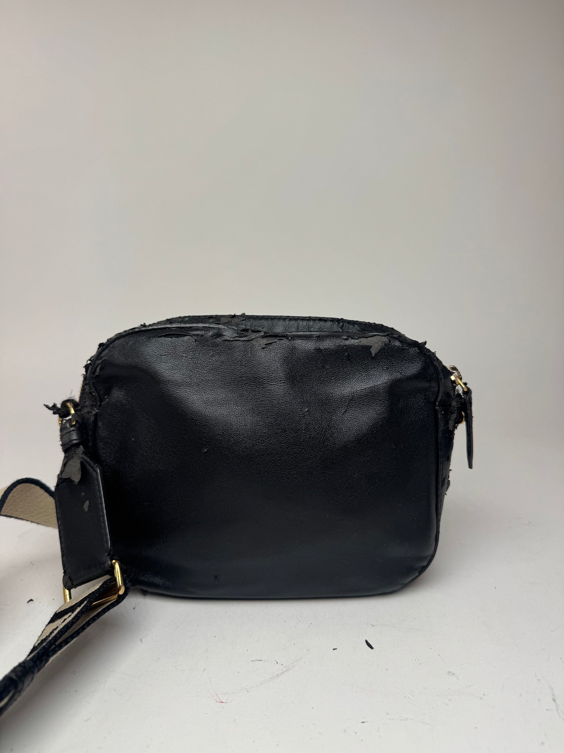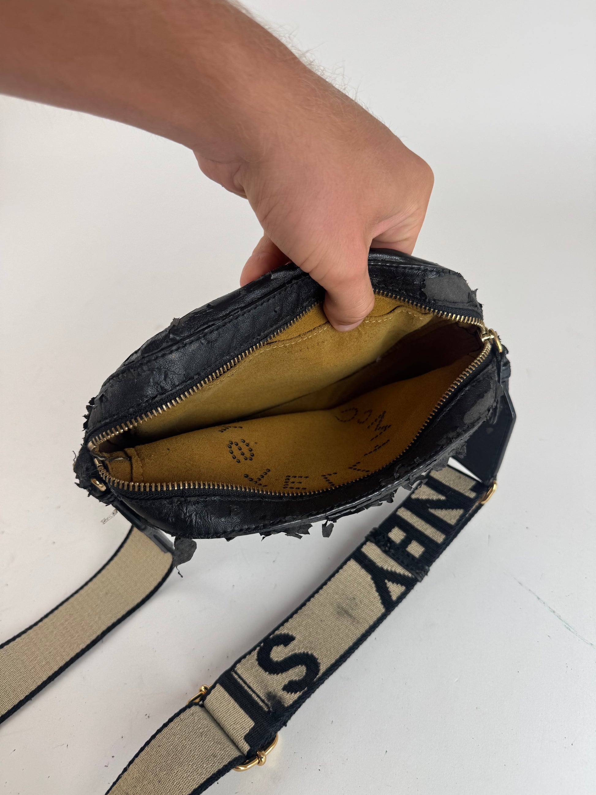 État : L'extérieur en cuir vegan présente une usure importante et des dommages matériels. Le bracelet est intact et présente des traces d'utilisation modérées. Les finitions dorées sont brillantes et présentent des rayures. L'intérieur en daim vegan est propre et en bon état.