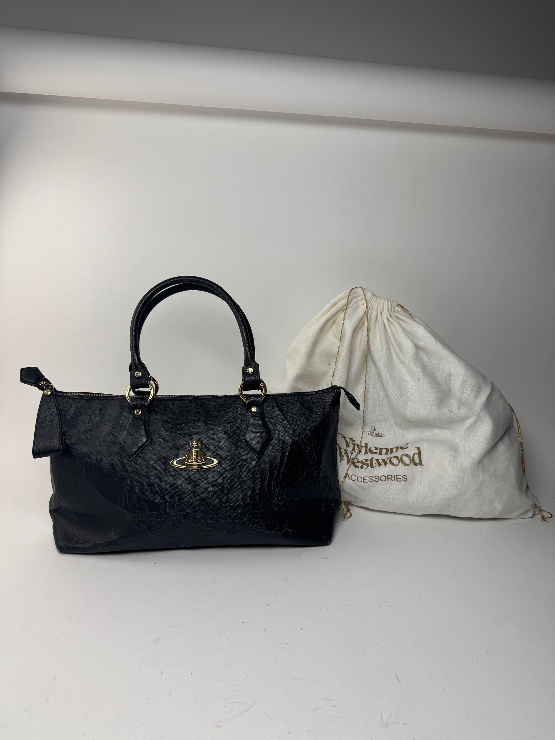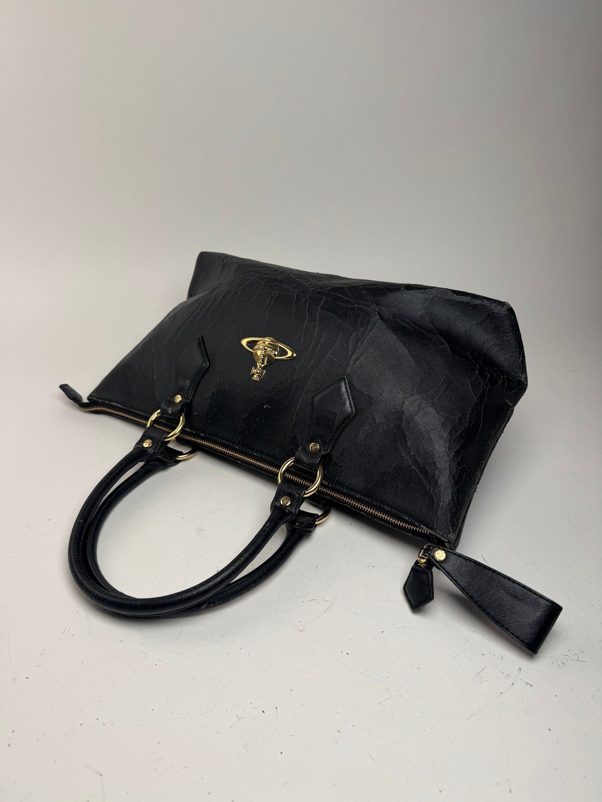 Ce sac à main élégant, finement confectionné en tissu noir, est doté de deux anses supérieures, d'une fermeture zippée et d'un logo Vivienne Westwood Orb en acier doré poli sur le devant. Créé à la fin des années 1980, l'Orb associe la couronne royale britannique aux anneaux de Saturne, symbole de tradition et de vision futuriste, et est depuis devenu l'emblème le plus emblématique de la maison. L'intérieur est doublé de toile rayée noire et blanche.