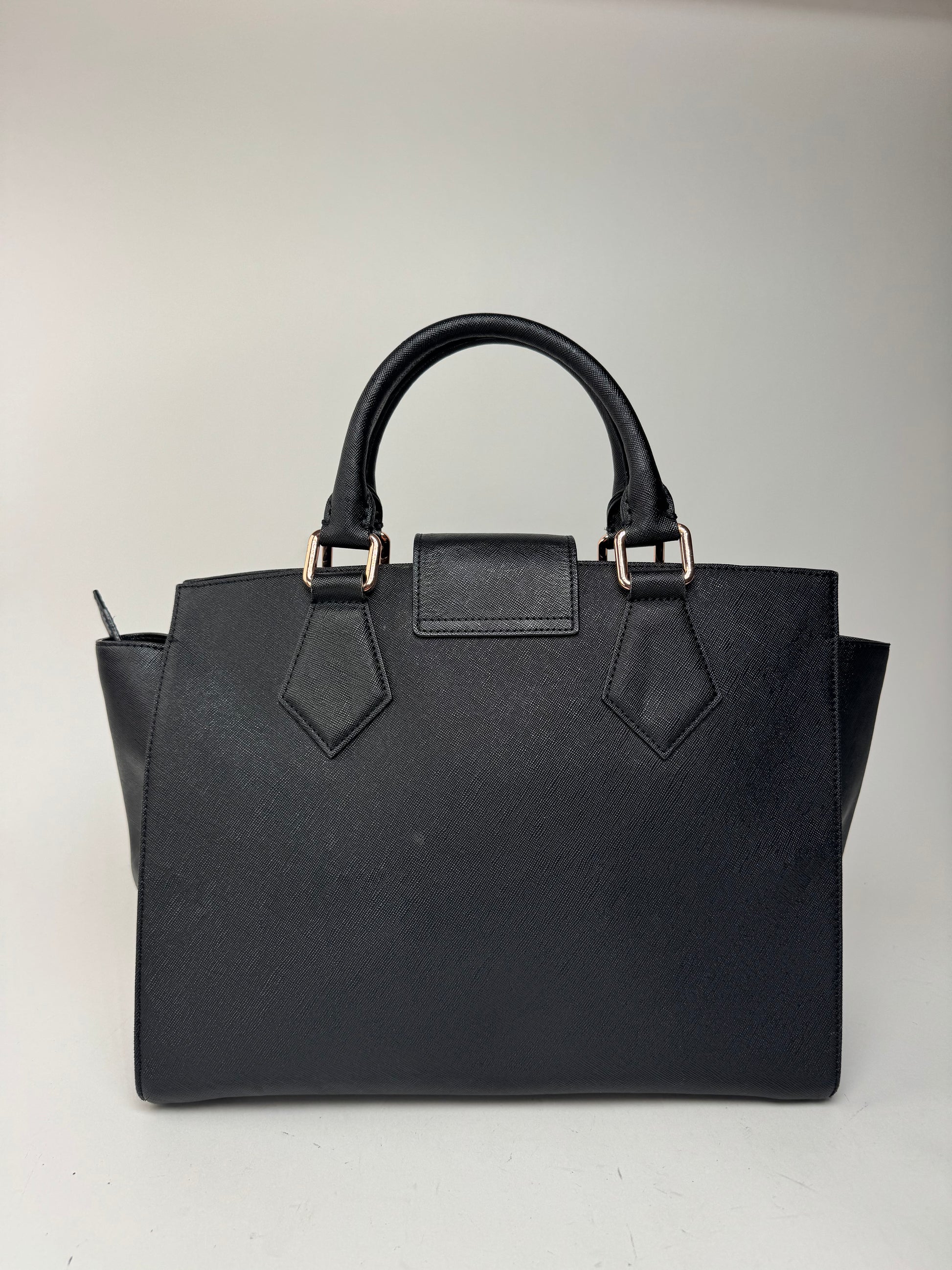 Sac à main en cuir VIVIENNE WESTWOOD avec logo Saturn. Ce sac vintage en cuir noir est doté de deux poignées, d'un rabat zippé et d'accessoires en acier rose. Le rabat est orné du logo Saturn gravé de Vivienne Westwood, symbole introduit dans les années 1980 alliant tradition royale et modernité, reflétant l'esprit rebelle et avant-gardiste de la créatrice. L'intérieur, doublé de polyester rouge à motifs, offre un espace pratique au quotidien. Fabriqué en Italie, ce modèle est livré avec une housse de protection Vivienne Westwood.