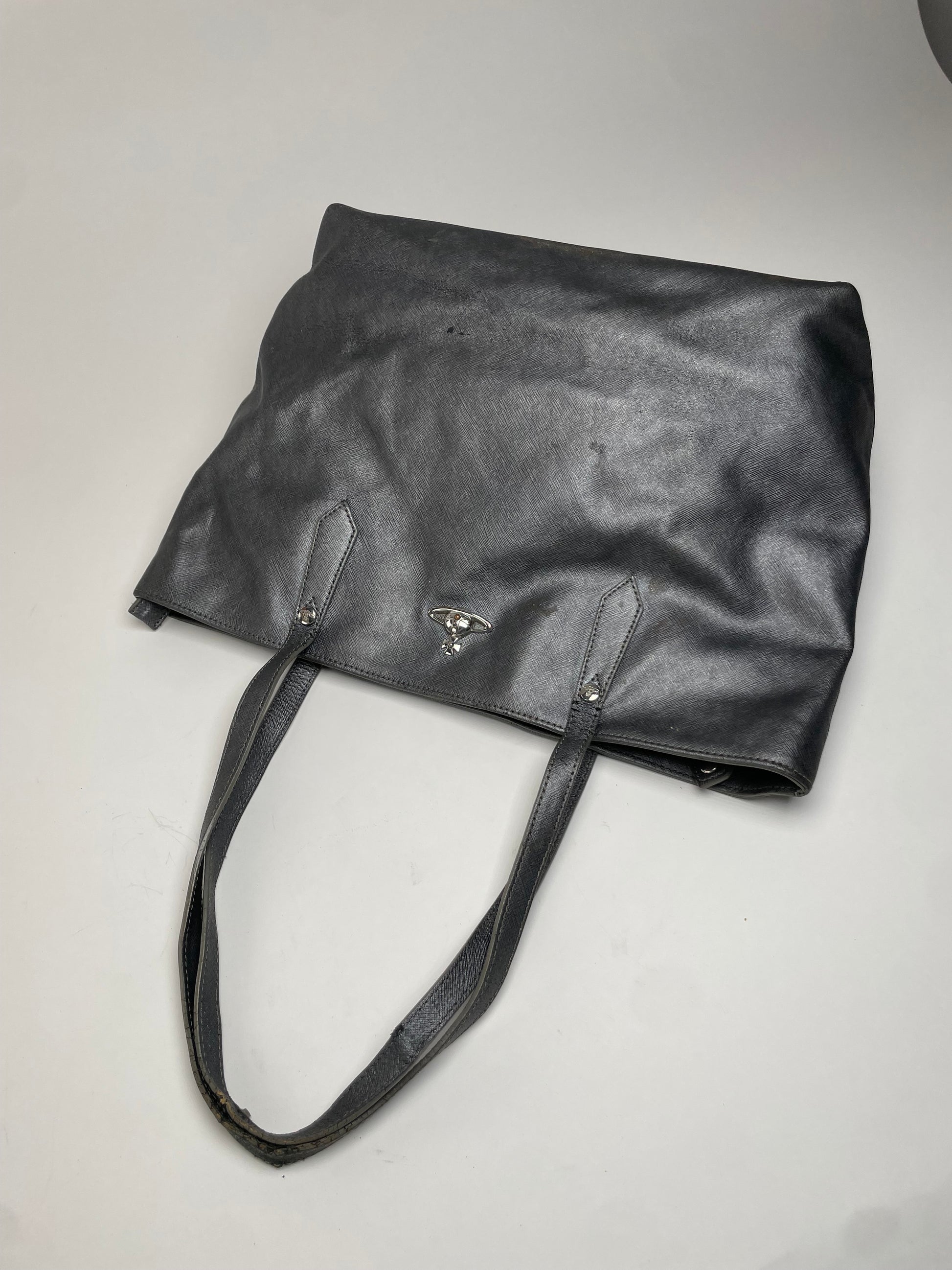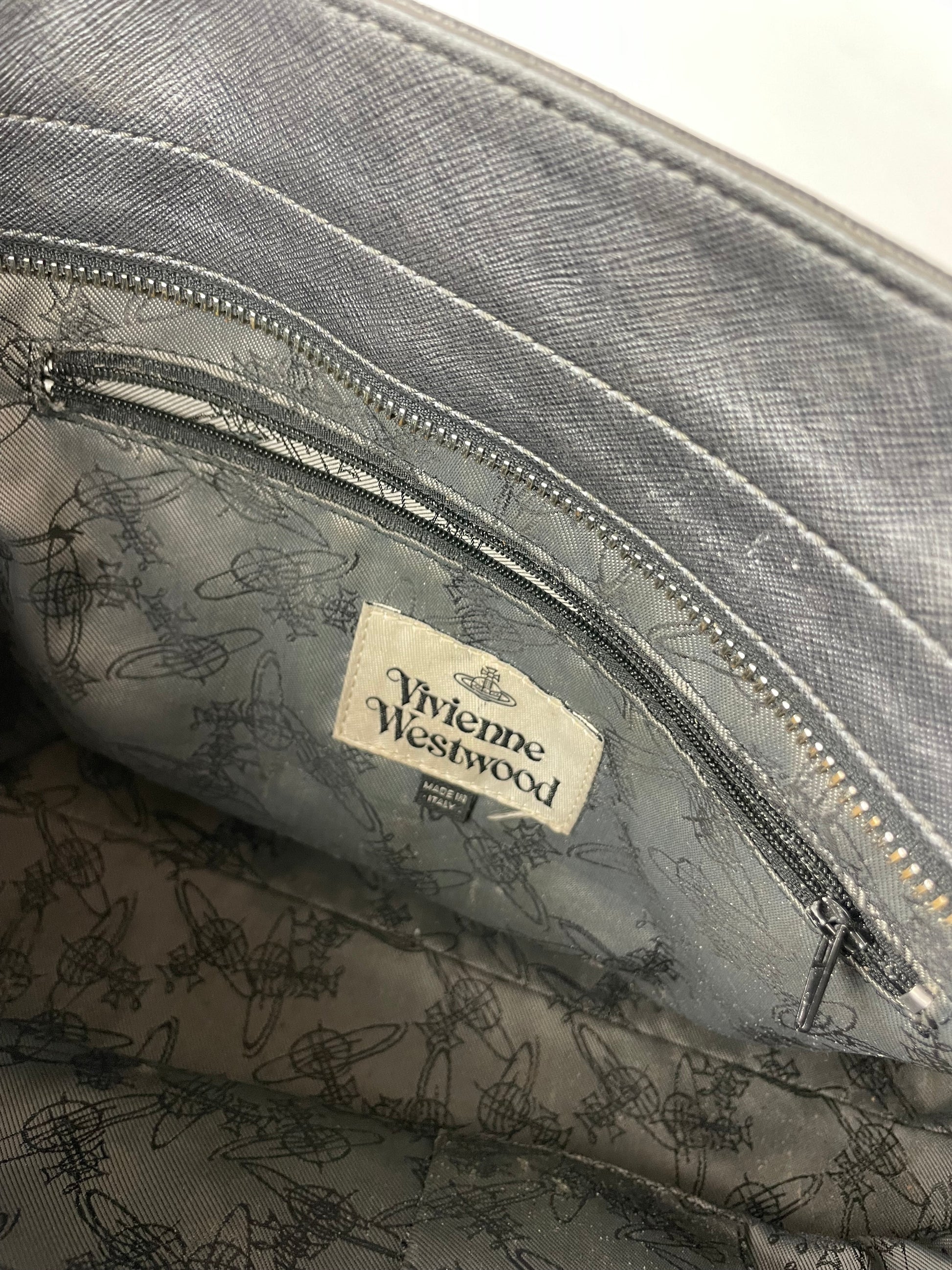 VIVIENNE WESTWOOD Vintage Handbag. This chic handbag is crafted from anthracite-coloured leather and features a silver-tone steel Vivienne Westwood Saturn logo on the front. The long handles allow it to be comfortably worn over the shoulder, and the top closes with a zipper. The interior is lined in grey canvas printed with a black Saturn logo monogram. Made in Italy.