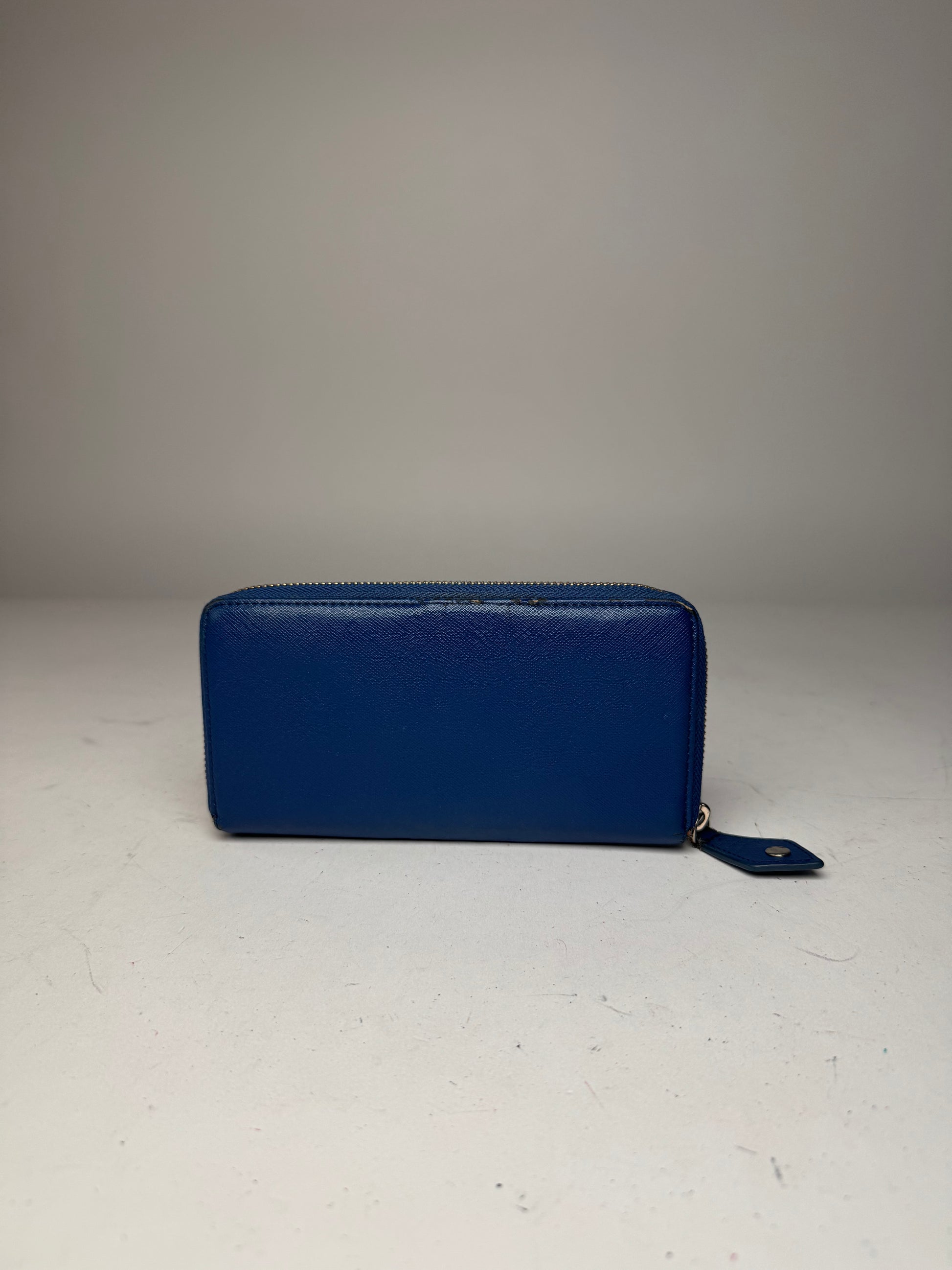 VIVIENNE WESTWOOD Vintage Blue Leather Wallet. This chic wallet is finely crafted of blue leather. The front features the iconic Vivienne Westwood Saturn logo in polished gold steel, and the top secures with a zipper closure. The opening reveals a partitioned white leather interior.