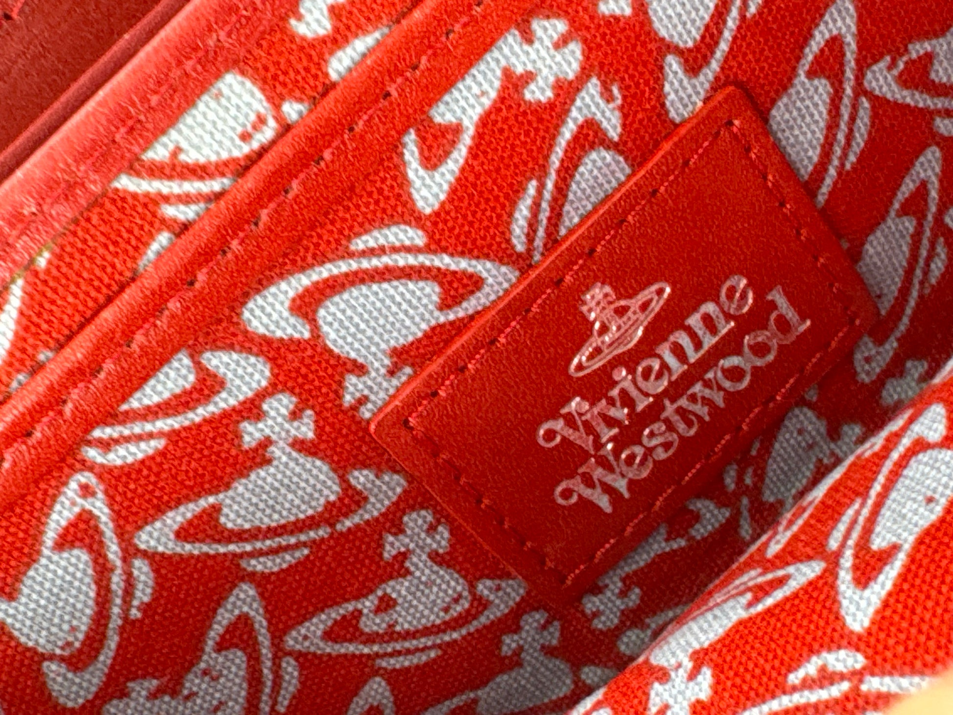 VIVIENNE WESTWOOD Vintage Wallet. This chic wallet is finely crafted of pink-red leather and features the iconic Vivienne Westwood Saturn emblem in silver-tone steel on the lower right front. It has a fold-over closure and opens to a red-white canvas interior printed with the Vivienne Westwood Saturn monogram.