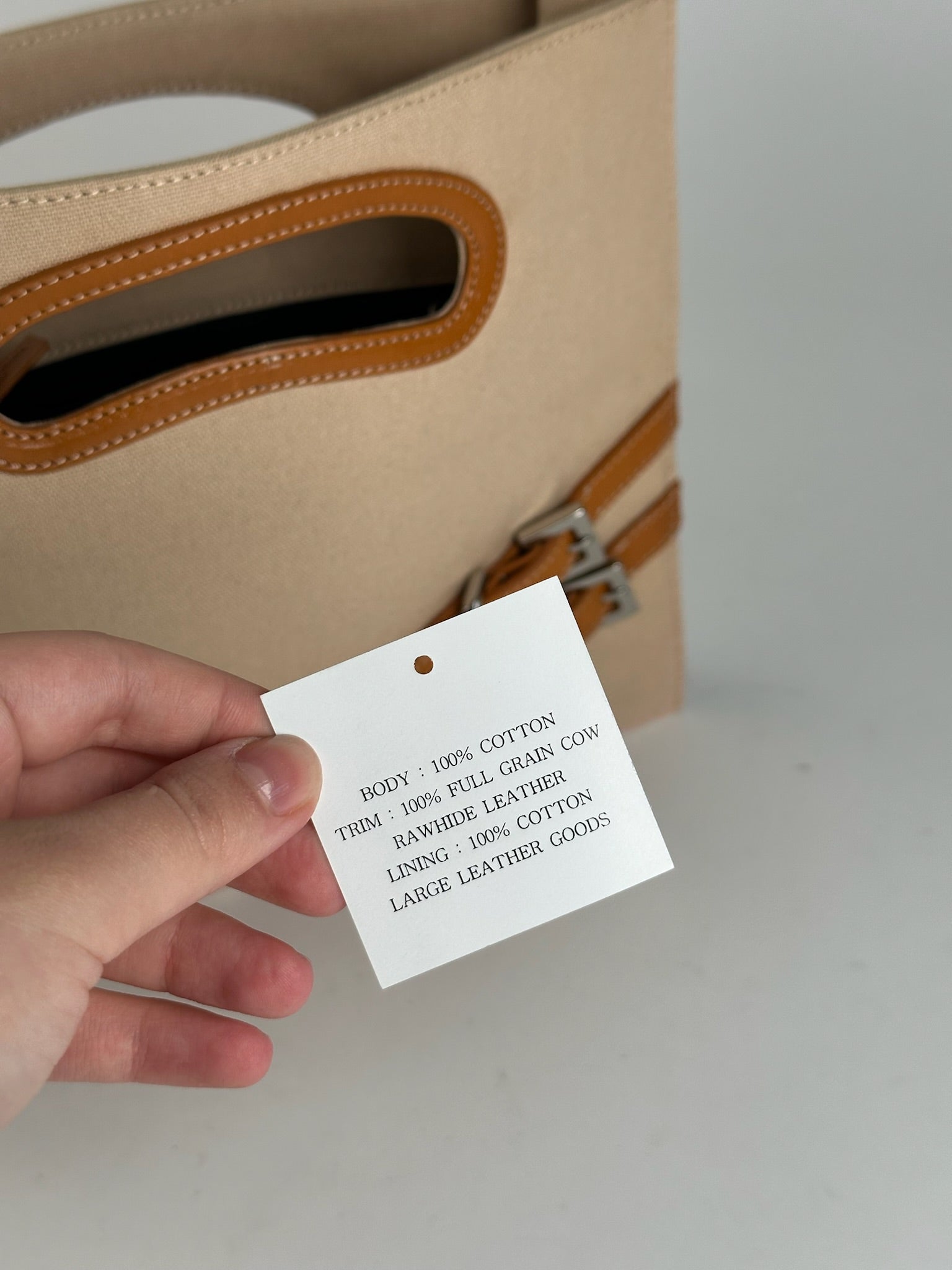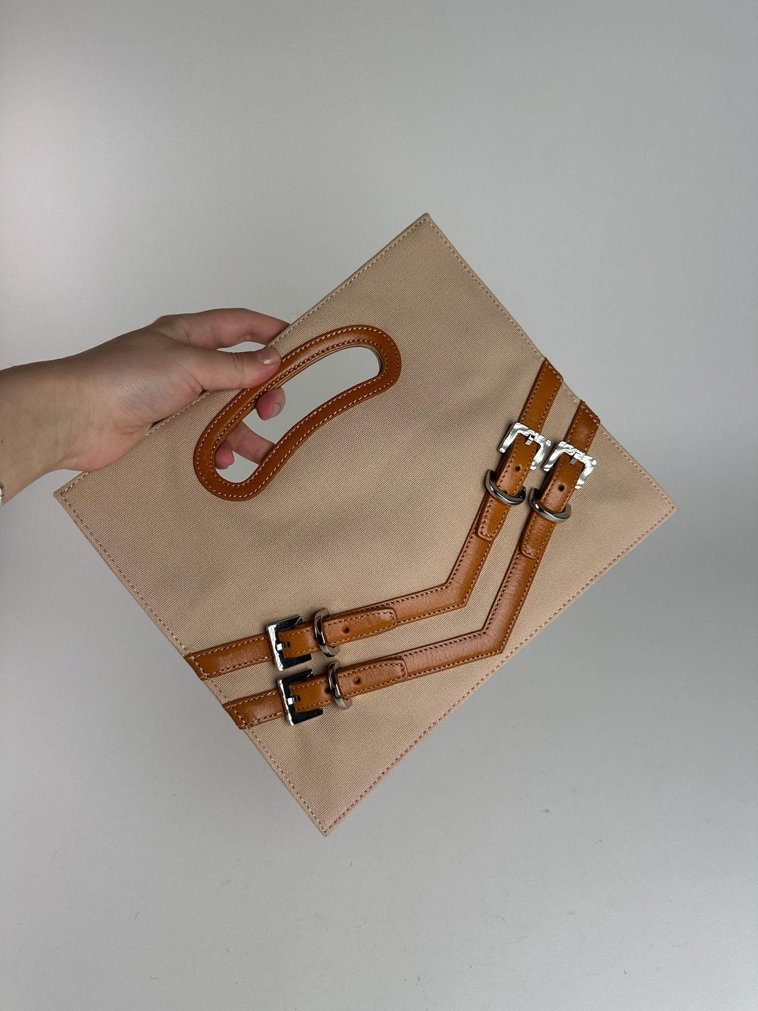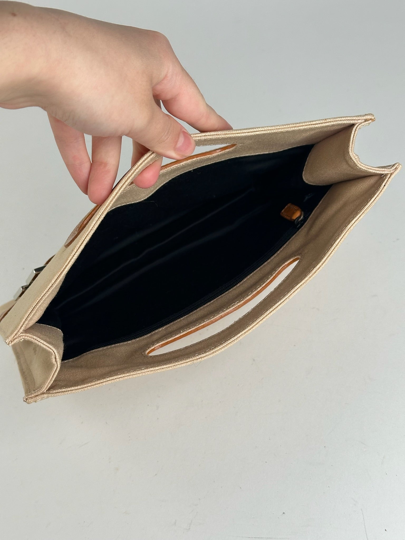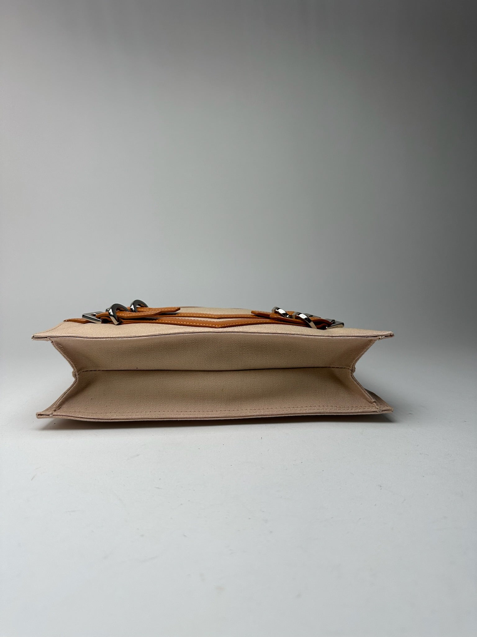 Sac cabas vintage YVES SAINT LAURENT en toile. Ce sac cabas vintage est finement confectionné en toile beige avec des finitions en cuir rouge-brun et des détails en acier argenté. L'intérieur est doublé de toile noire.