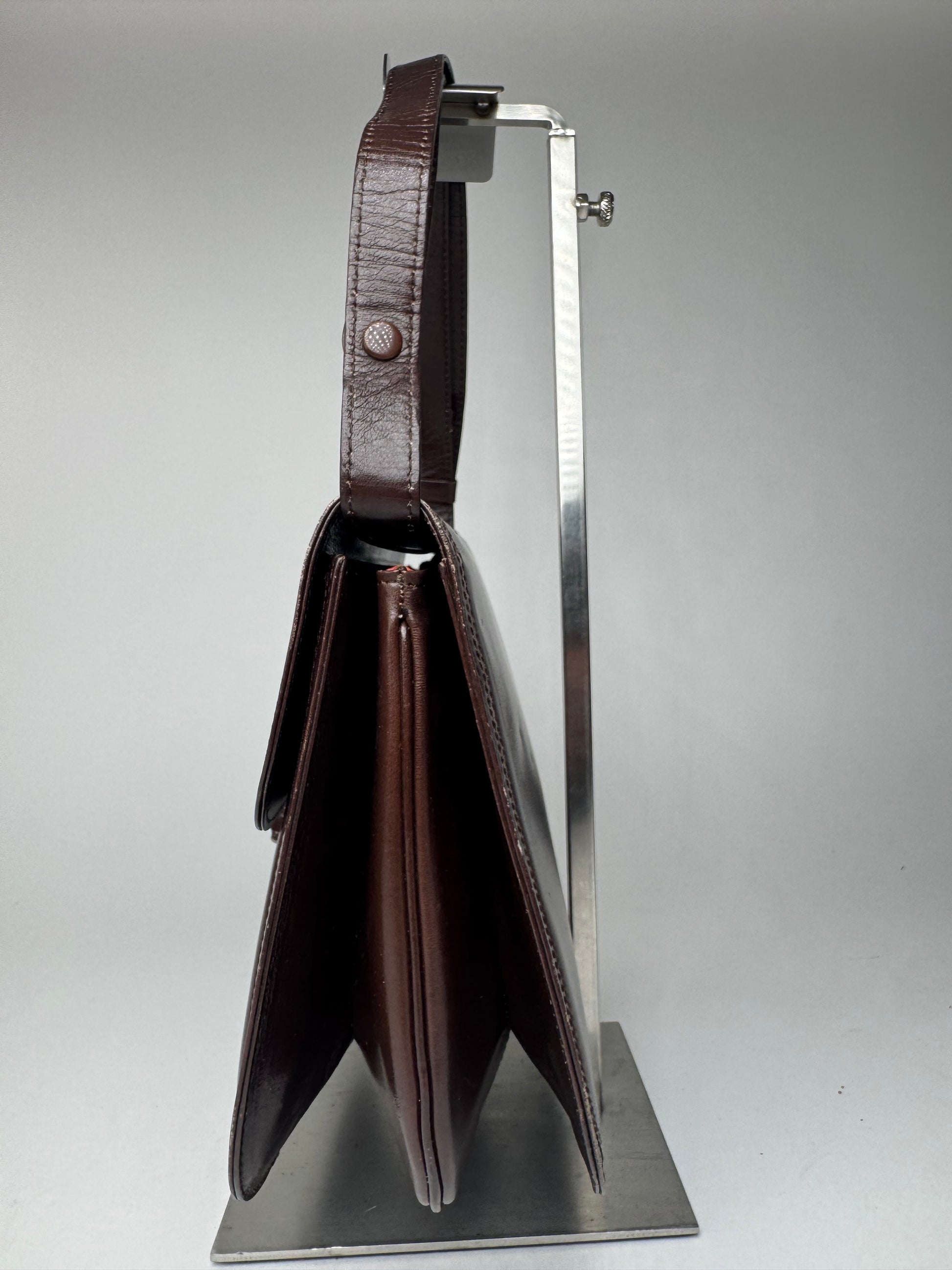 Ce sac à main élégant, finement confectionné en cuir marron, présente un design polyvalent avec une bandoulière réglable permettant de le porter en bandoulière ou à la main. Il se ferme grâce à un élégant fermoir à languette et est orné de détails en acier marron.