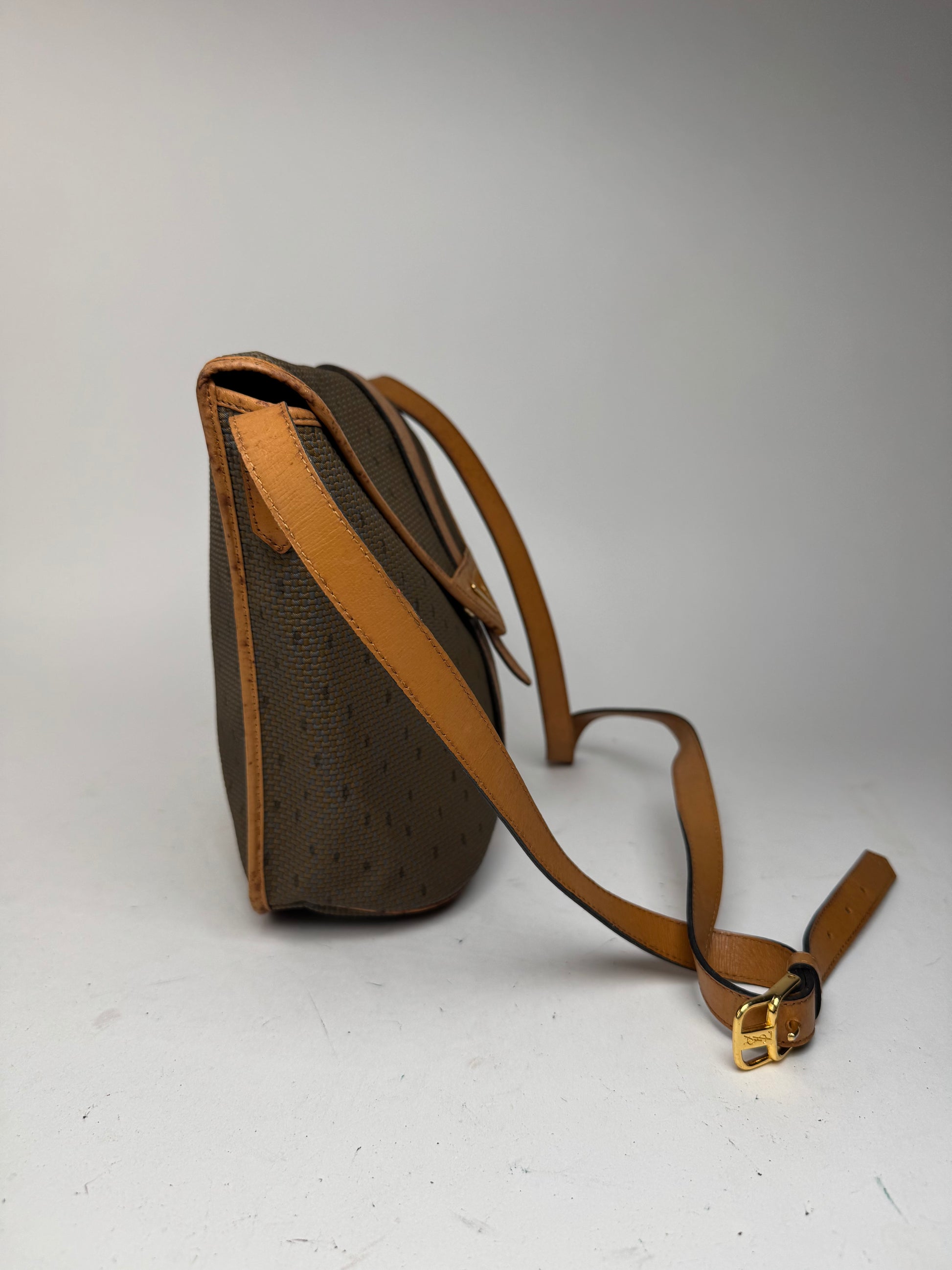 Ce sac bandoulière chic est finement confectionné en toile à pois noire et marron foncé, avec des finitions en cuir marron orangé. Il est doté d'une bandoulière réglable en cuir, d'une plaque logo YSL dorée polie sur le devant et de finitions en acier doré. Il se ferme par un fermoir aimanté et s'ouvre sur un intérieur en toile monogrammée YSL marron et noir.