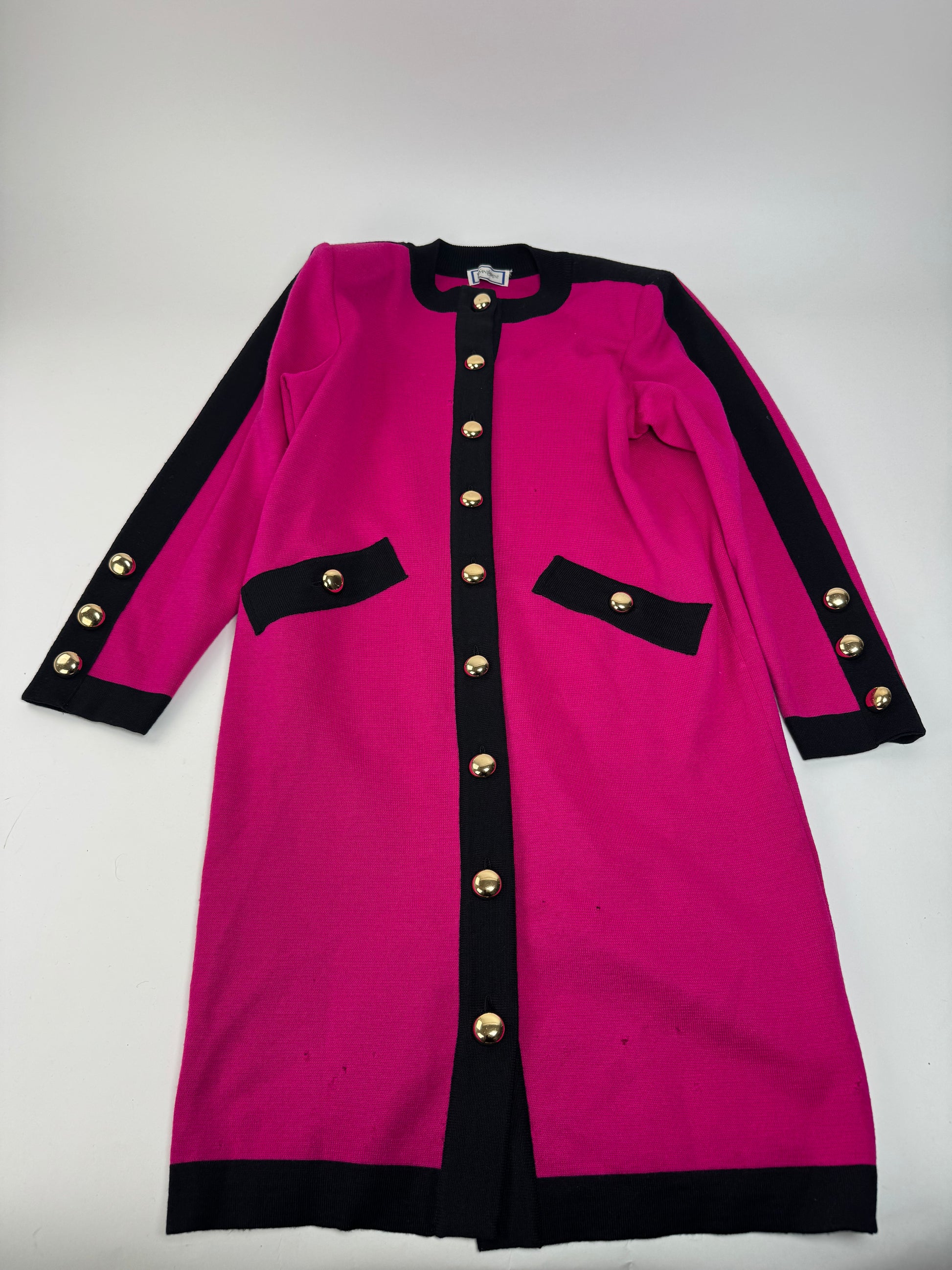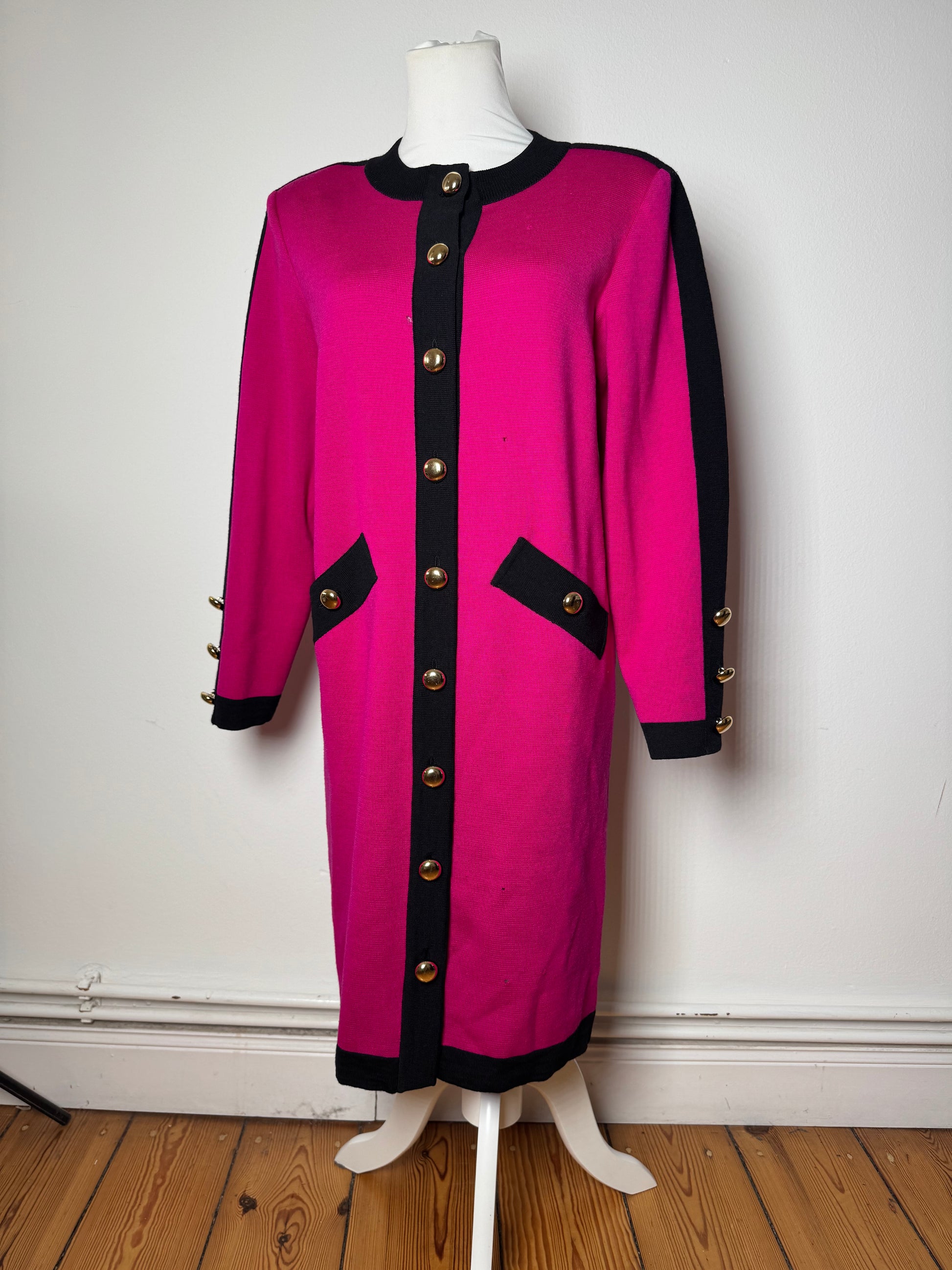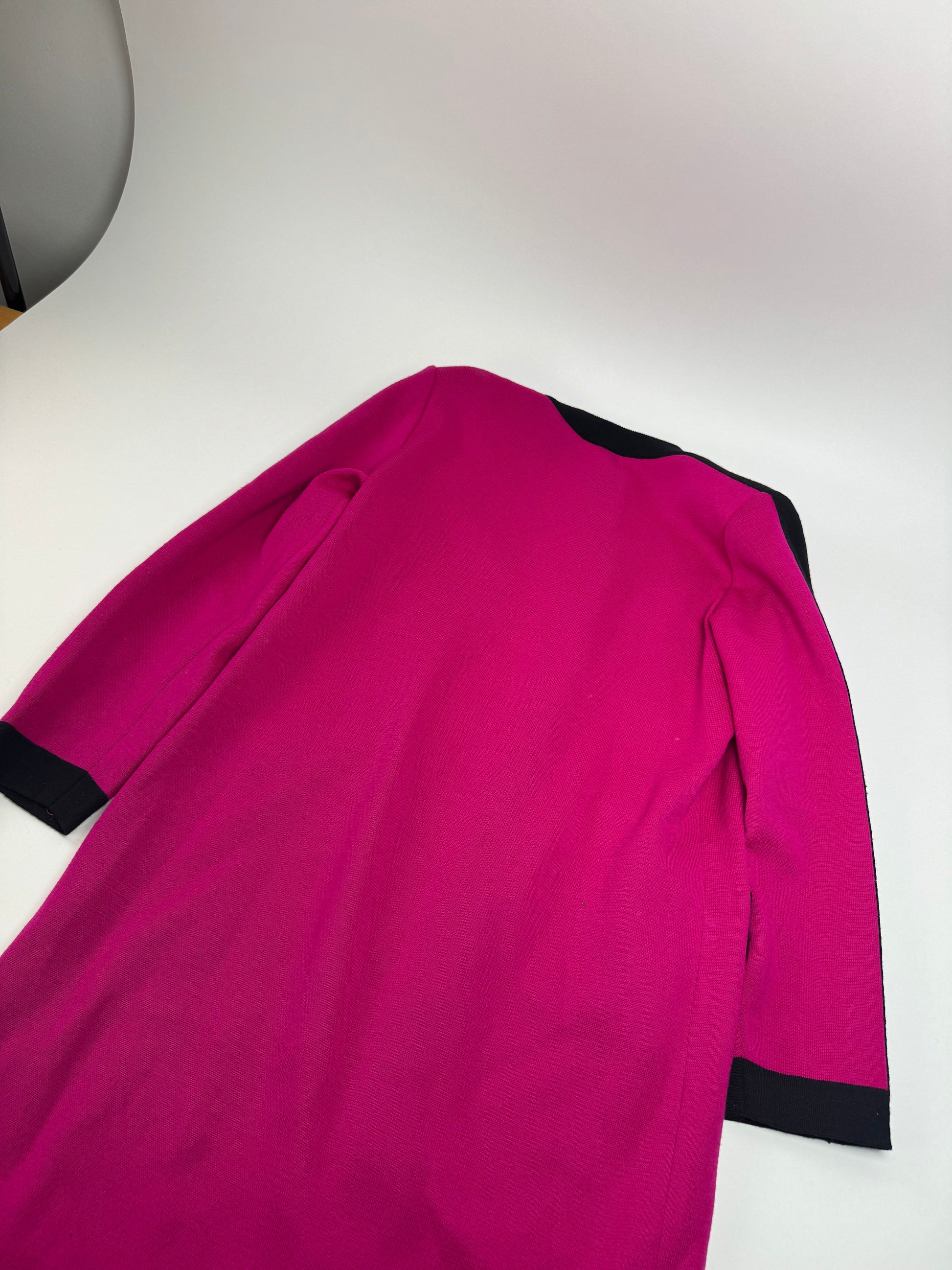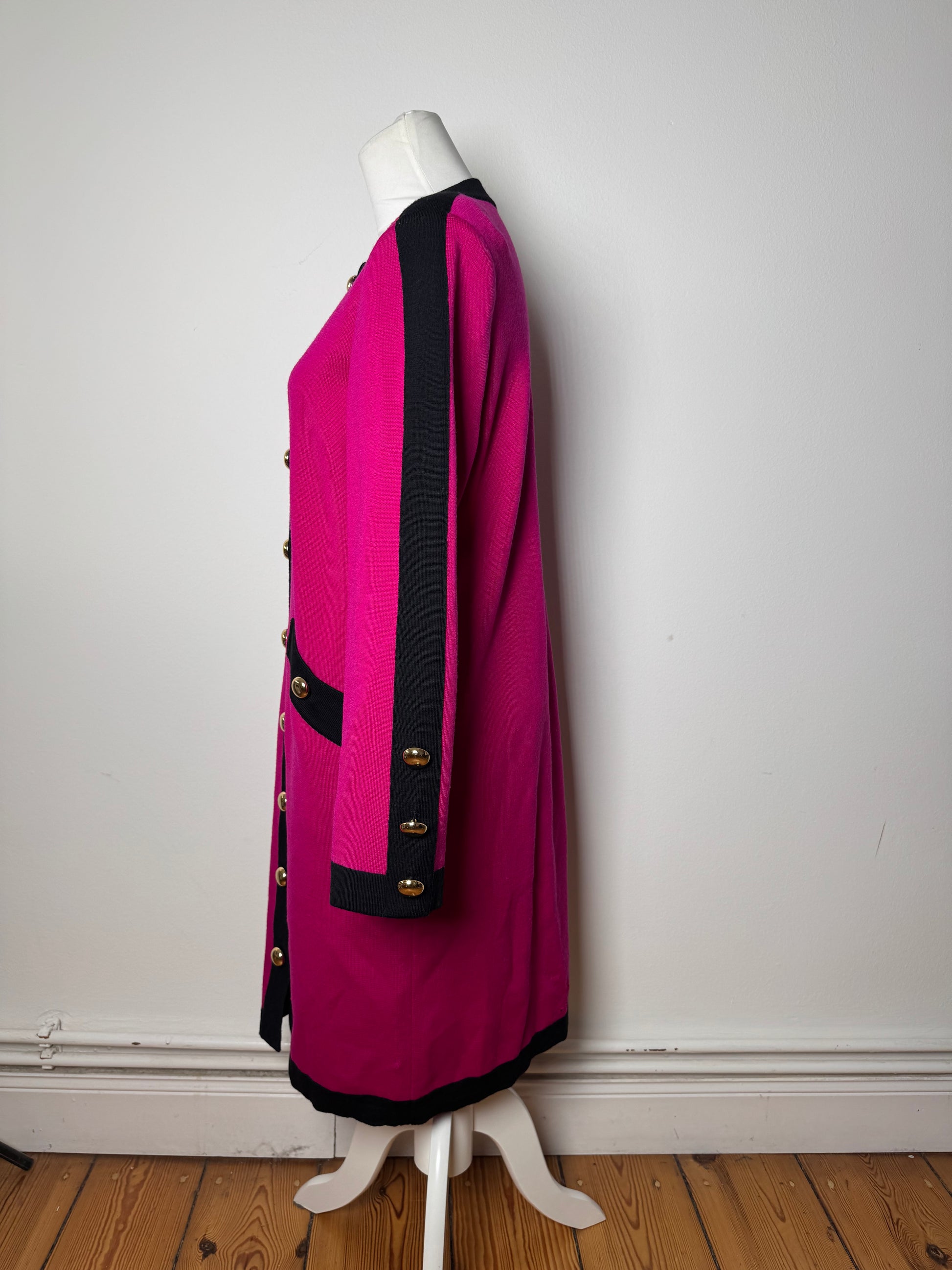 This vintage dress is crafted from cotton in a lilac base colour with black accents and features multiple gold-tone steel buttons. The mannequin shown in the photos is size 38/M.