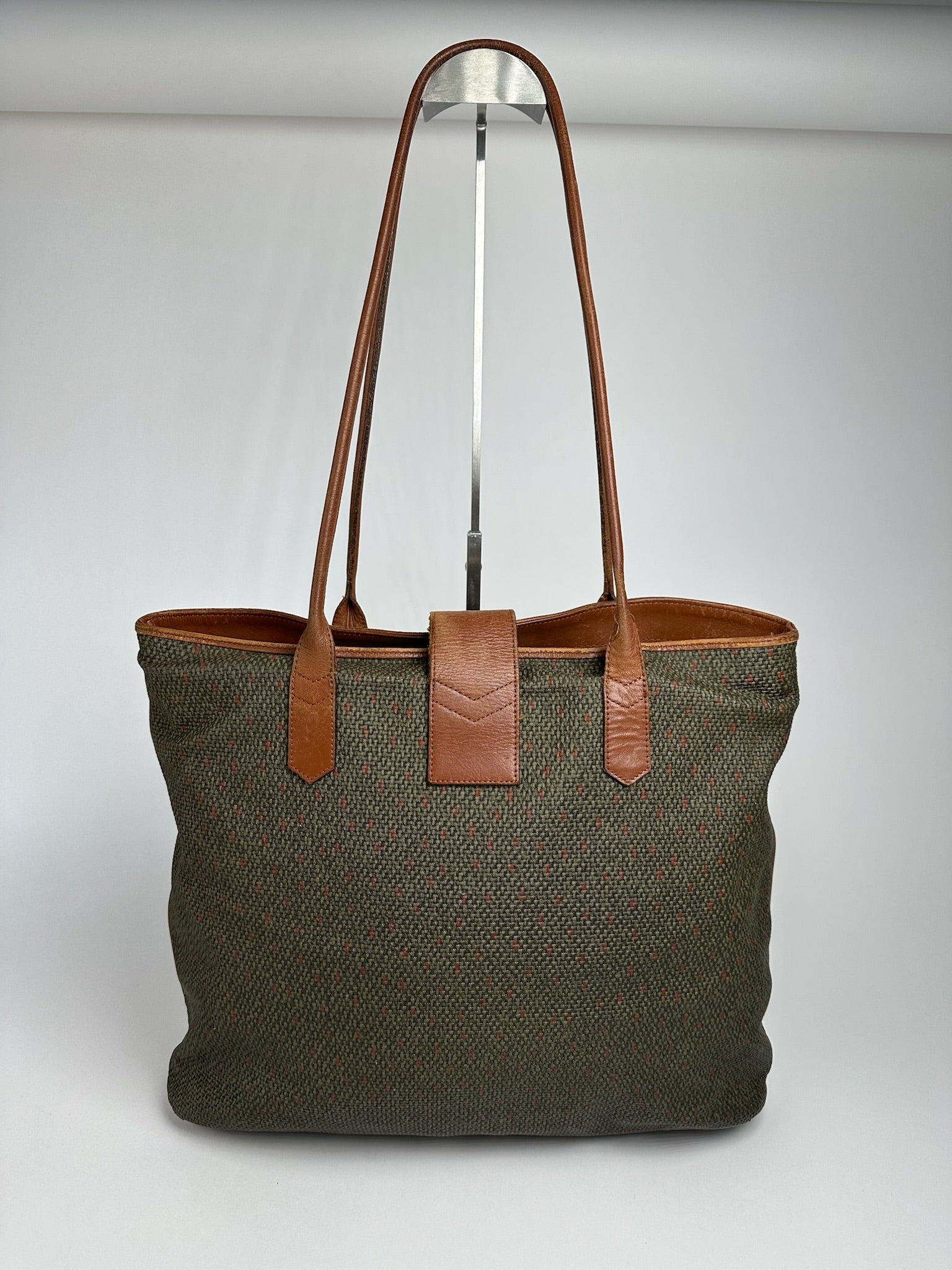 État : La toile extérieure est propre et belle, en très bon état, mais certaines parties du tissu sont collantes et présentent des traces d'usure. Les poignées en cuir sont solides et intactes. La quincaillerie est brillante et présente de légères traces d'usure. La doublure intérieure est en excellent état.