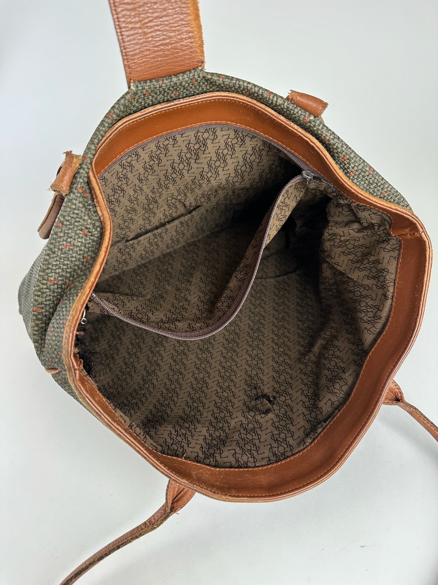 Sac vintage en toile monogrammée YVES SAINT LAURENT. Ce sac à main chic est finement confectionné en toile à motifs vert foncé et marron, avec des finitions en cuir marron. Il est doté de poignées supérieures en cuir, d'accessoires en acier doré et d'un rabat aimanté. Le rabat s'ouvre sur un intérieur spacieux doublé de toile monogrammée noire.