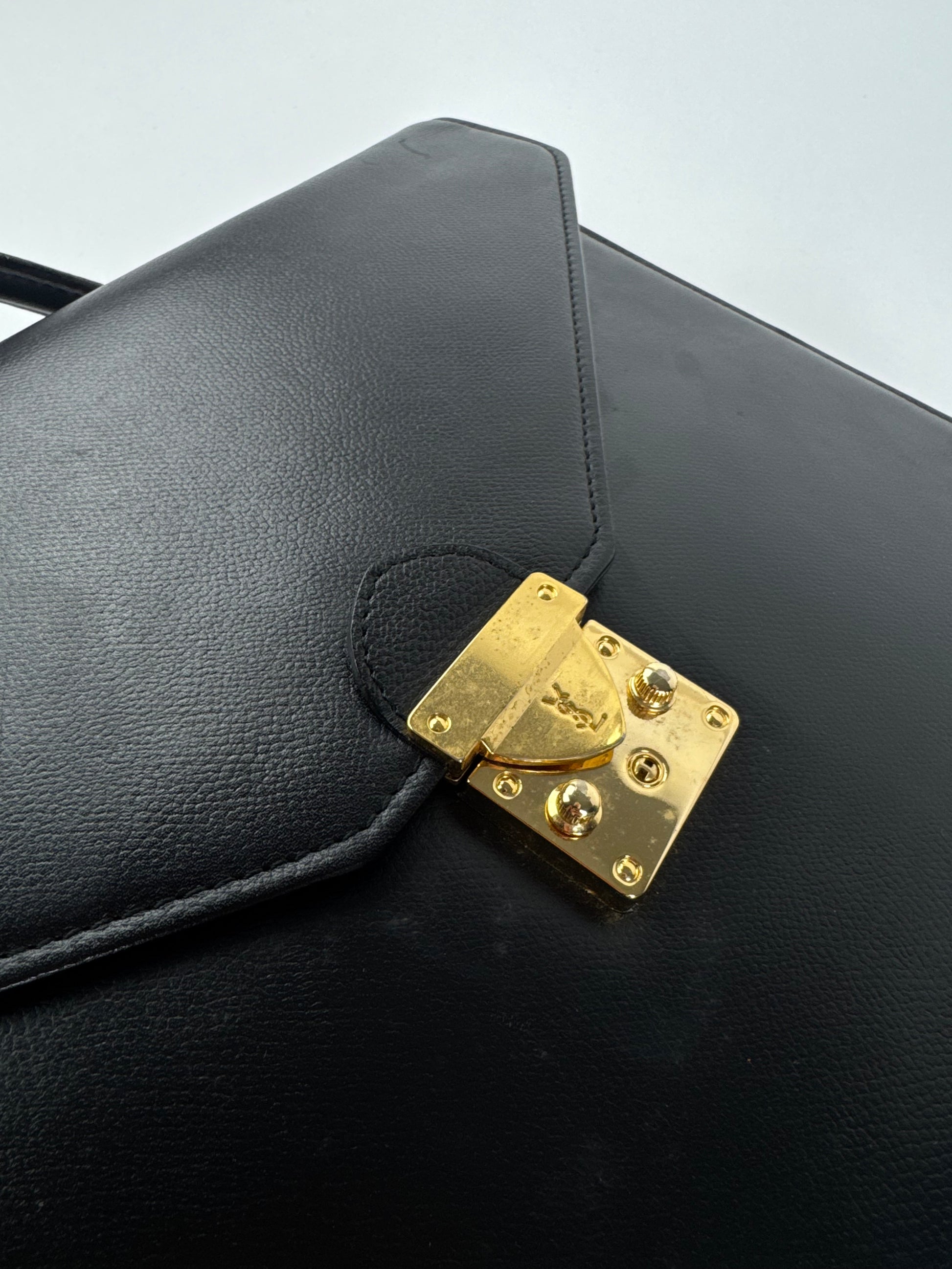 Sac à main vintage YVES SAINT LAURENT en cuir noir. Cet élégant sac unisexe est confectionné en cuir noir lisse. Il est doté d'une courte poignée supérieure, d'un cordon de serrage et d'une poche arrière zippée. Les finitions sont en acier doré poli. L'intérieur est doublé de toile monogrammée YSL noire. Le logo emblématique YSL, créé en 1961 par la graphiste Cassandre, demeure un emblème intemporel du luxe et de la mode parisienne avant-gardiste.