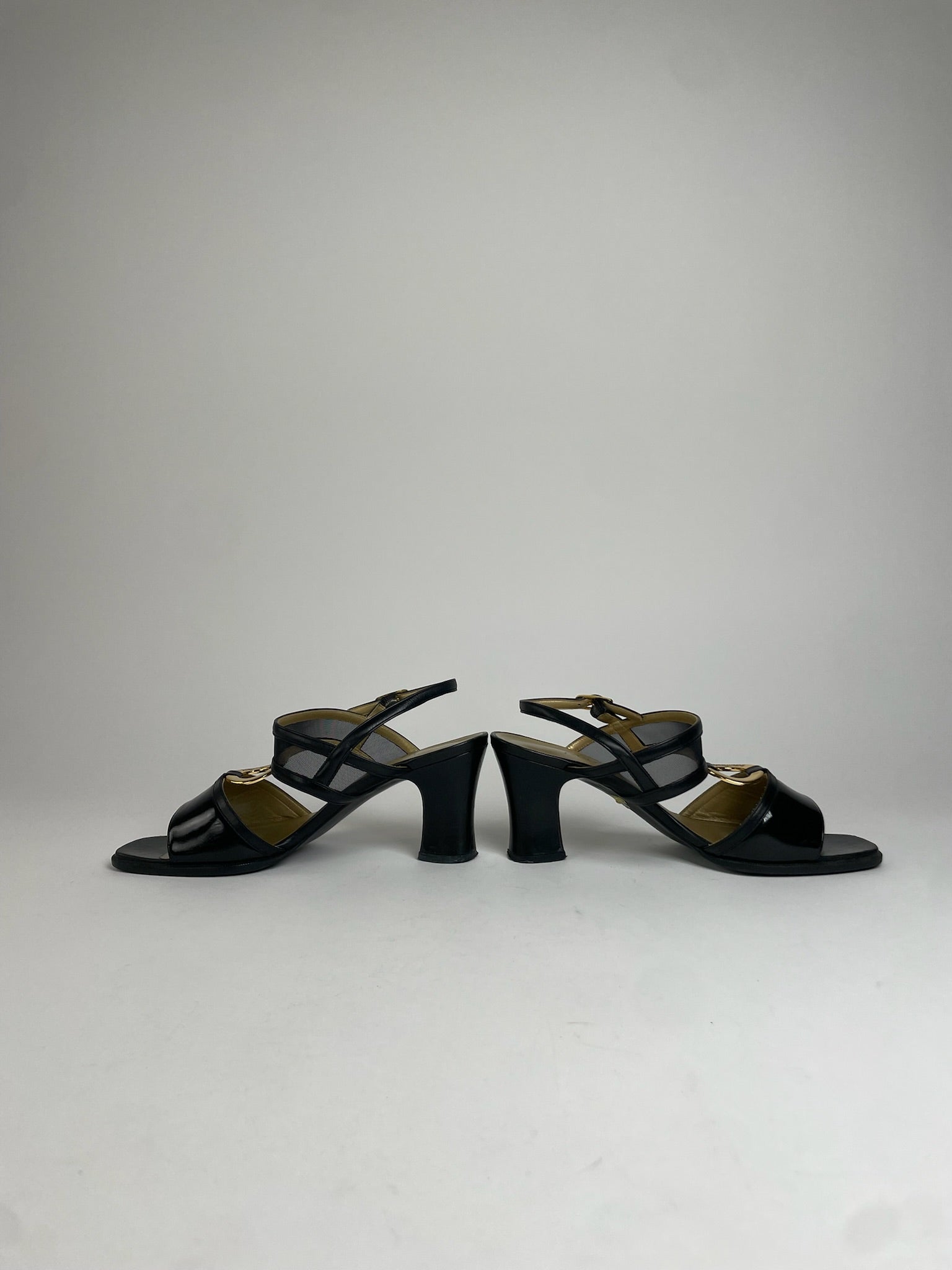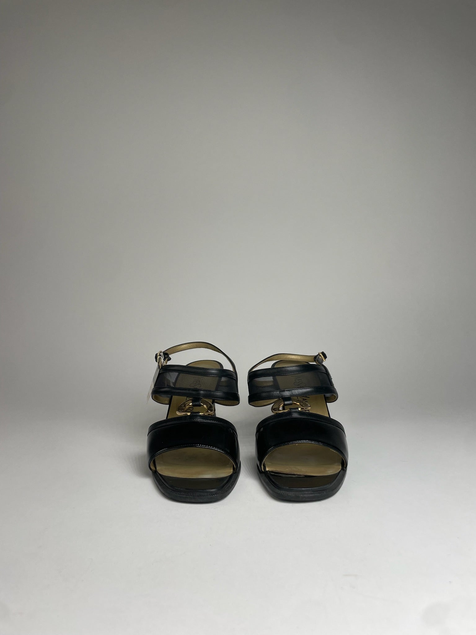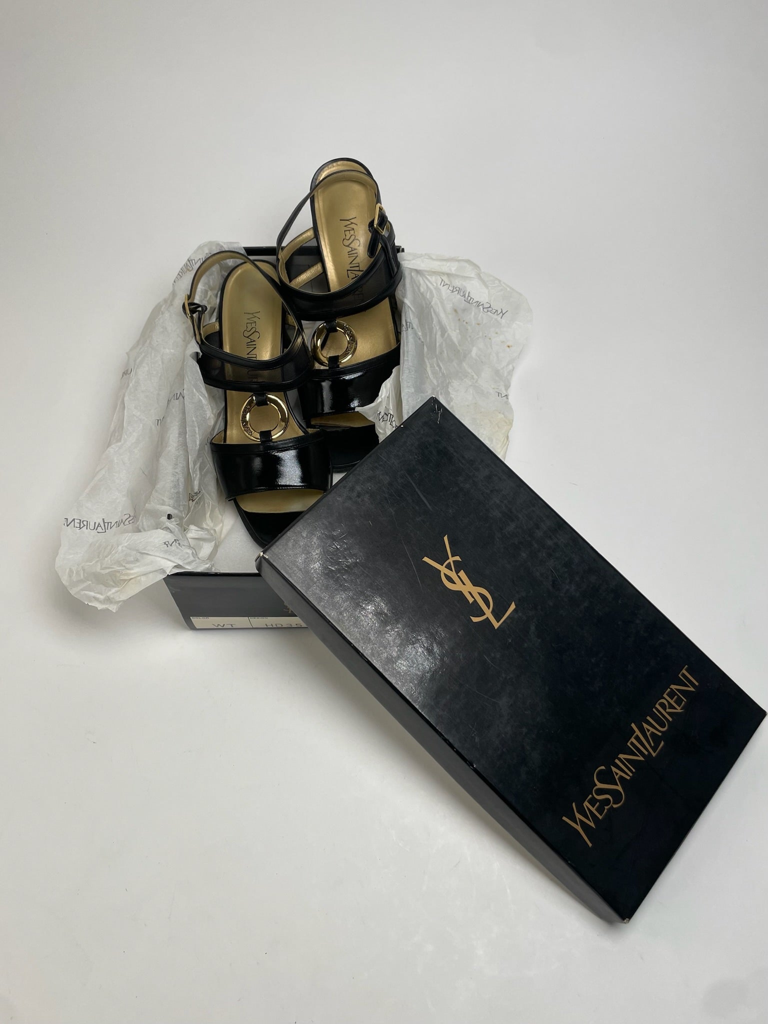 YVES SAINT LAURENT Vintage Pumps. These chic Roman sandal-style pumps are crafted of black leather and feature elegant gold-tone steel hardware. They are finished with an 8 cm heel for a timeless, feminine silhouette and come with the original YVES SAINT LAURENT box.