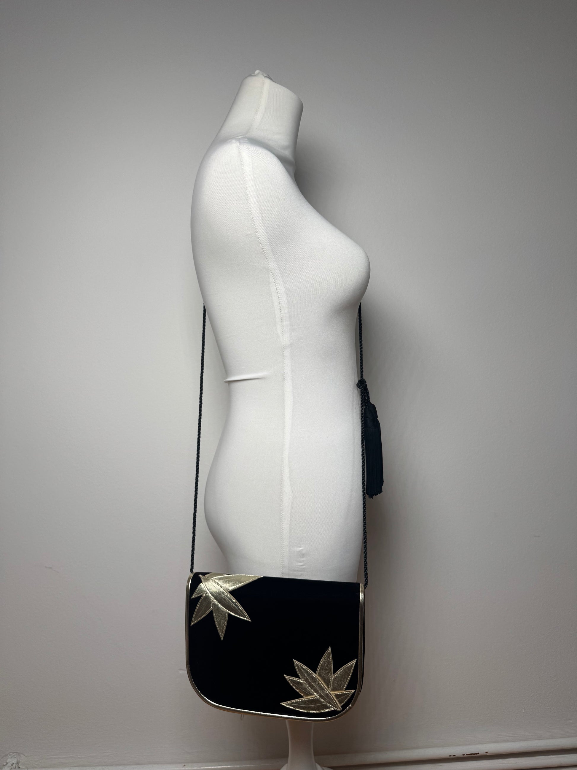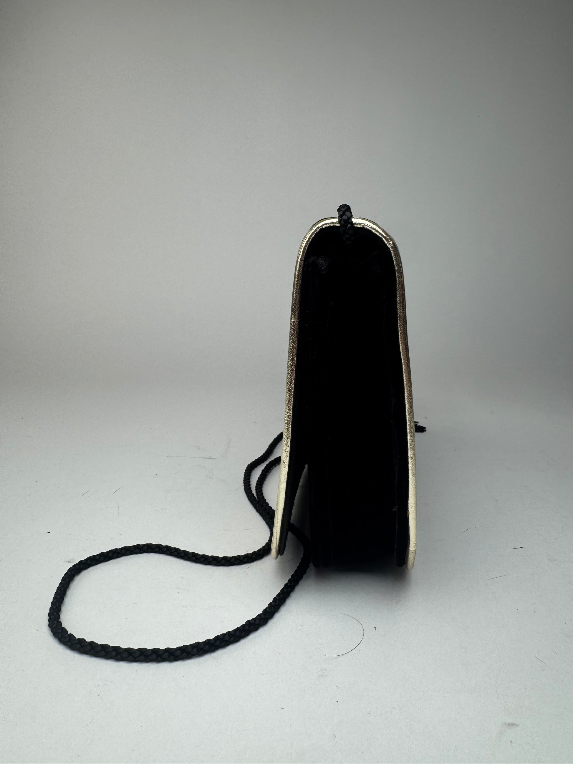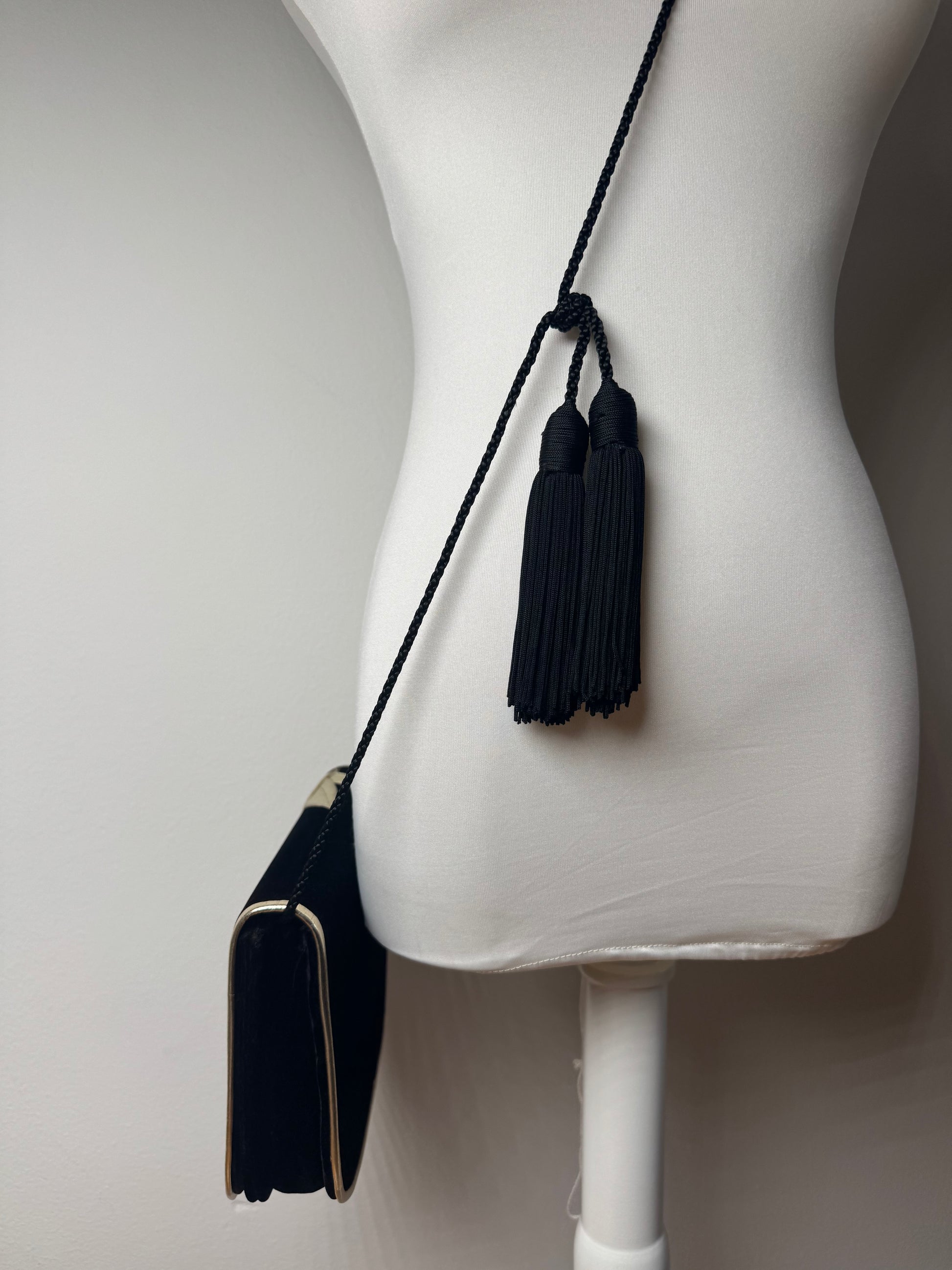 Sac bandoulière vintage en velours YVES SAINT LAURENT. Ce sac bandoulière raffiné est confectionné en velours noir avec des applications en cuir doré sur le devant. Sa bandoulière en toile noire est ornée de deux larges pompons décoratifs.