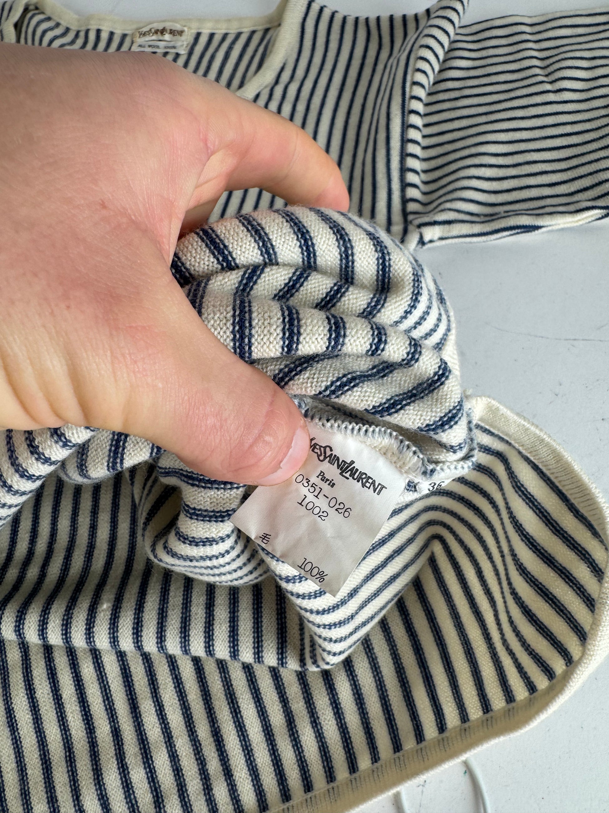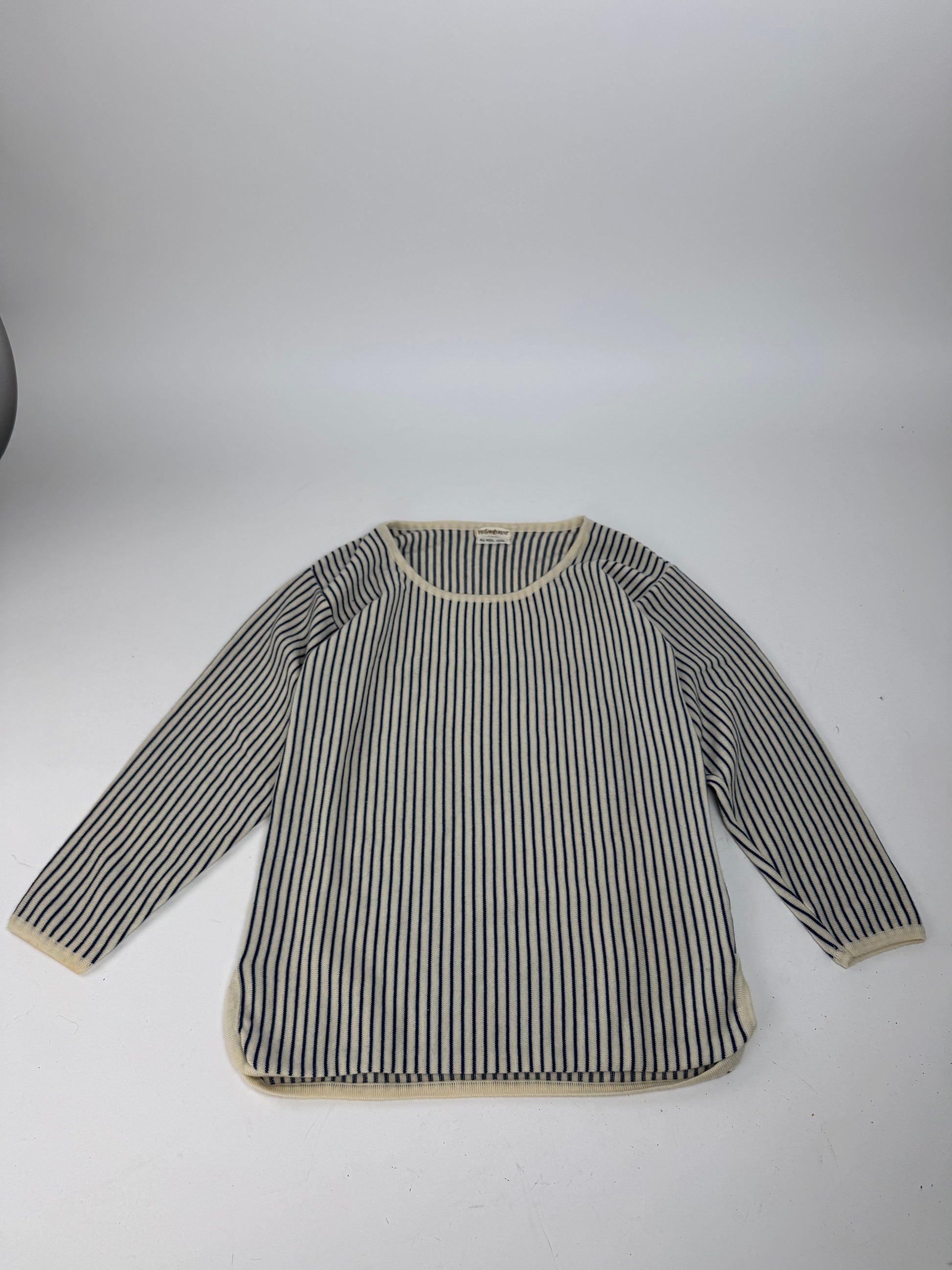 This vintage sweater from Yves Saint Laurent features a navy and white striped design with a classic crew neckline. Crafted from 100% wool, it offers a timeless and elegant silhouette with a soft, comfortable feel. A refined YSL wardrobe staple perfect for year-round styling.