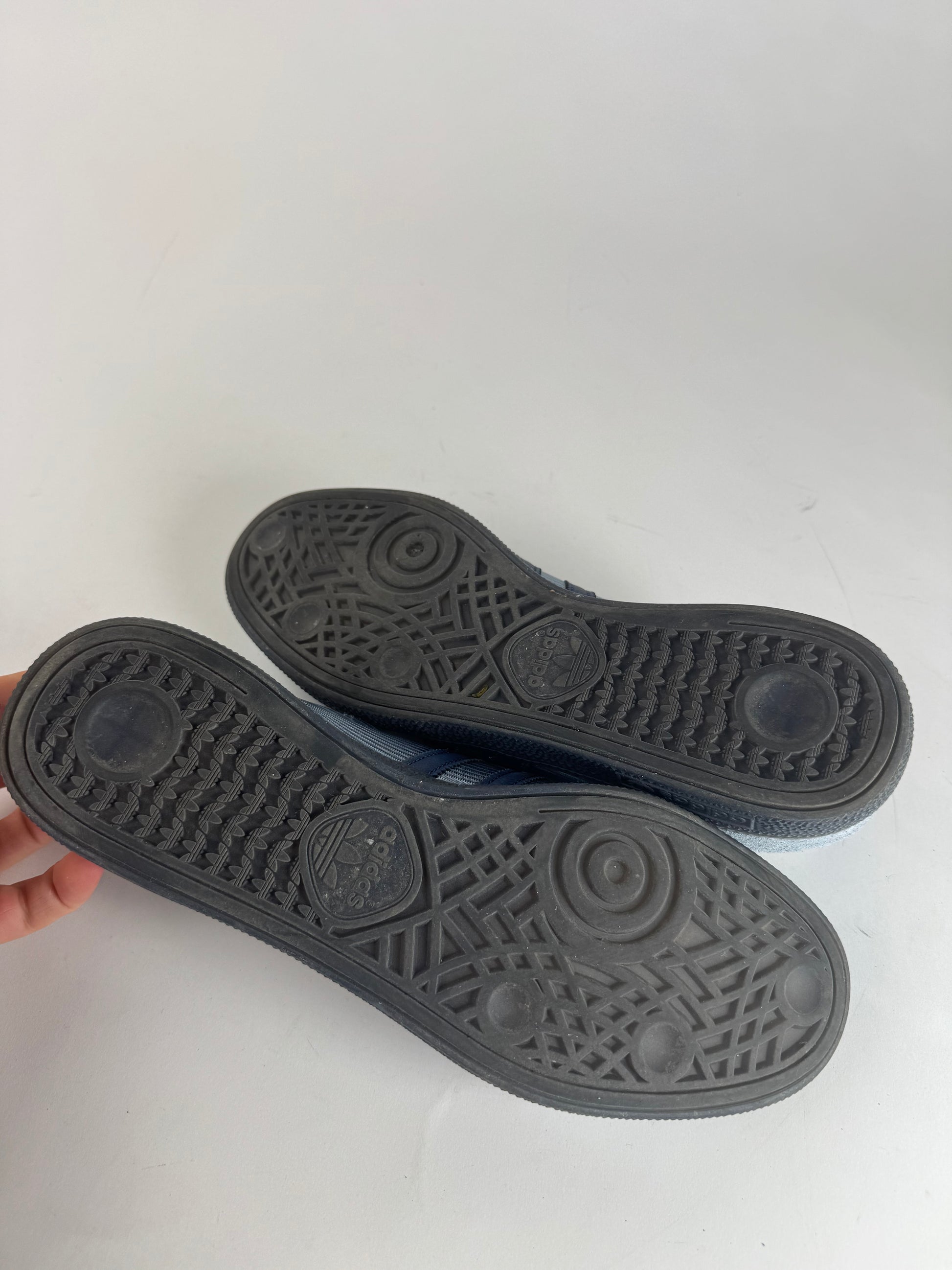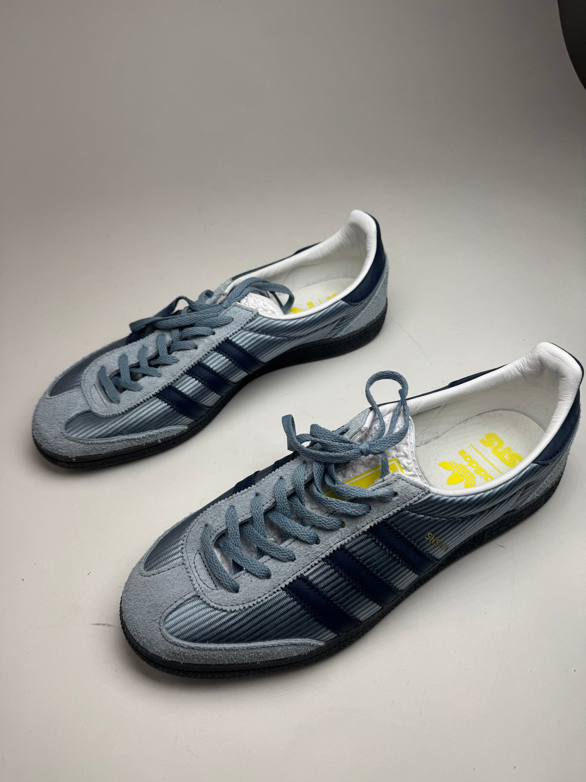 ADIDAS Samba Metallic Sneakers. These chic sneakers are finely crafted of metallic leather with navy blue stripes and light blue suede detailing. The shoes feature a black rubber sole and a white leather interior.