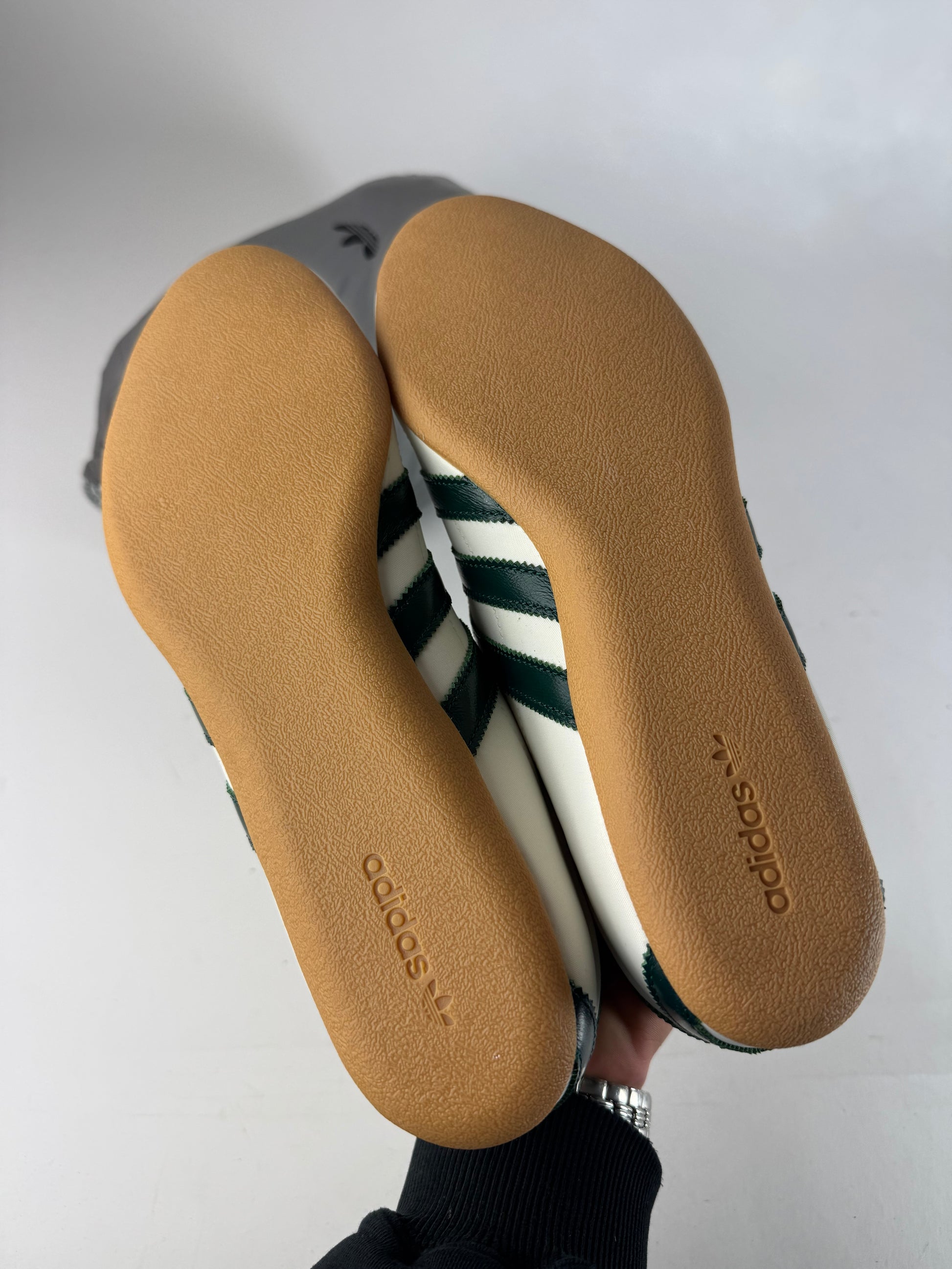 ADIDAS Tokyo Sneakers. These classic sneakers are crafted of smooth white leather and feature green and dark green signature stripes on the sides. The design is completed with white laces and a beige-brown coated synthetic sole. The Adidas Tokyo line draws inspiration from vintage athletic footwear, combining retro running aesthetics with modern comfort and everyday versatility.