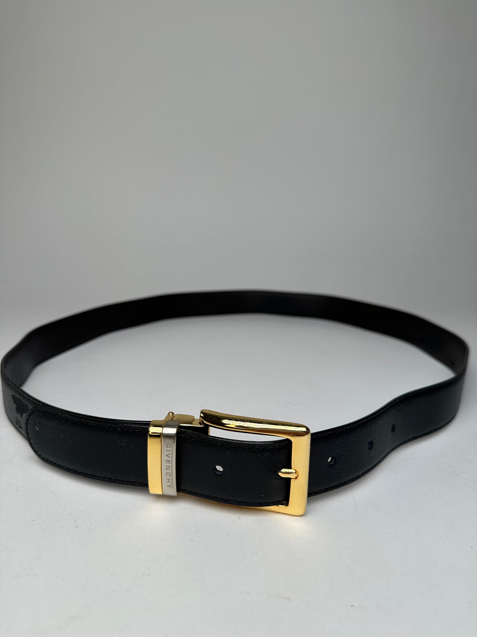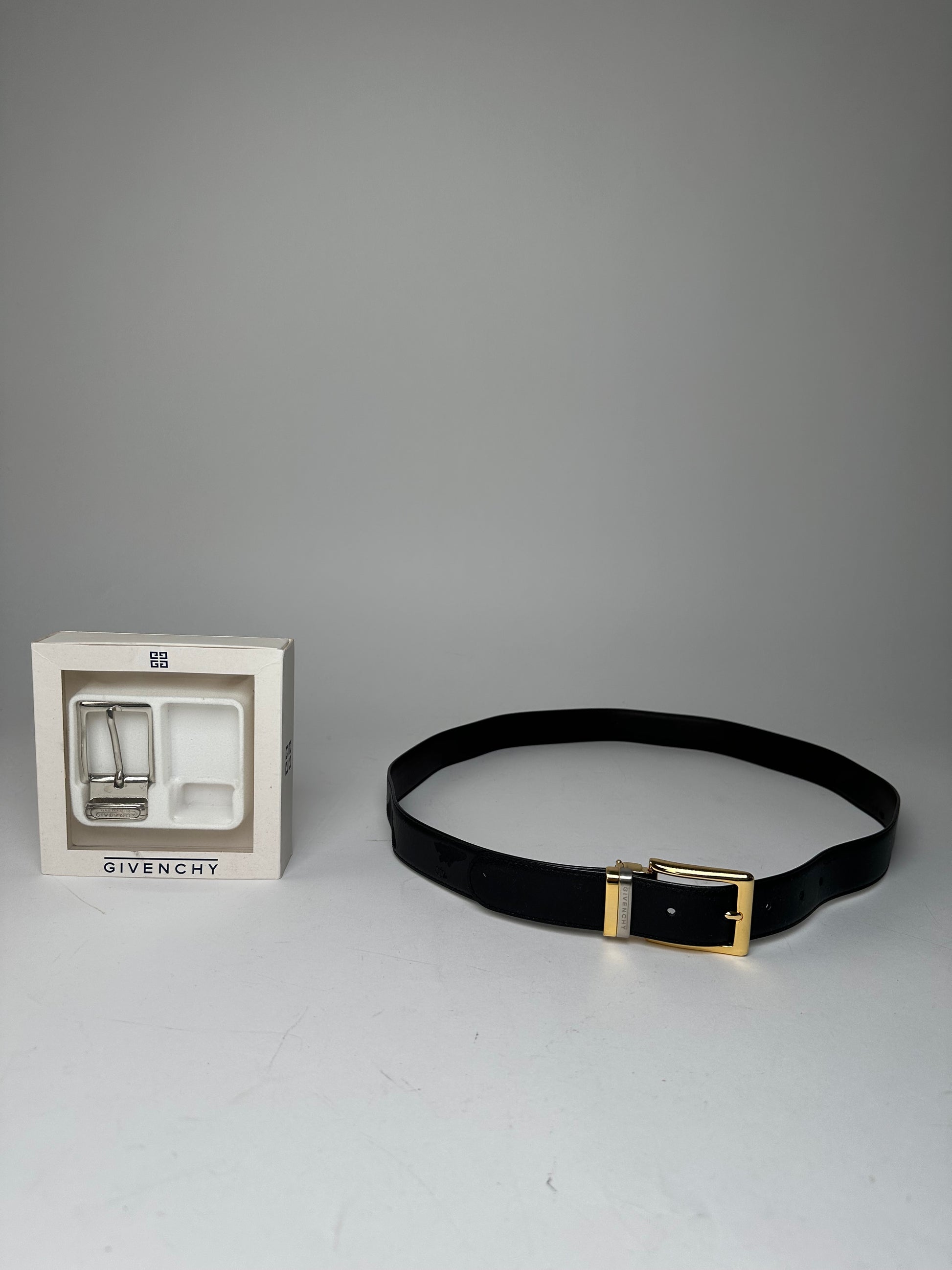 GIVENCHY Vintage Leather Belt Set. This elegant vintage belt set is crafted of smooth black leather and includes two interchangeable buckles, both engraved with the Givenchy logo. One buckle is fully silver-tone steel, while the other features a combination of gold- and silver-tone steel. The belt exterior is black leather with a brown leather interior. The sale includes the original packaging.