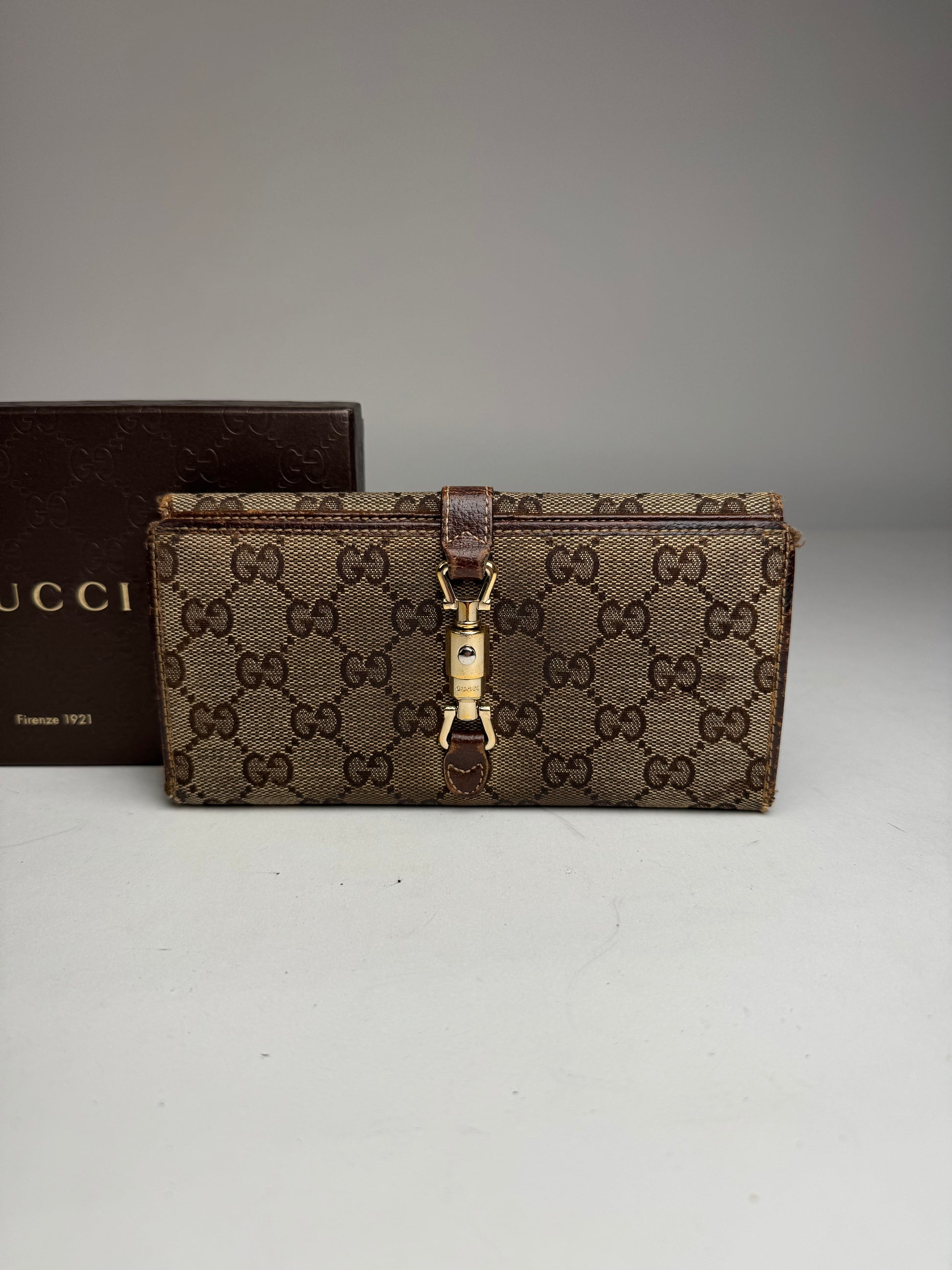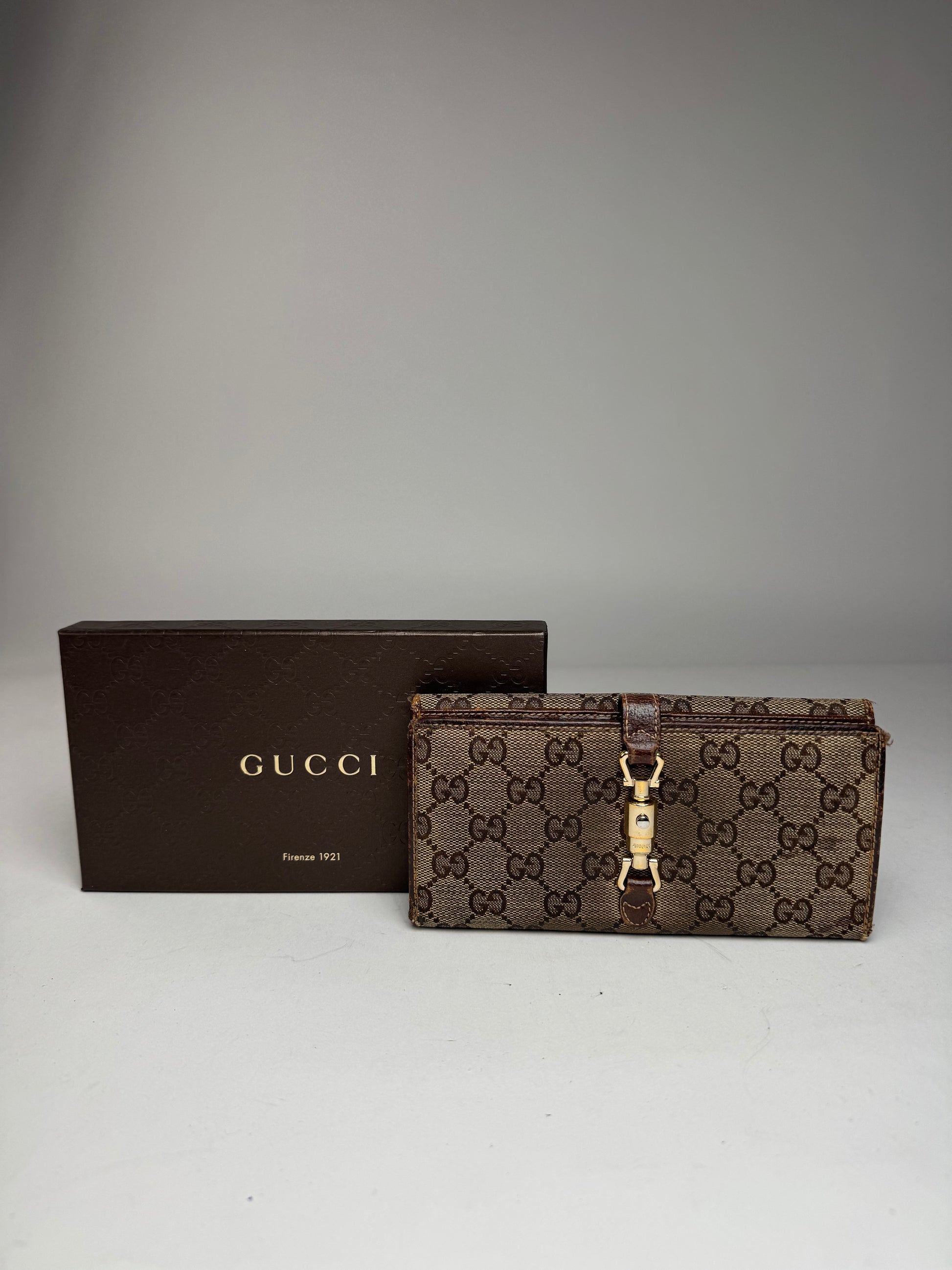 This chic wallet is finely crafted of beige-brown Gucci monogram canvas. It features a gold-tone steel Jackie clasp, a design rooted in the history of the Jackie line, which became iconic after Jacqueline Kennedy was frequently photographed with her Gucci bag in the 1960s. The remaining hardware is also gold-tone steel. The interior opens to brown leather.