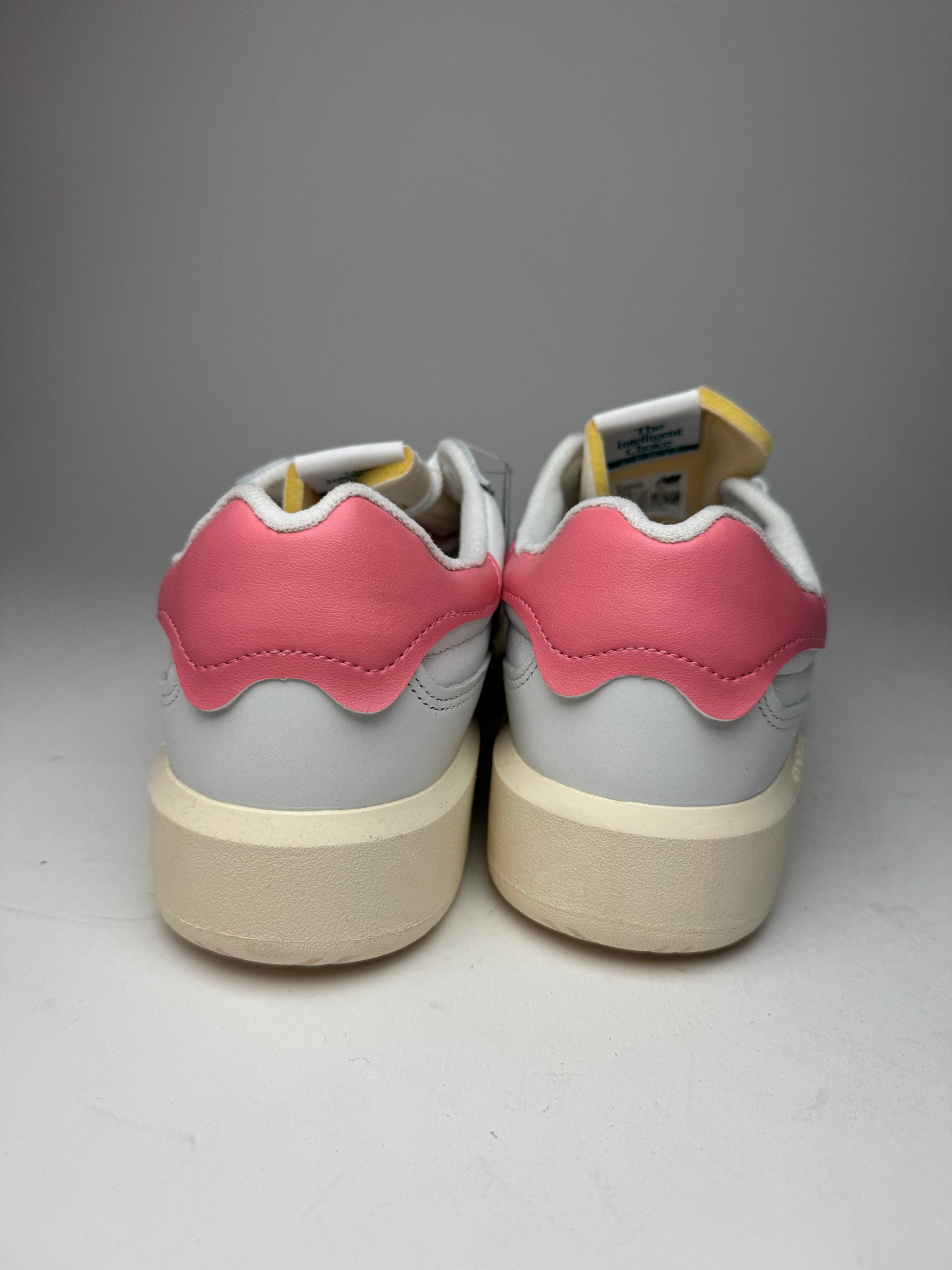 These contemporary sneakers are crafted from white leather with soft pink leather accents and are finished with a beige rubber sole. The CT302 silhouette is inspired by classic New Balance tennis shoes from the 1970s and reinterprets them with a modern, fashion-forward profile, reflecting New Balance’s heritage of performance-driven design combined with lifestyle appeal. This pair comes new with tag.