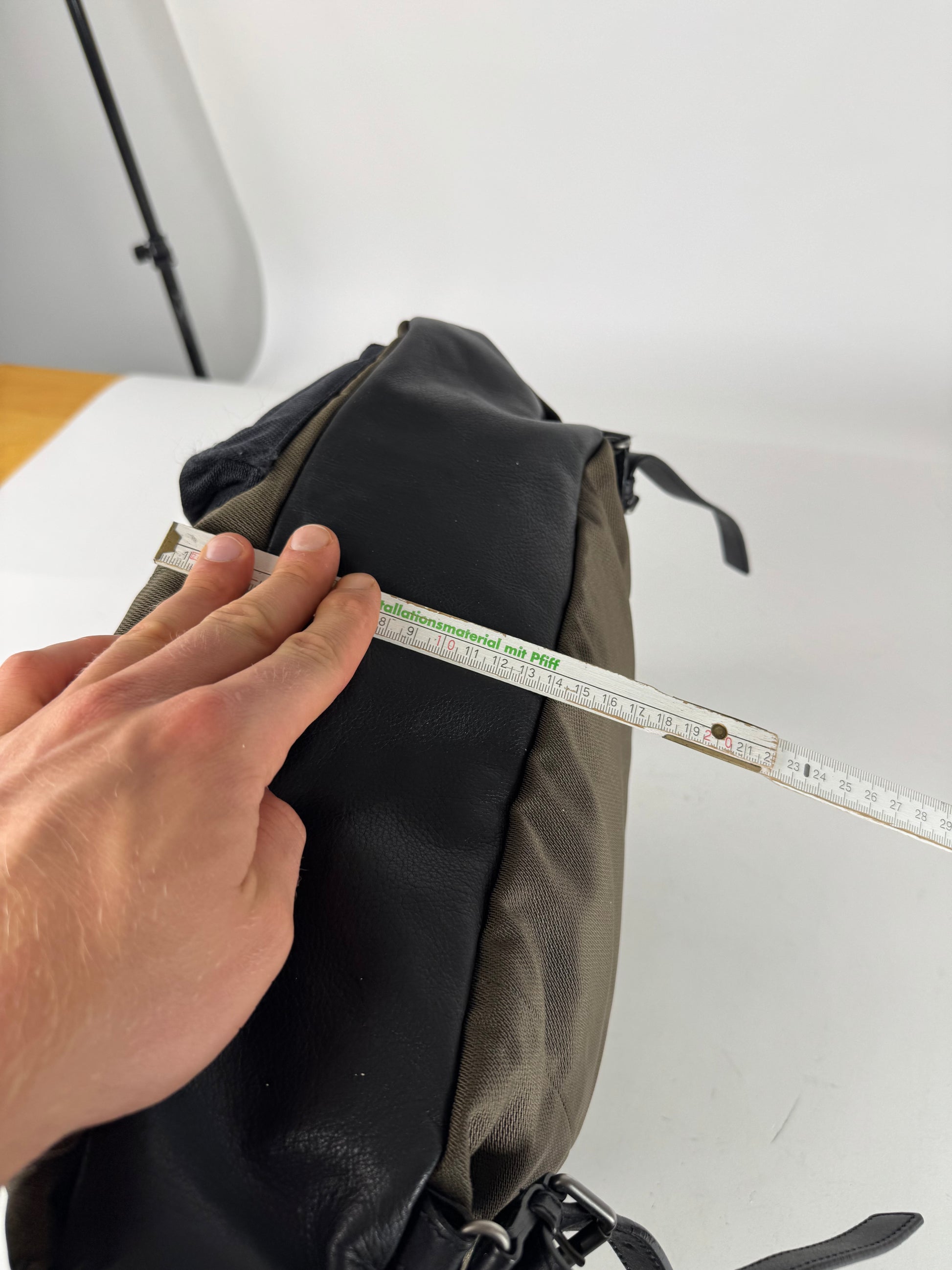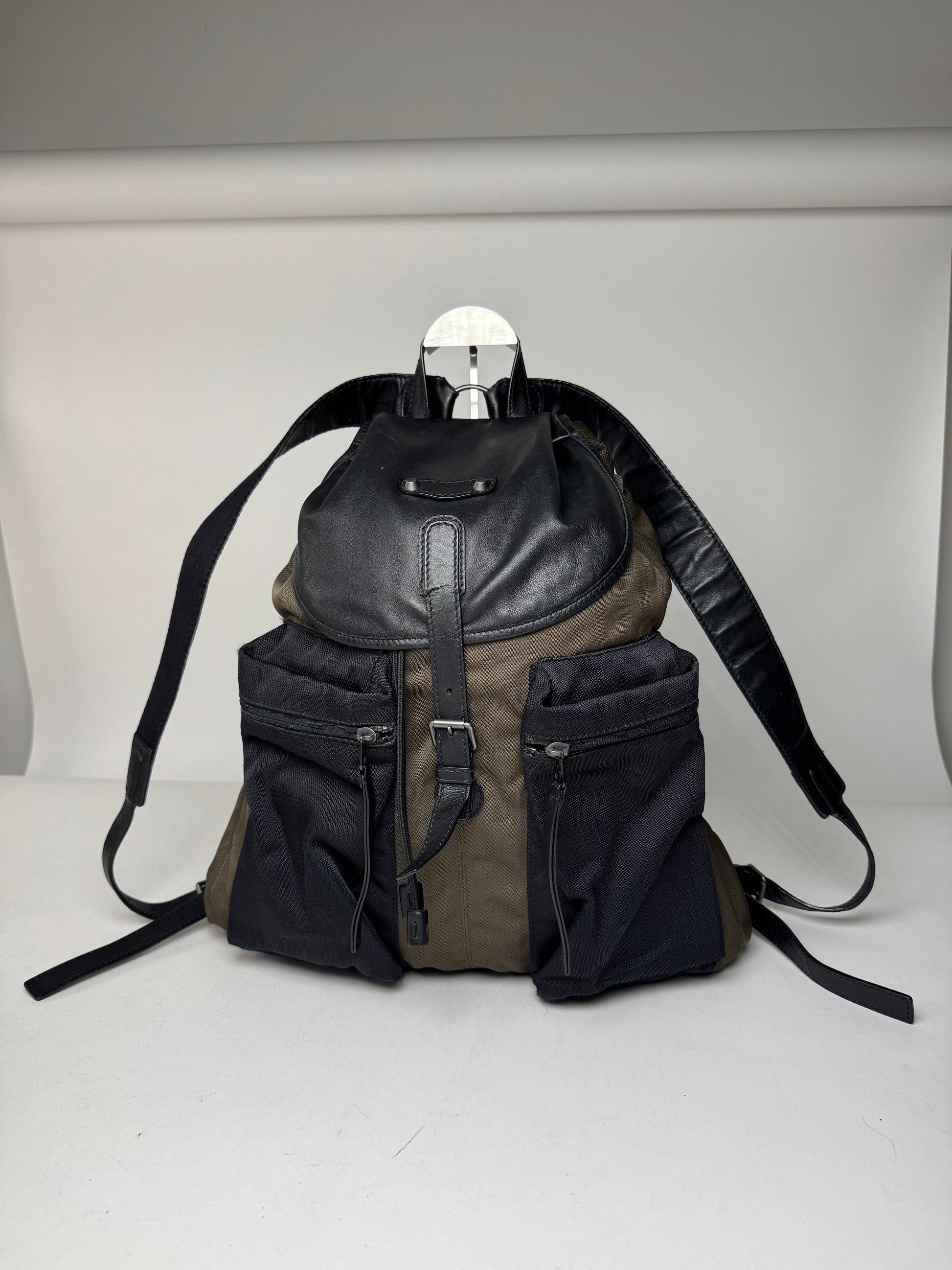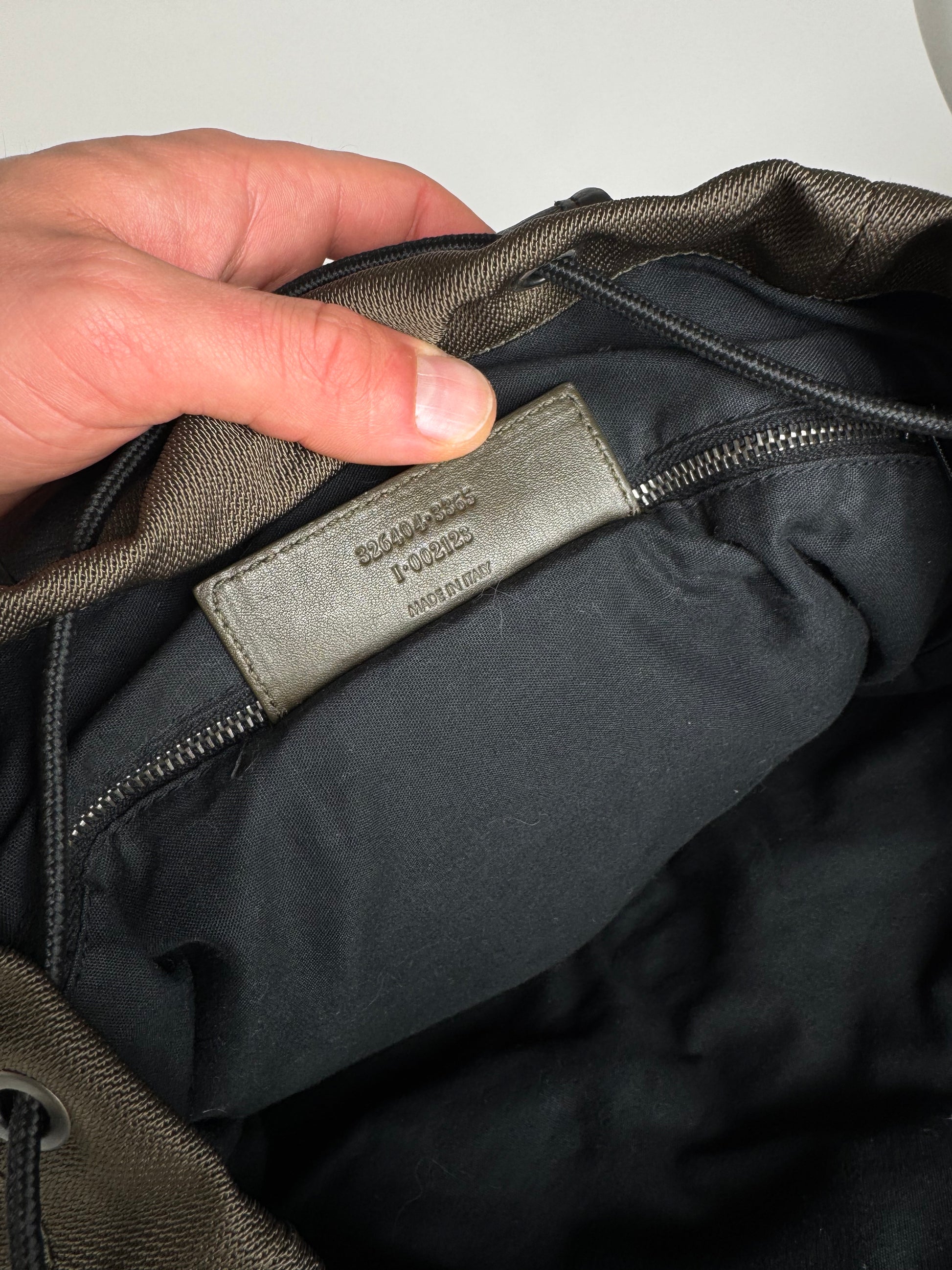 BALENCIAGA Khaki Canvas Vintage City Backpack. This chic backpack is finely crafted of khaki canvas with black and navy leather trim in the iconic City design. The bag features adjustable canvas shoulder straps, a top handle, a front zipper pocket, and silver-tone steel hardware. The top opens to a spacious black canvas interior.