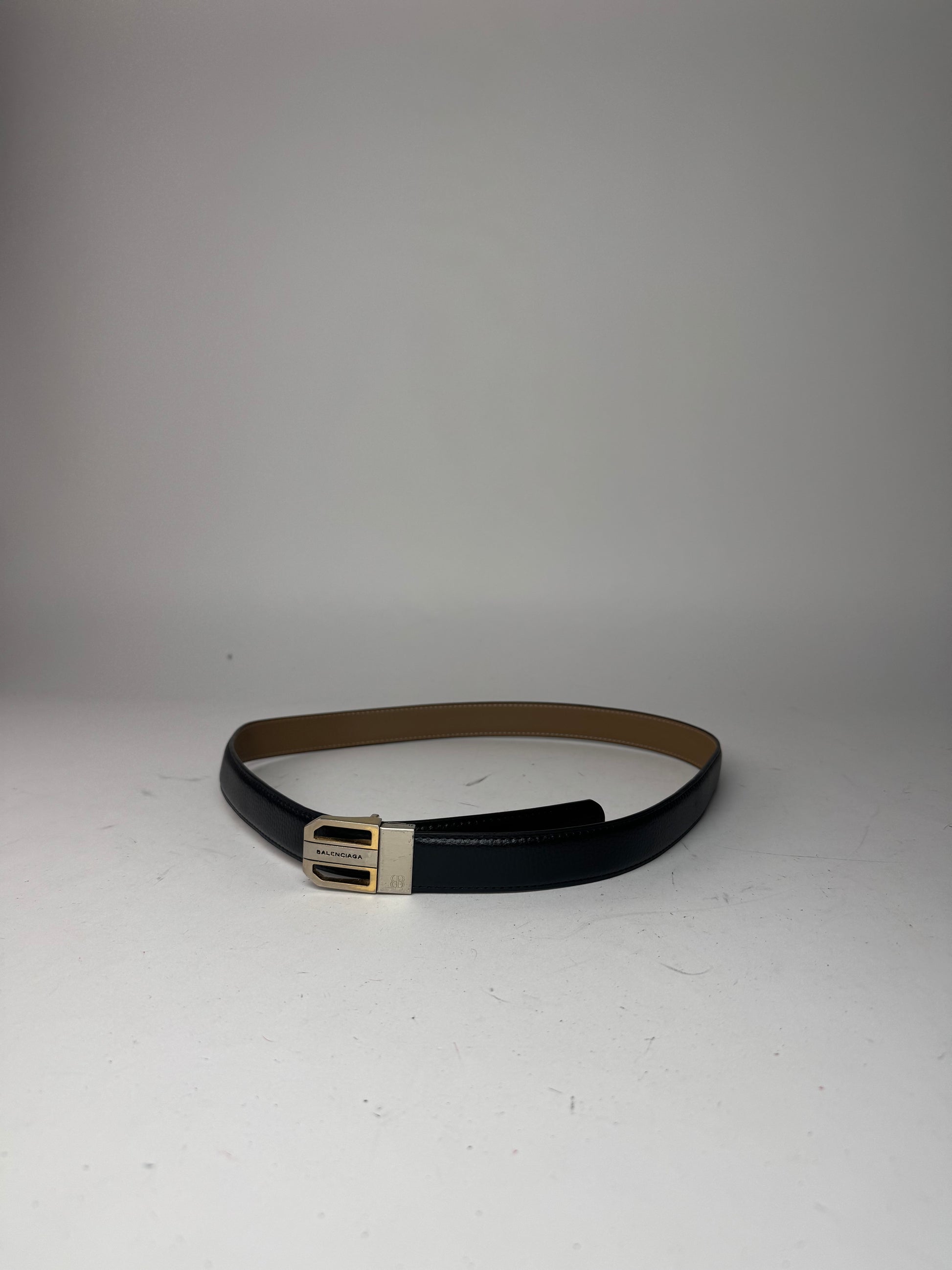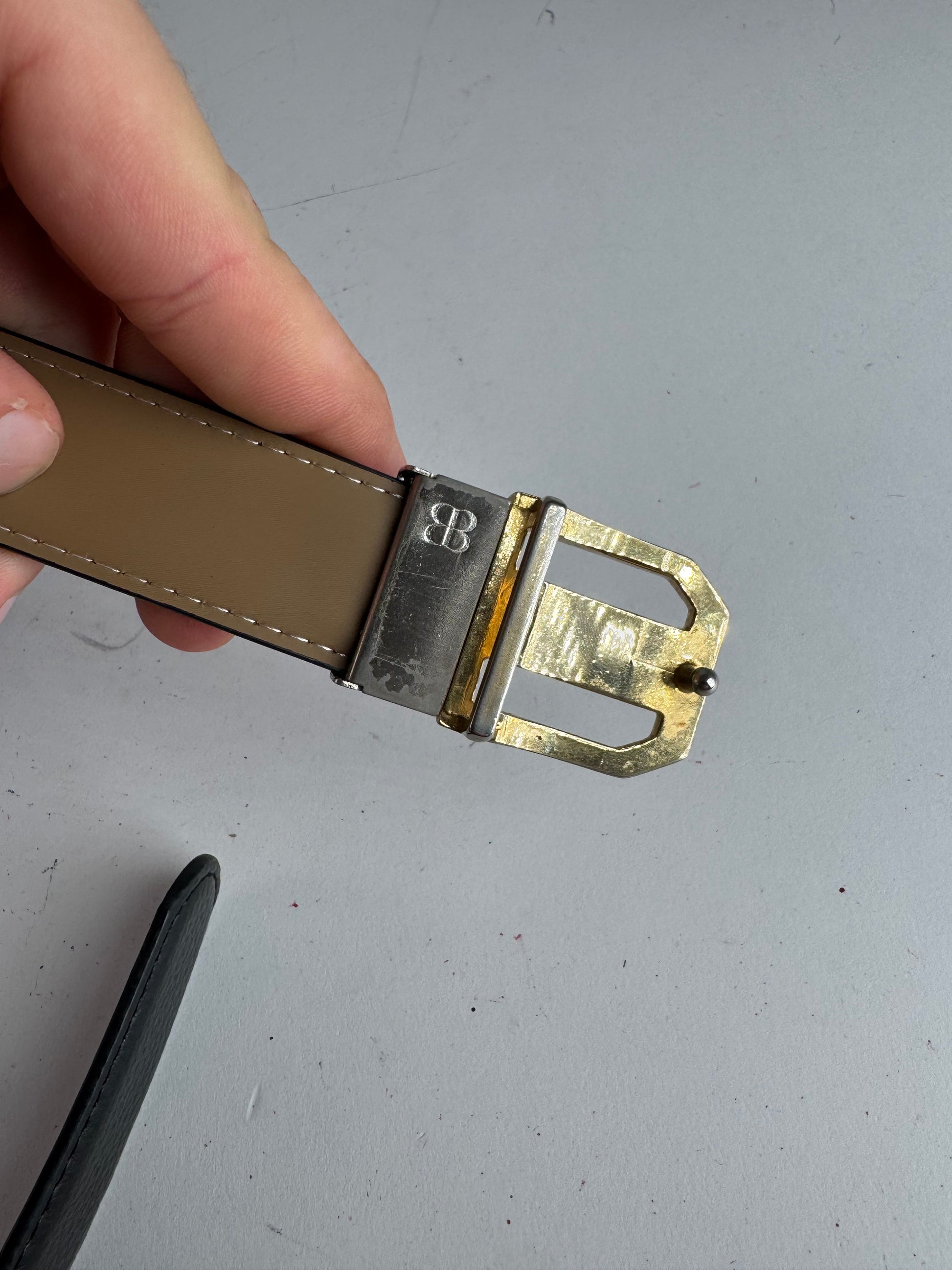 This stylish vintage belt features a black leather strap in a snakeskin pattern with a beige-brown leather interior. The buckle is crafted from silver and gold-tone steel and showcases a black Balenciaga logo engraving. Please note that the leather strap is a replacement and not original to Balenciaga, and the holes still need to be punched.