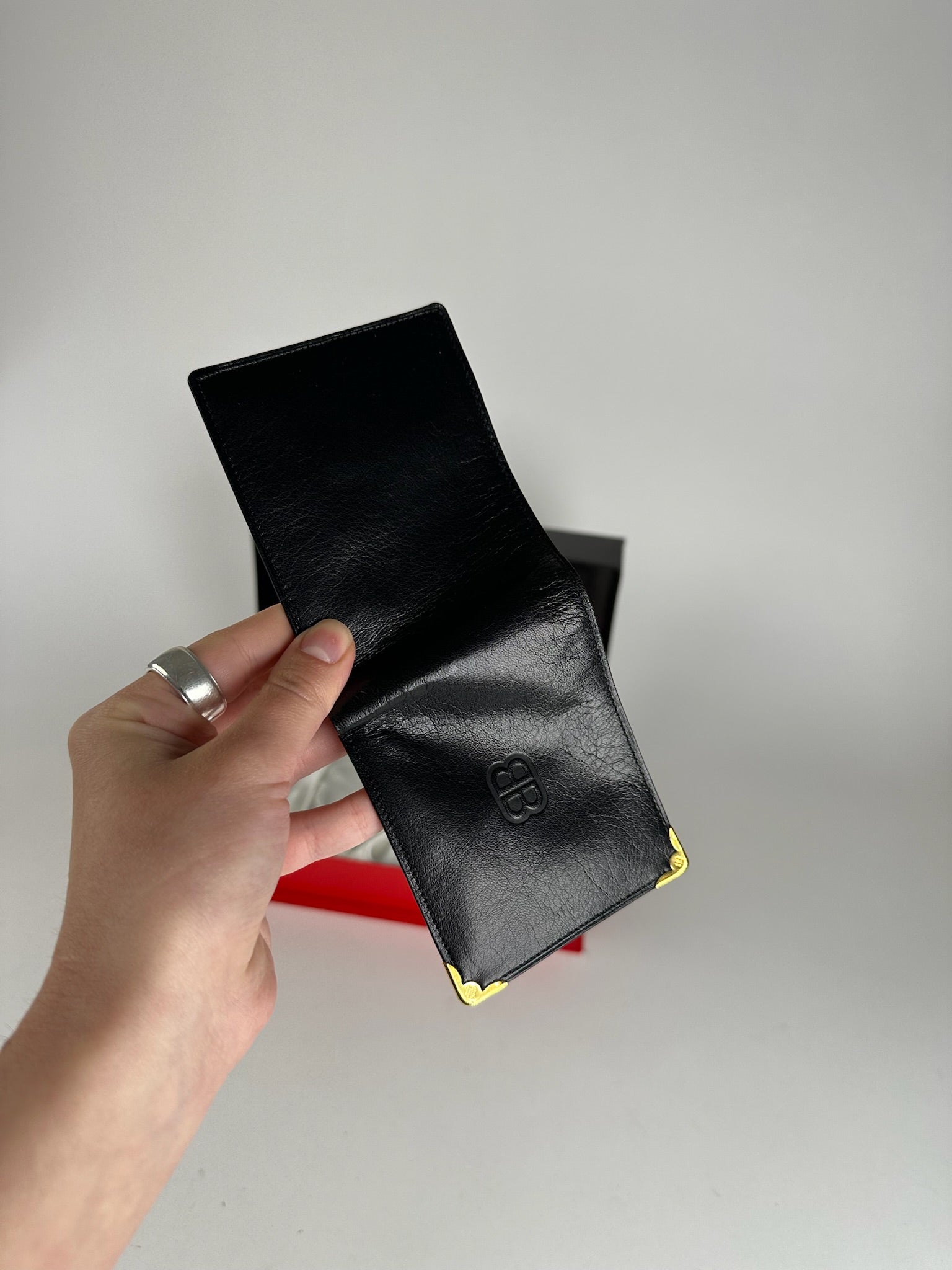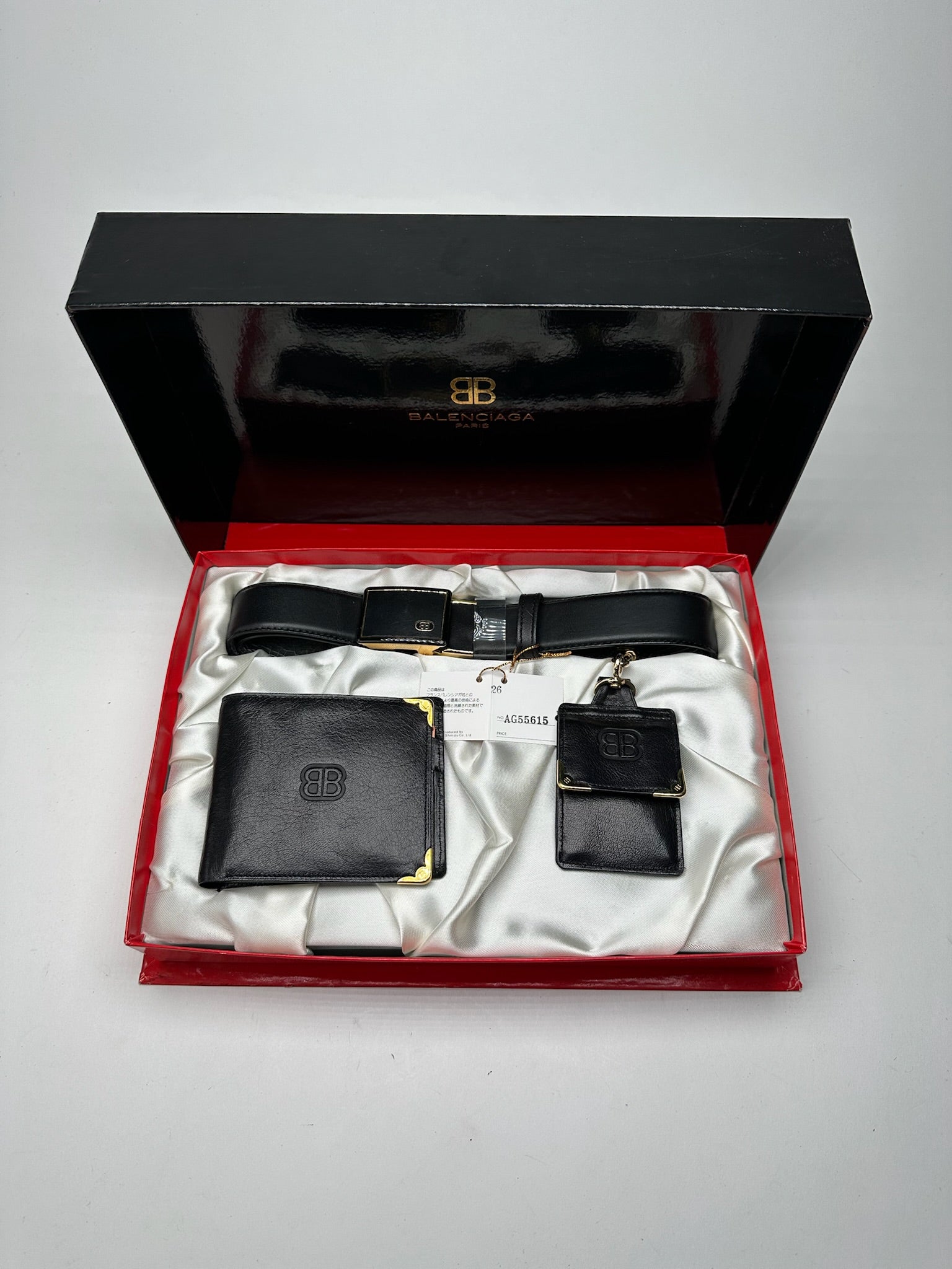 BALENCIAGA Vintage Set – 1980s Collector's Edition. This rare collector’s set from the 1980s includes a keychain with an attached cardholder, a foldable wallet, and a leather belt. All pieces are finely crafted in matching black leather with gold-tone hardware and remain completely unused, preserved in their original Balenciaga special edition box — a true vintage treasure.