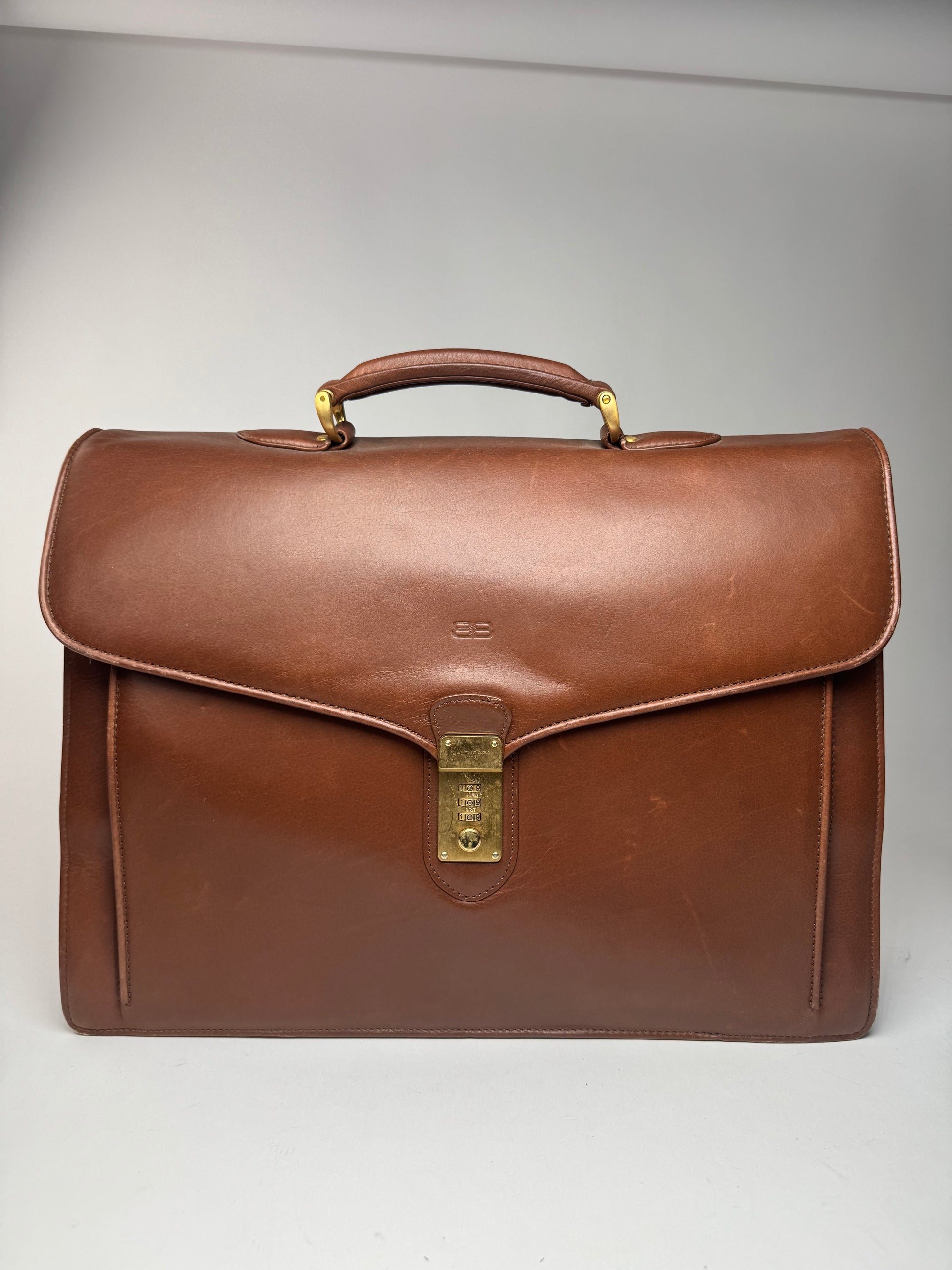 BALENCIAGA Vintage Leather Briefcase. This chic handbag is finely crafted of brown leather. The shoulder bag features a steel gold-tone combination lock. The flap opens to a multi-compartment interior with four large compartments and numerous small pockets and storage options.