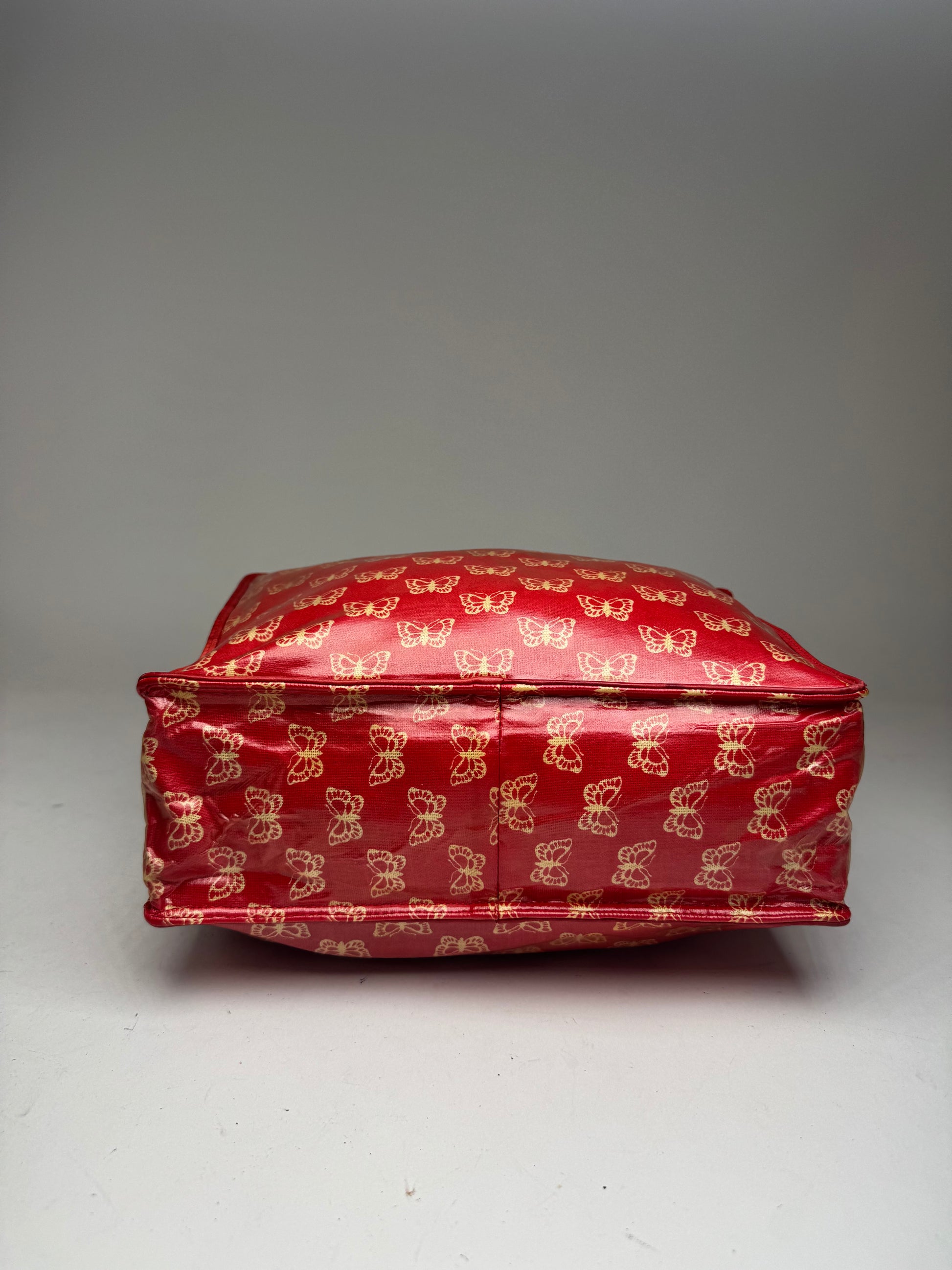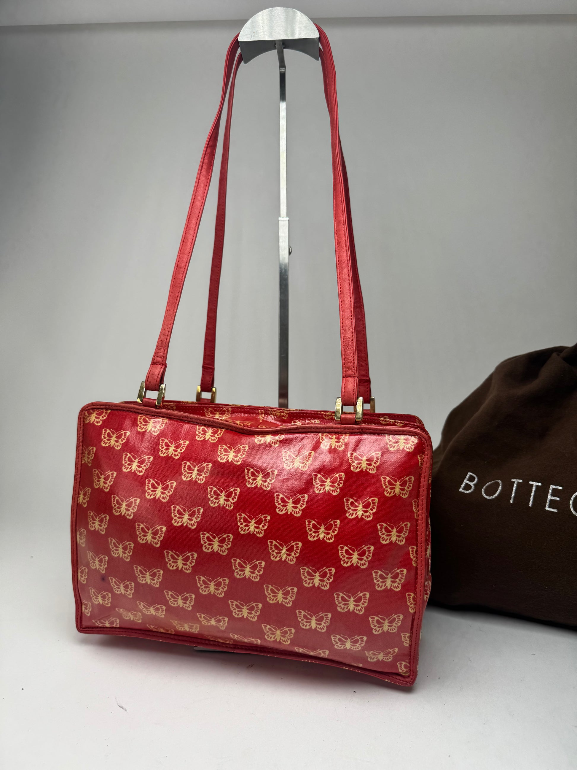 BOTTEGA VENETA Vintage Handbag. This elegant handbag is finely crafted of red leather adorned with beige butterfly monogram details. The bag features two medium-length handles and three spacious compartments: two with zipper closures and one with a snap button closure. The hardware is gold-tone steel. The interior is lined in black leather. First introduced in the 1970s, the butterfly monogram reflects Bottega Veneta’s dedication to playful motifs and Italian craftsmanship, making it a rare and sought-after design.