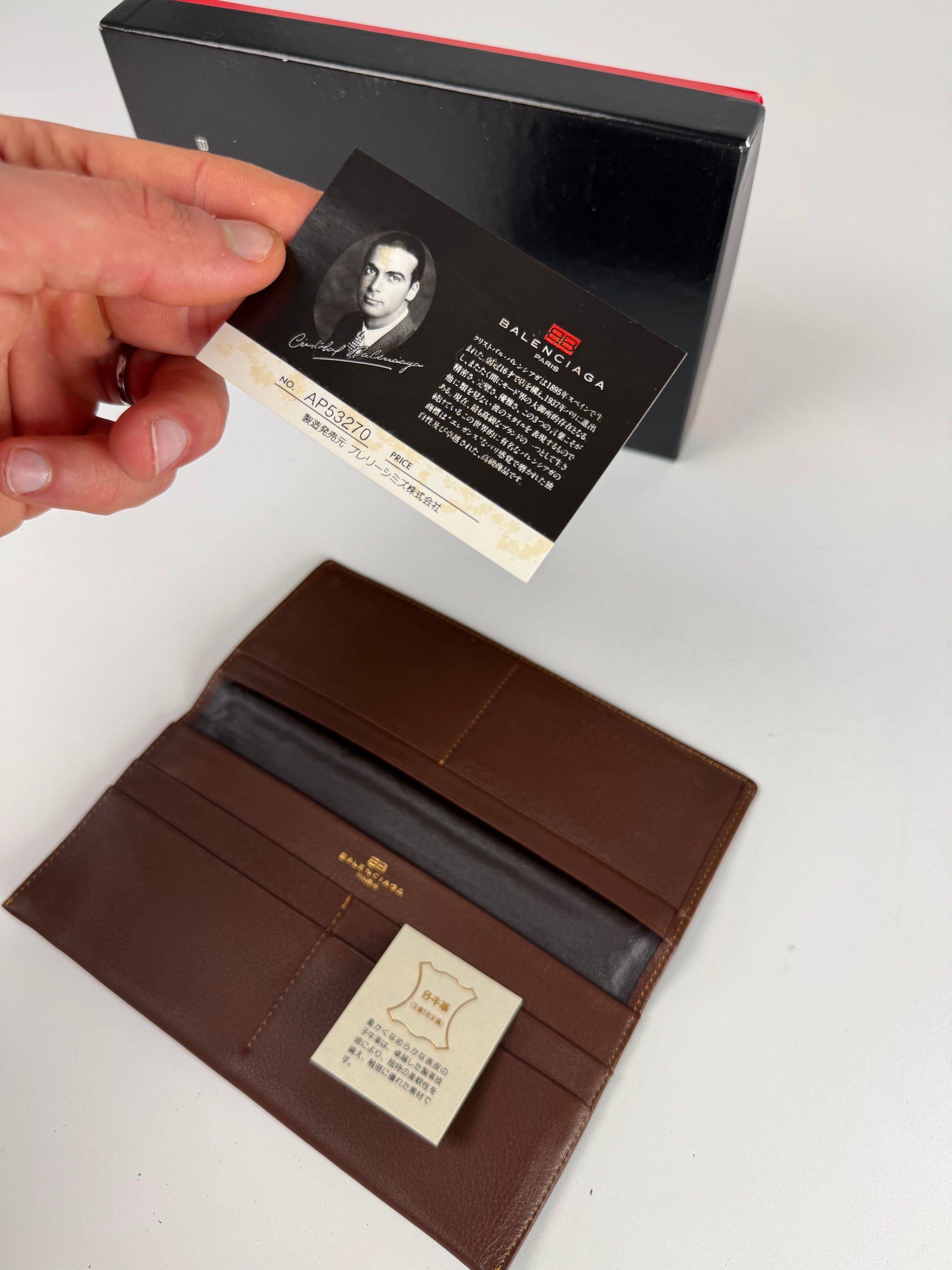 This elegant vintage card holder is finely crafted from soft brown leather. A rare piece from the 1980s, it remains in brand-new condition with its original packaging and Balenciaga authentication cards. The timeless design makes it a perfect unisex accessory.