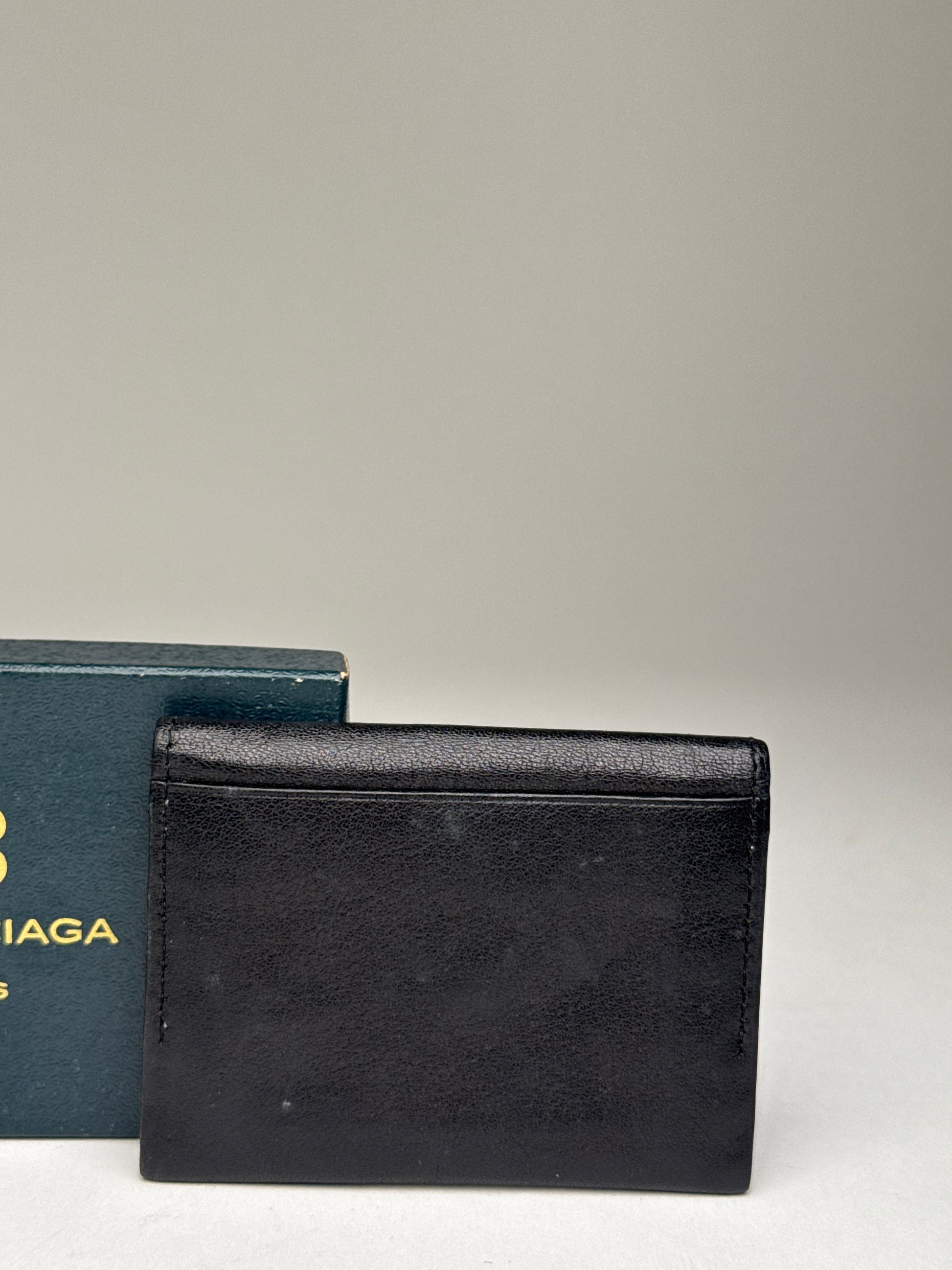 BALENCIAGA Vintage Card Holder. This compact card holder is crafted of black leather and features an embossed Balenciaga BB logo on the front. The piece is secured with a gold-tone steel snap button closure and offers a practical and refined design for everyday use. The sale includes the original Balenciaga box.