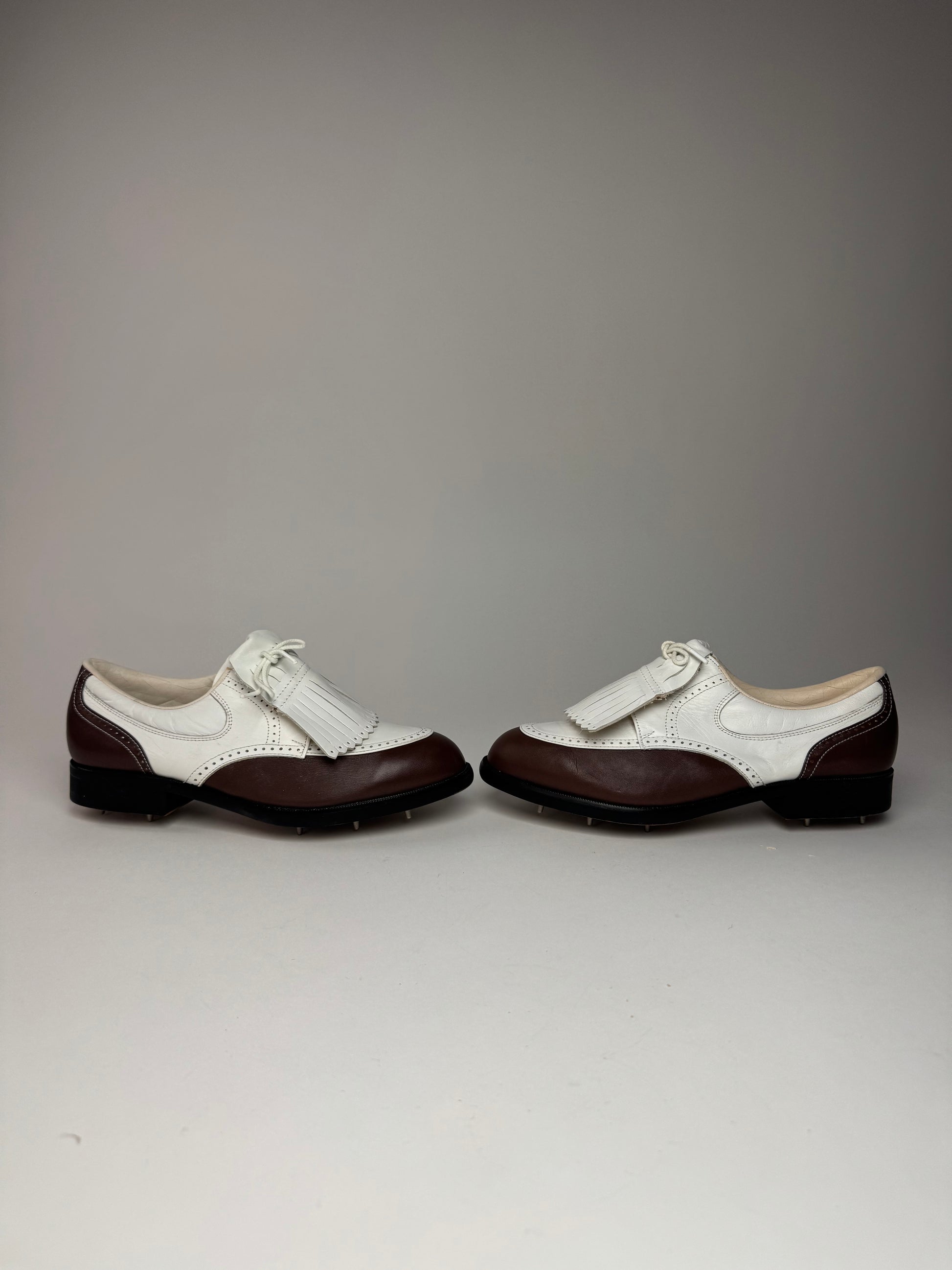 These unique vintage shoes are crafted from white and brown leather and combine classic brogue styling with functional golf shoe elements. The dark brown wooden sole is fitted with silver-tone steel studs designed for golf play, which can be unscrewed if desired. The interior is fully lined with white leather, offering a refined finish.