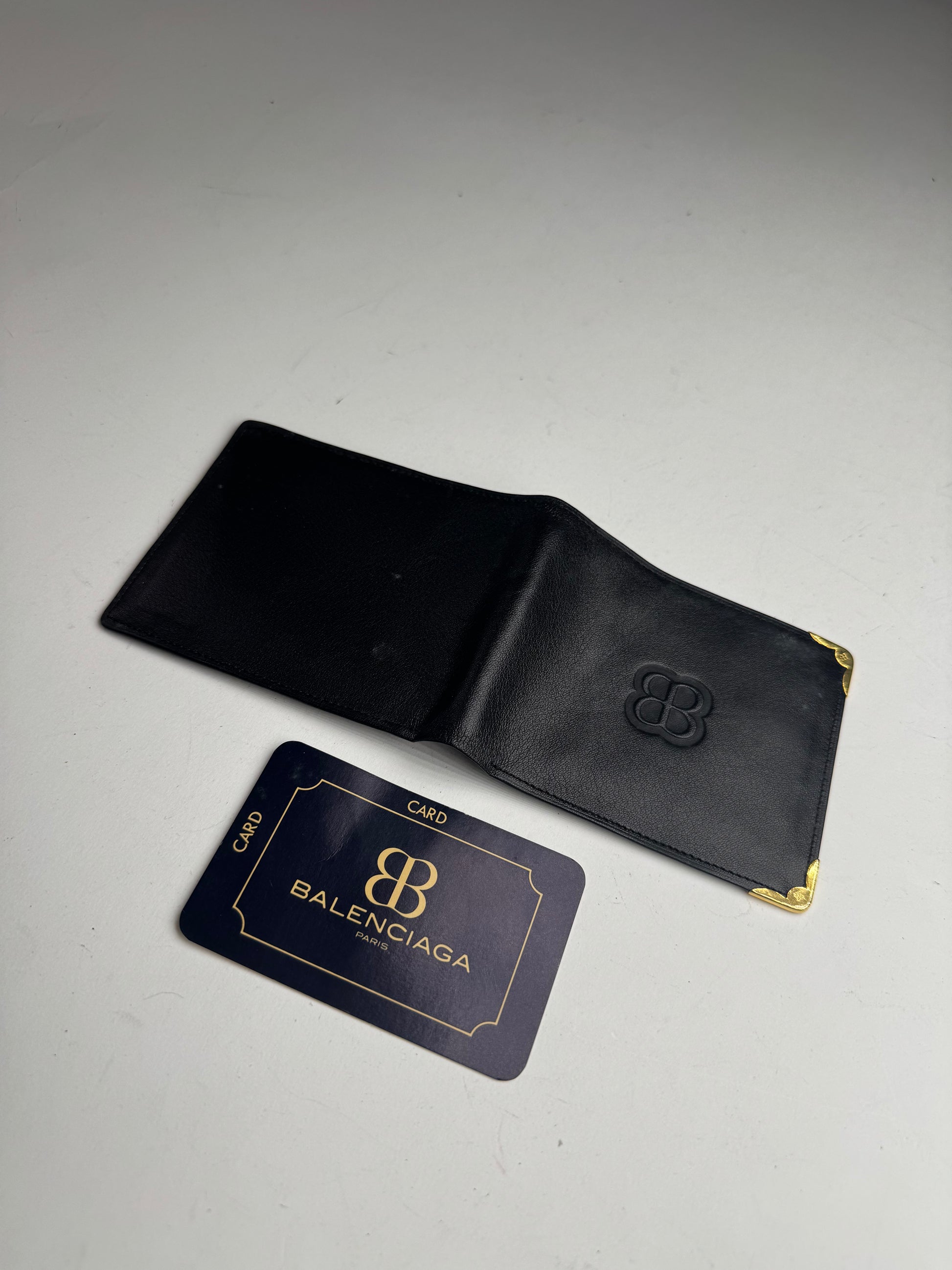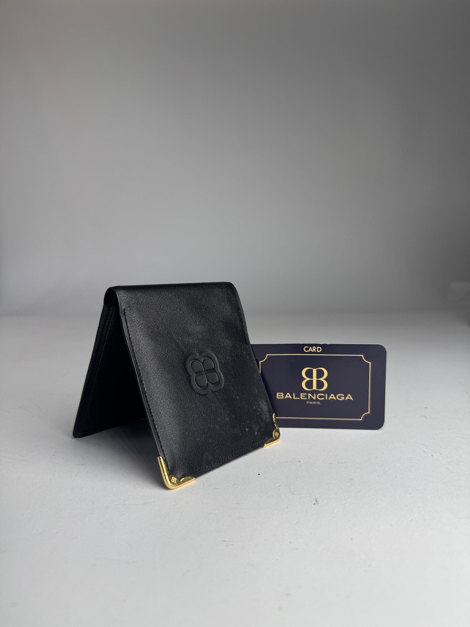 BALENCIAGA Vintage Leather Card Holder. This chic card holder is finely crafted of black leather and features a foldable design. The corners are finished with gold-tone steel hardware.