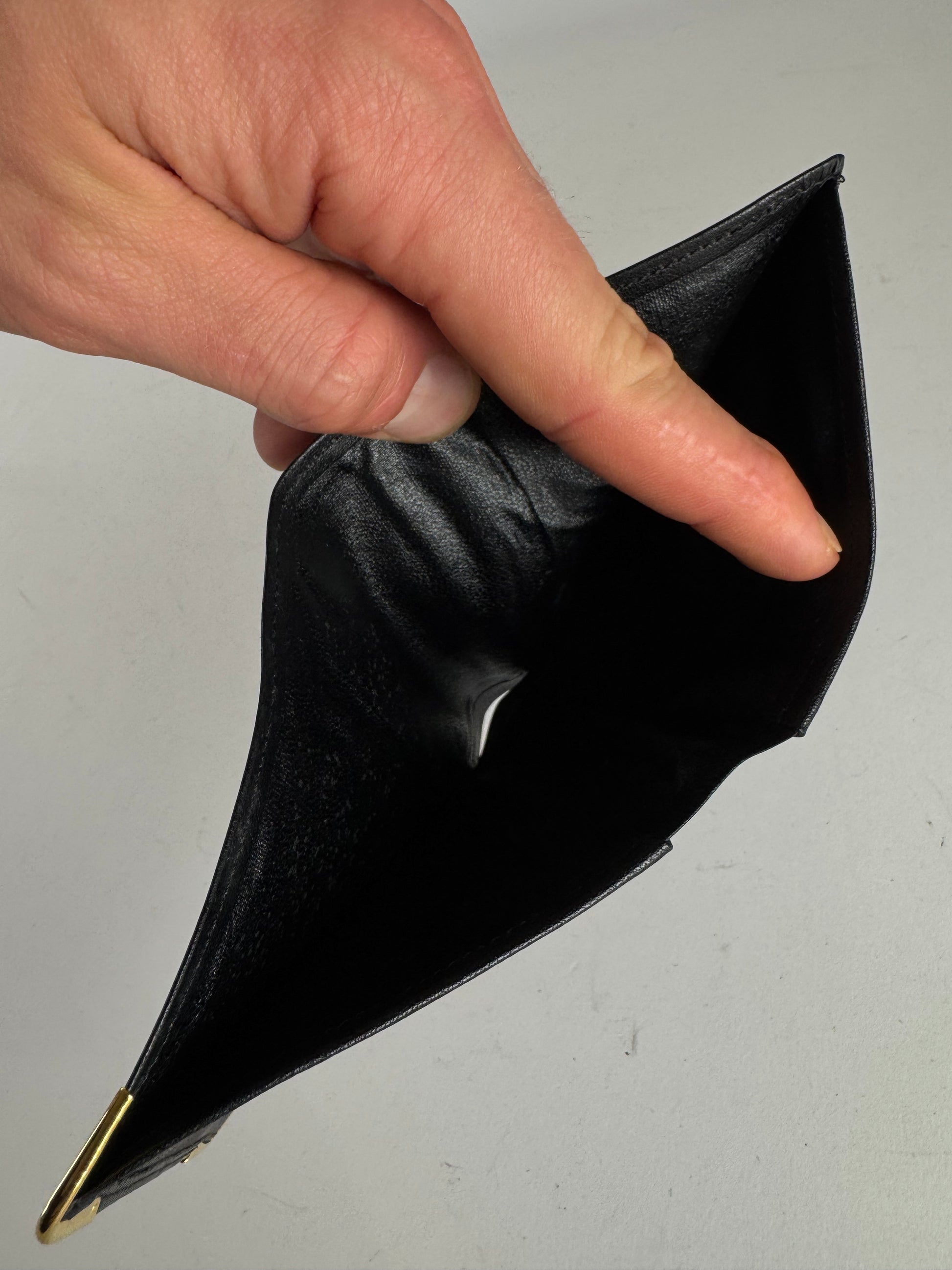 Condition Details: The leather exterior is in very good condition with some peeling in the bill compartment.