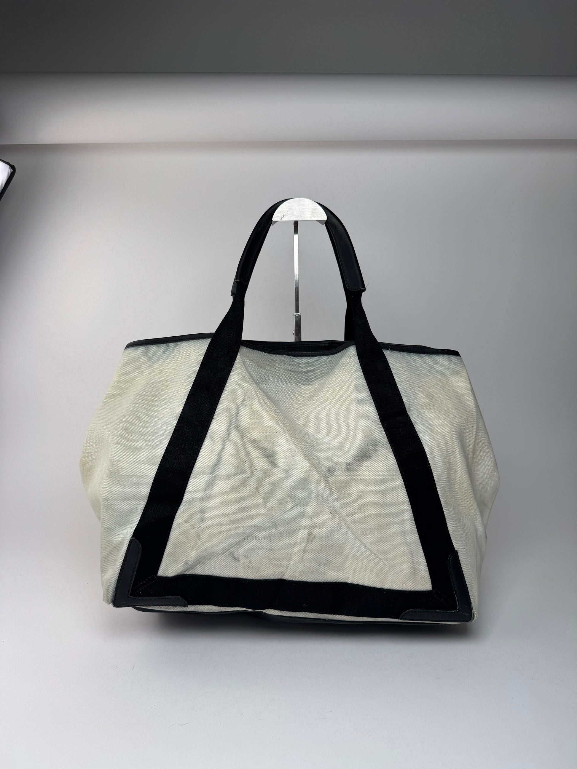BALENCIAGA Vintage Canvas Shopper Tote. This chic handbag is finely crafted of white and black canvas with black leather trim. The shoulder bag features silver-tone stainless steel hardware.
