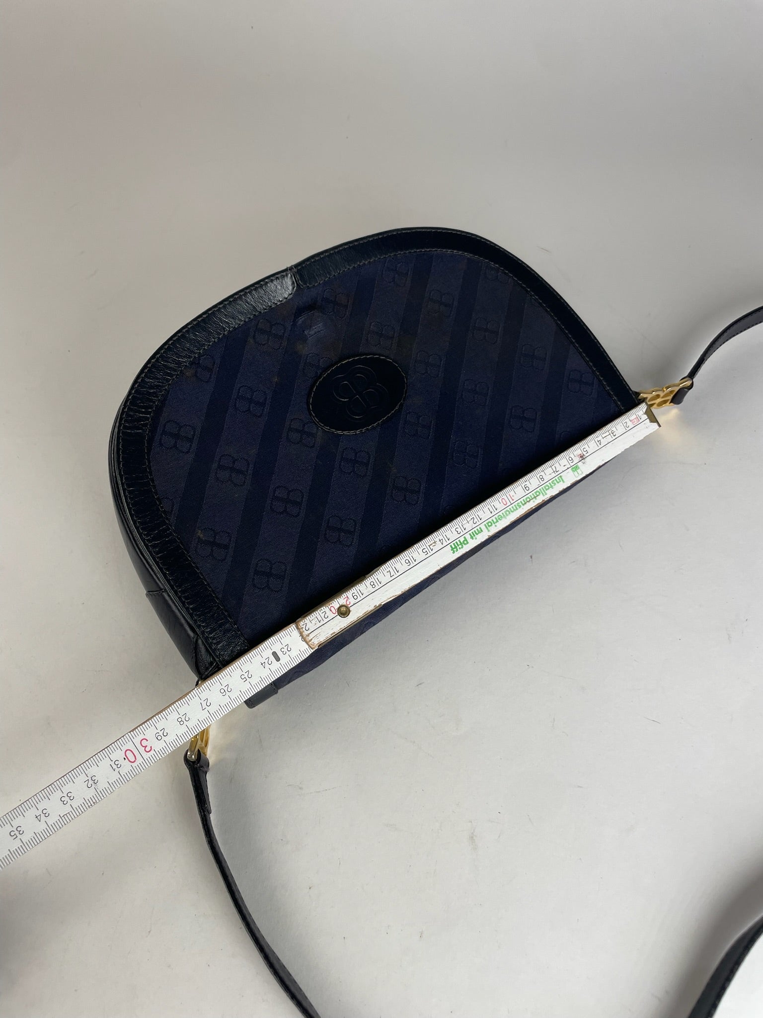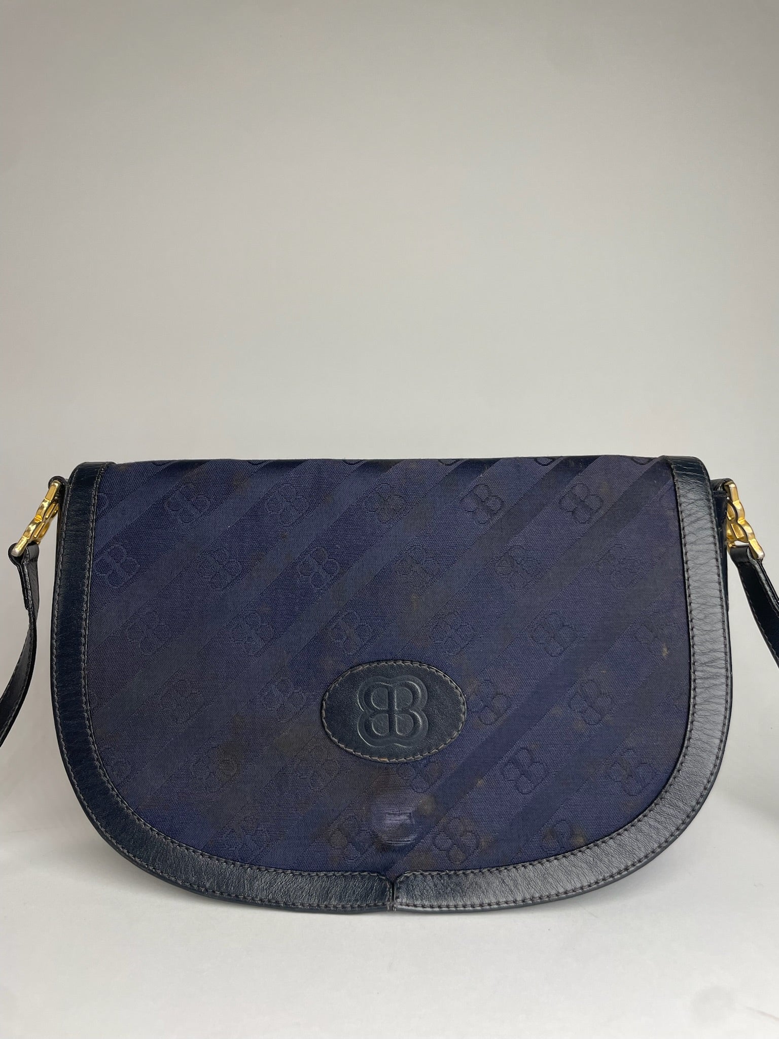 BALENCIAGA Vintage Shoulder Bag. This classic vintage shoulder bag is crafted of navy canvas in the Balenciaga monogram pattern. The bag features a navy leather BB appliqué on the front, matching navy leather trimming and shoulder strap, and gold-tone steel hardware. The bag is estimated to date from the 1970s or 1980s and reflects Balenciaga’s heritage monogram designs from that era. The bag closes with a magnetic snap button and opens to a black leather interior with Balenciaga Paris lettering.