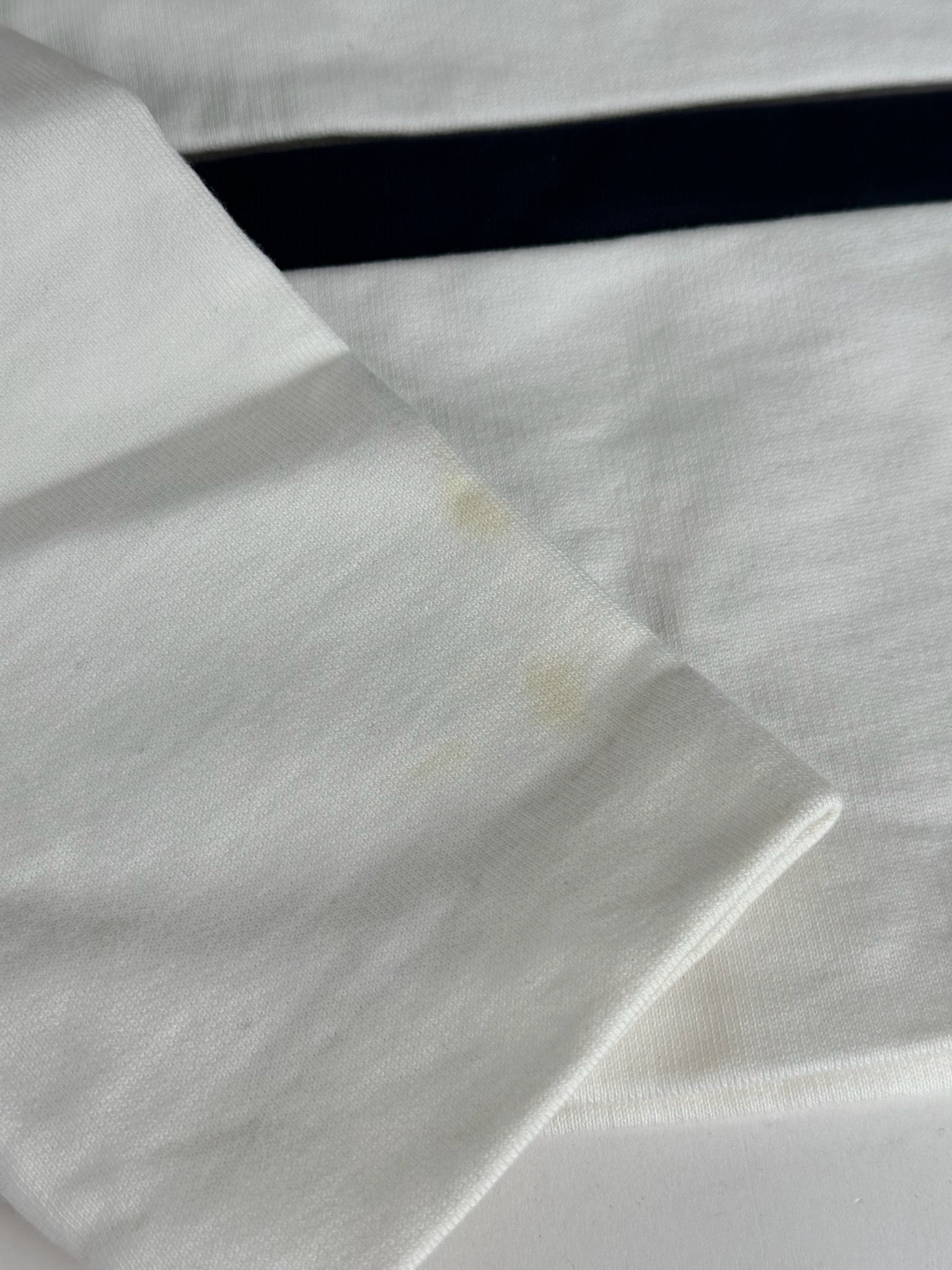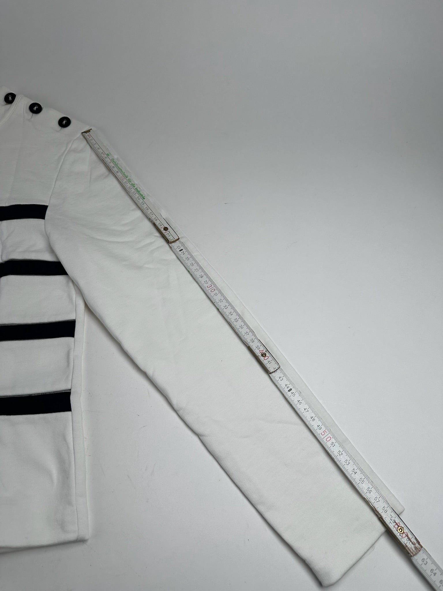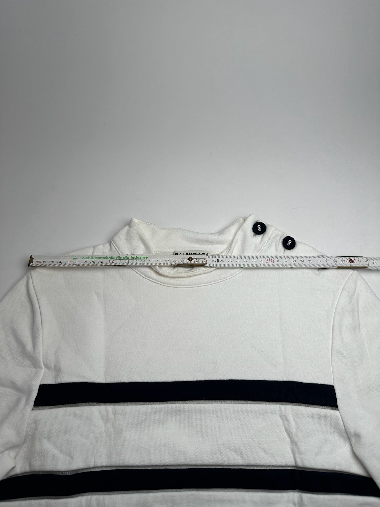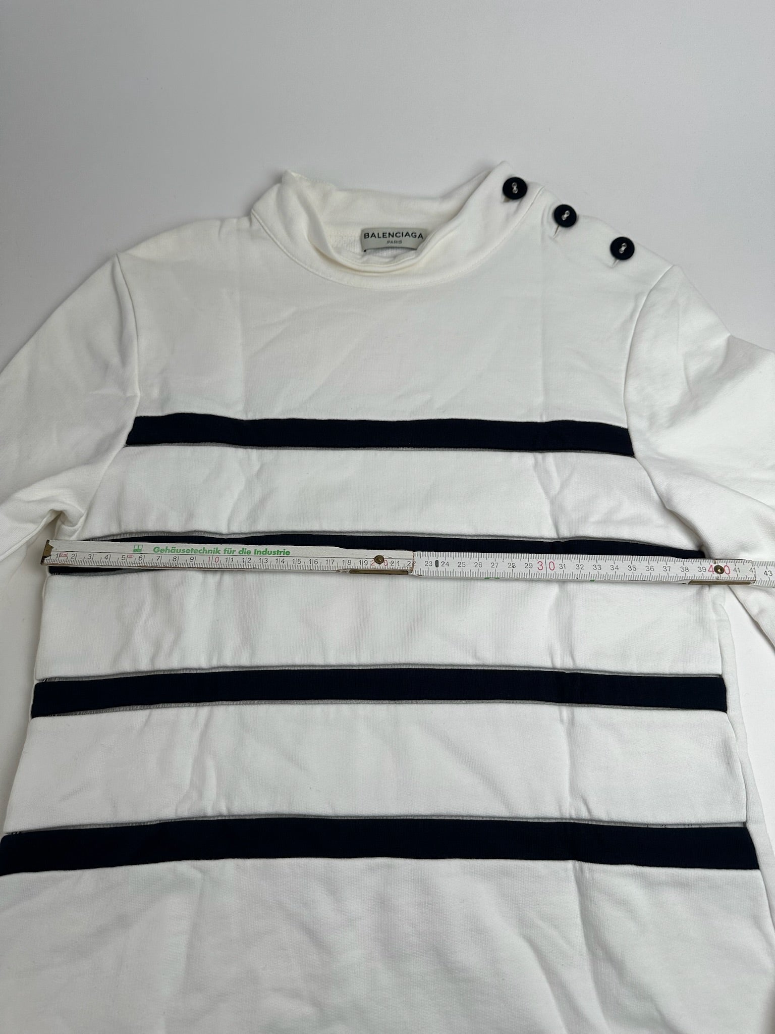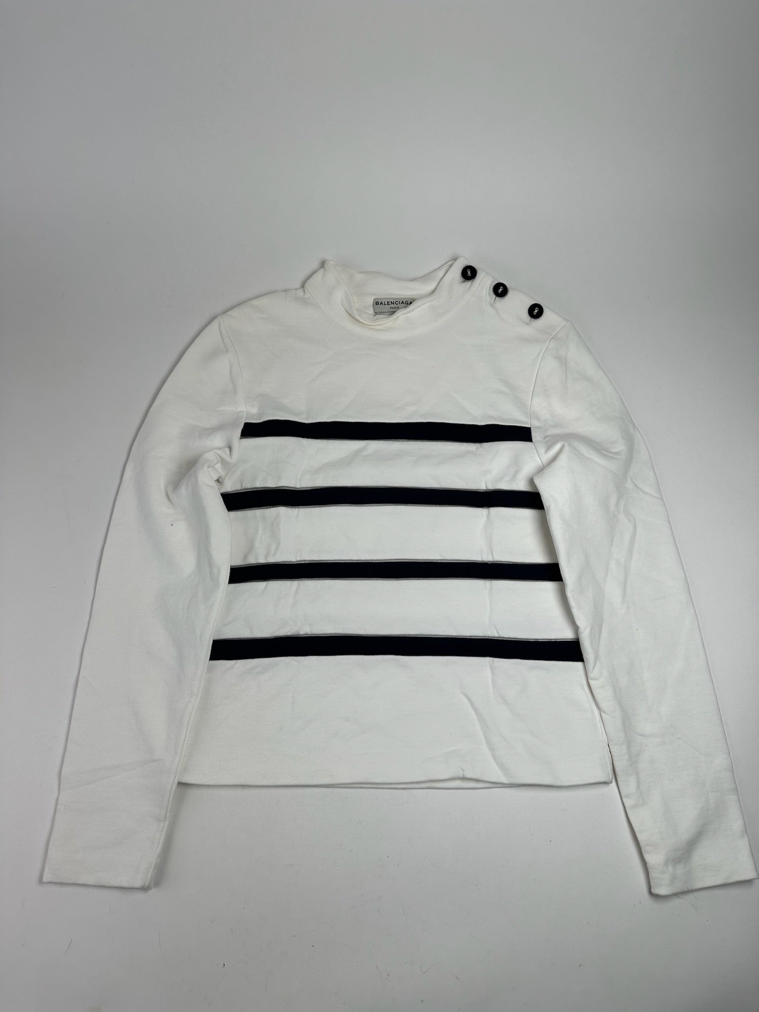 BALENCIAGA Vintage Cotton Sweater. This chic sweater is finely crafted of white cotton with four bold black horizontal stripes. It features three shoulder buttons for closure and a structured fit.
