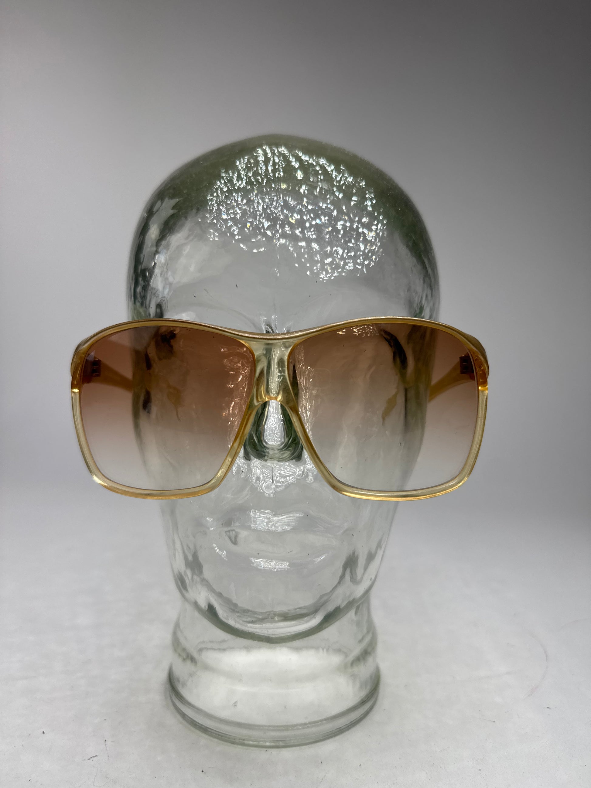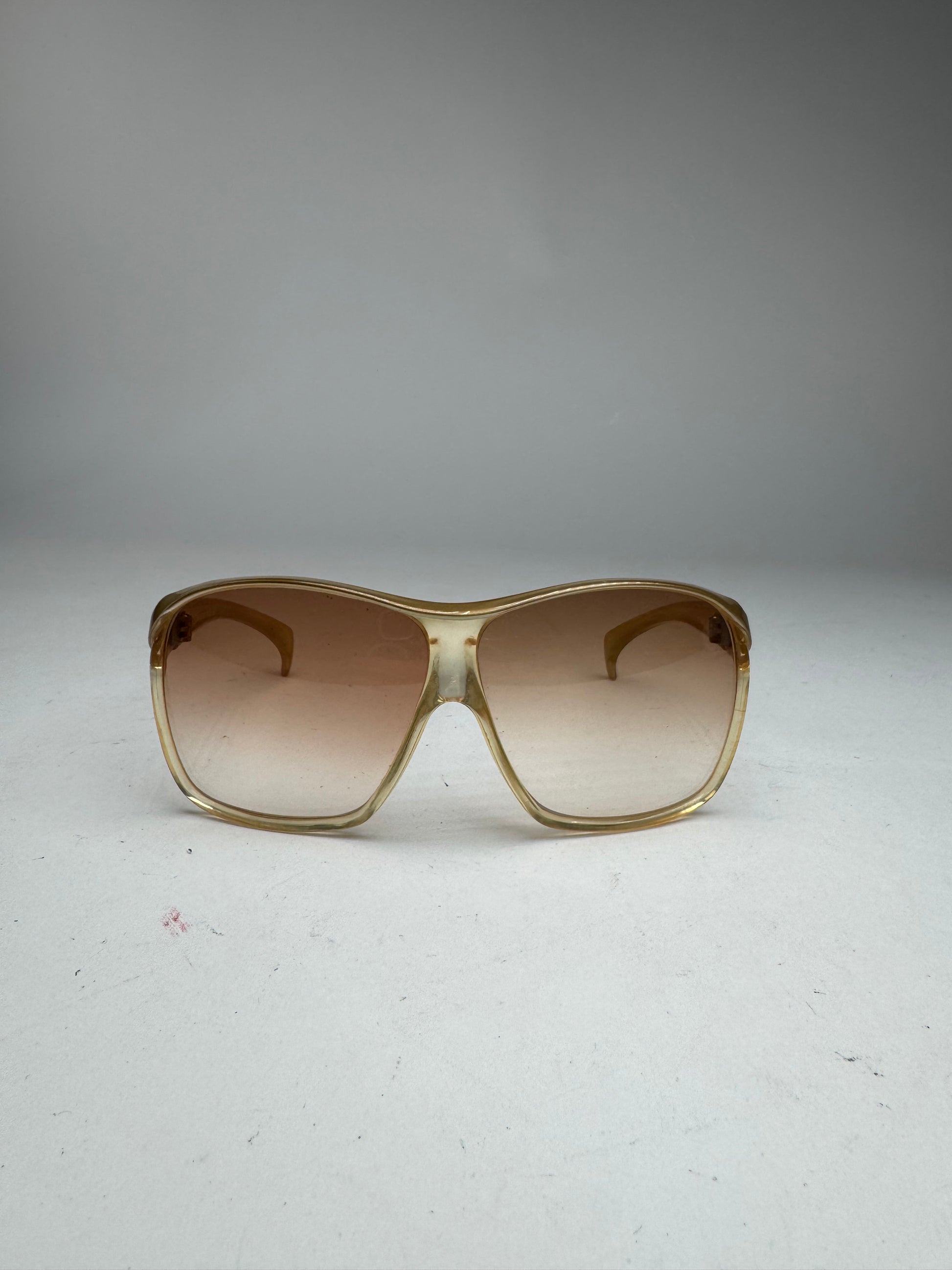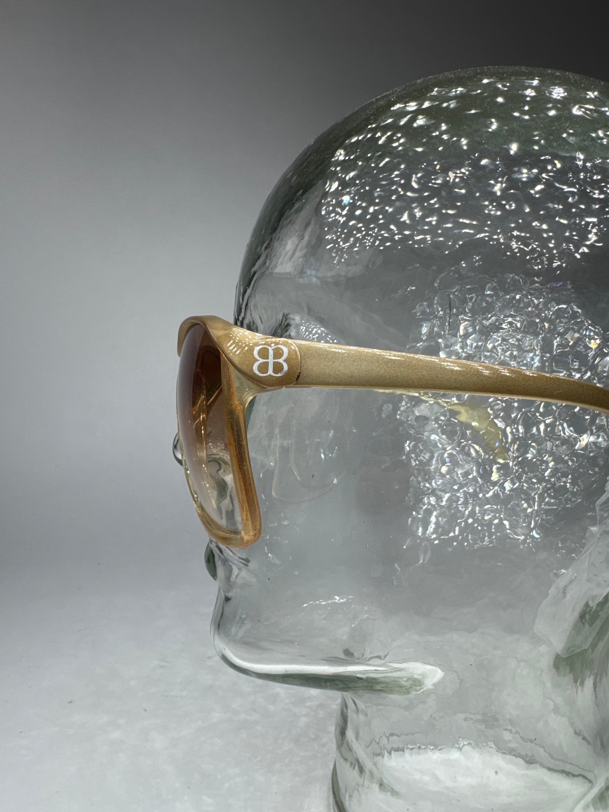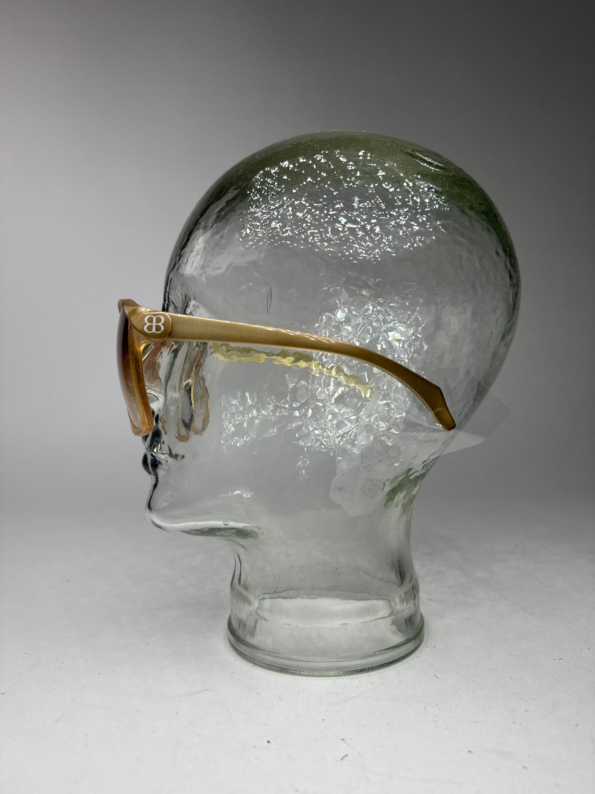 These elegant vintage oversized glasses from Balenciaga are crafted from golden plastic. The temples feature the iconic Balenciaga BB logo. The lenses are brown-tinted, offering a stylish and functional design. The glasses are in very good condition with only minor scratches. Made in France, these glasses exude timeless luxury.