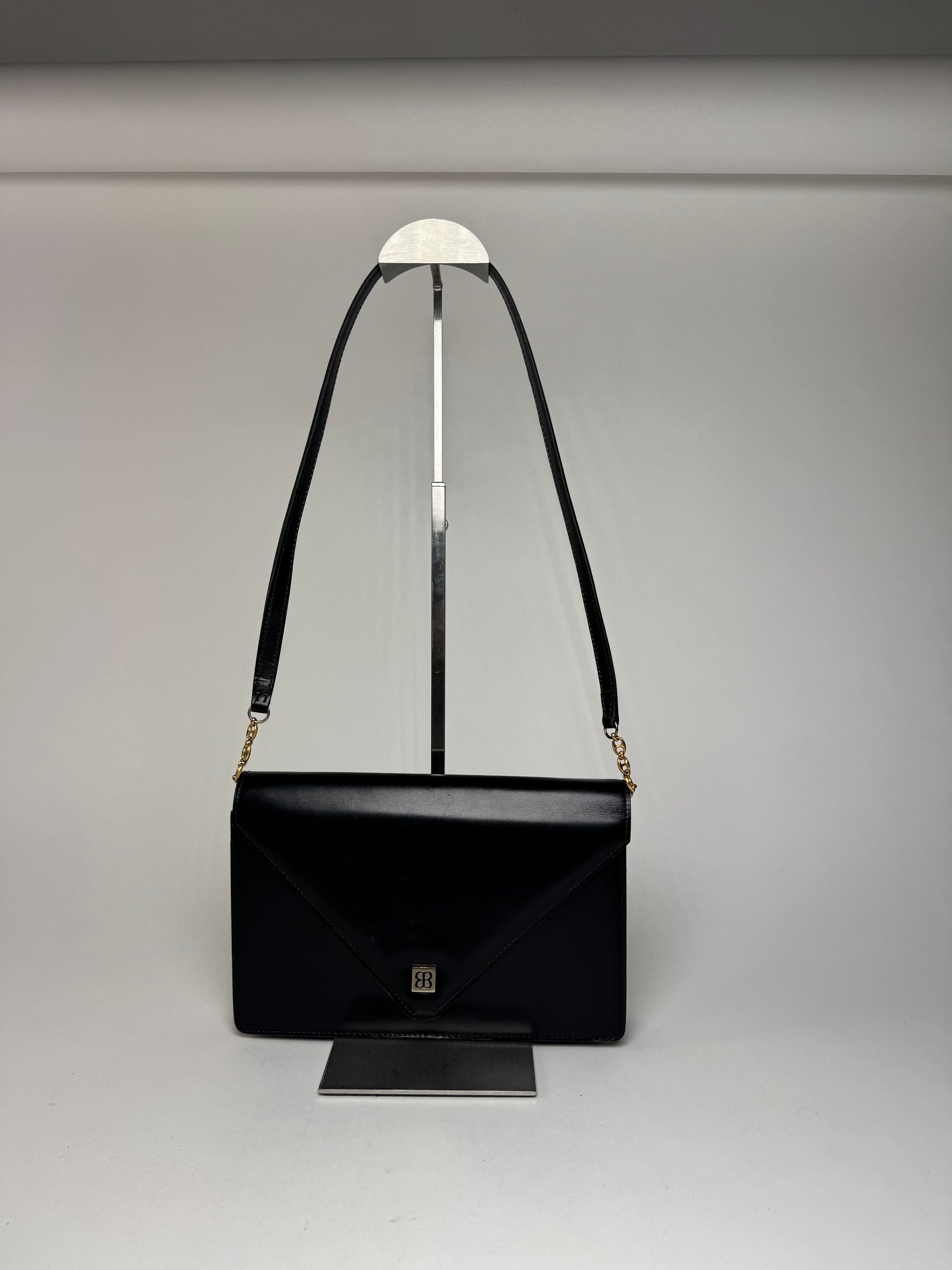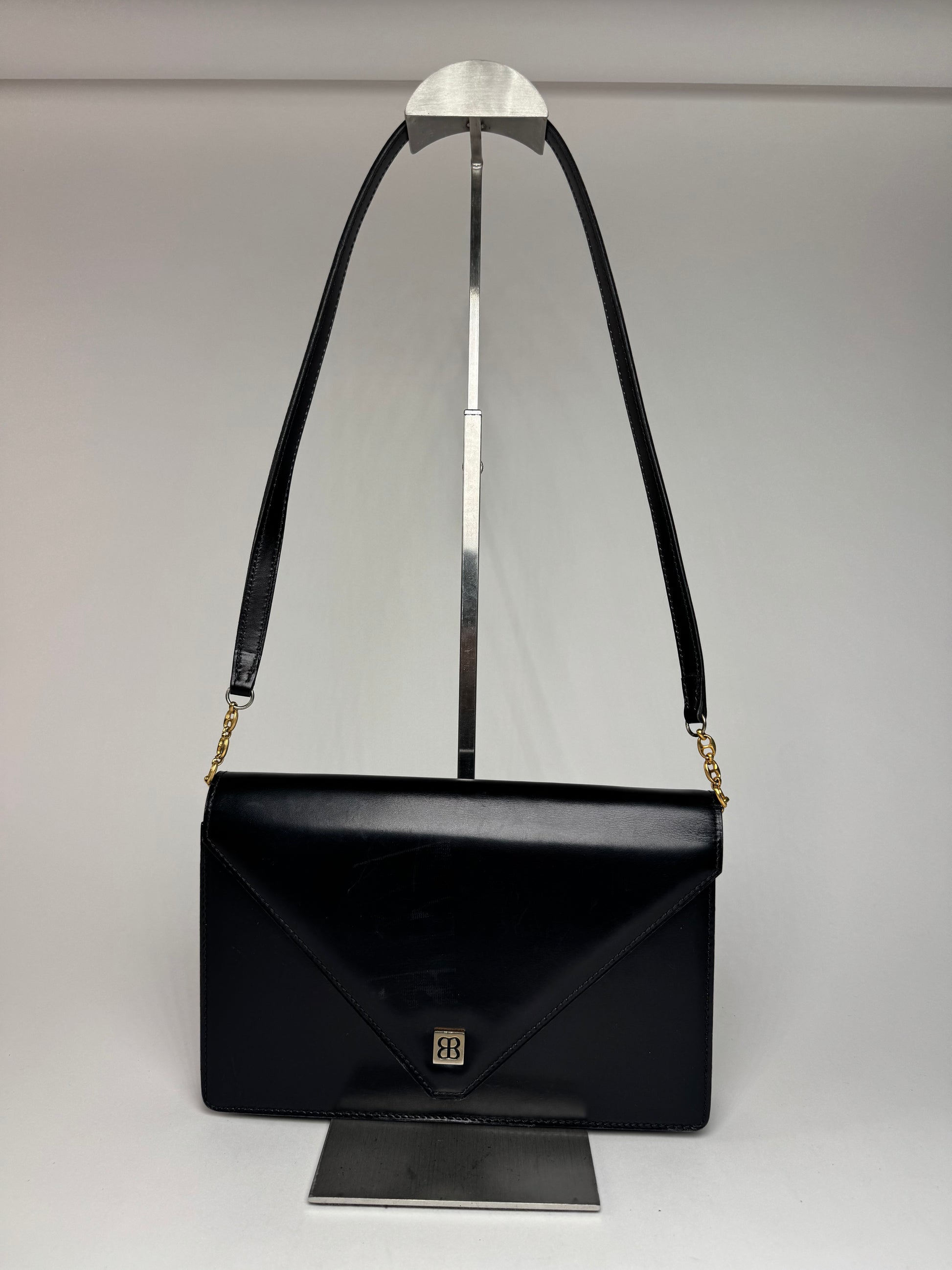 BALENCIAGA Vintage Shoulder Bag. This sophisticated vintage shoulder bag from Balenciaga is crafted from sleek black patent leather, exuding timeless elegance. The design features a matching patent leather strap intertwined with a gold-toned steel chain, adding a refined touch. The interior is lined with black leather, enhancing its luxurious appeal.