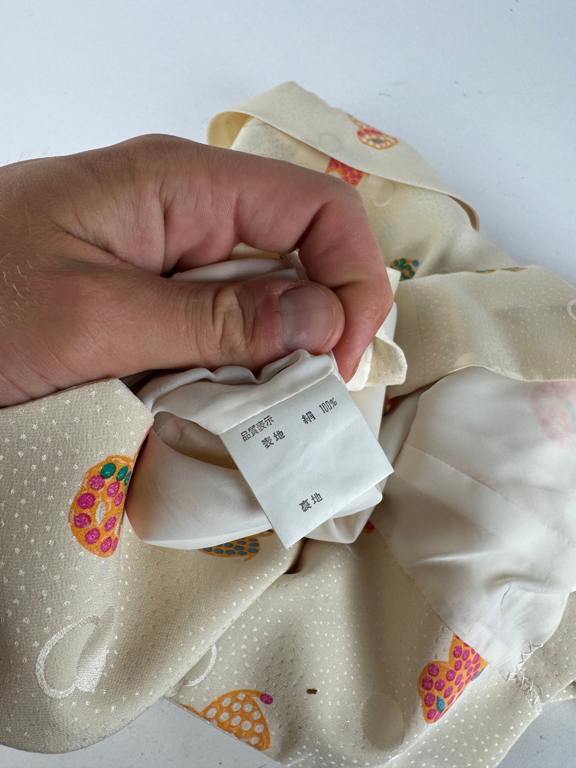 Condition Details: The silk fabric is in beautiful condition with bold colors and detailed print. There are some visible stains, but overall wear remains light. The blazer’s structure and buttons are well preserved. The interior is clean and intact.