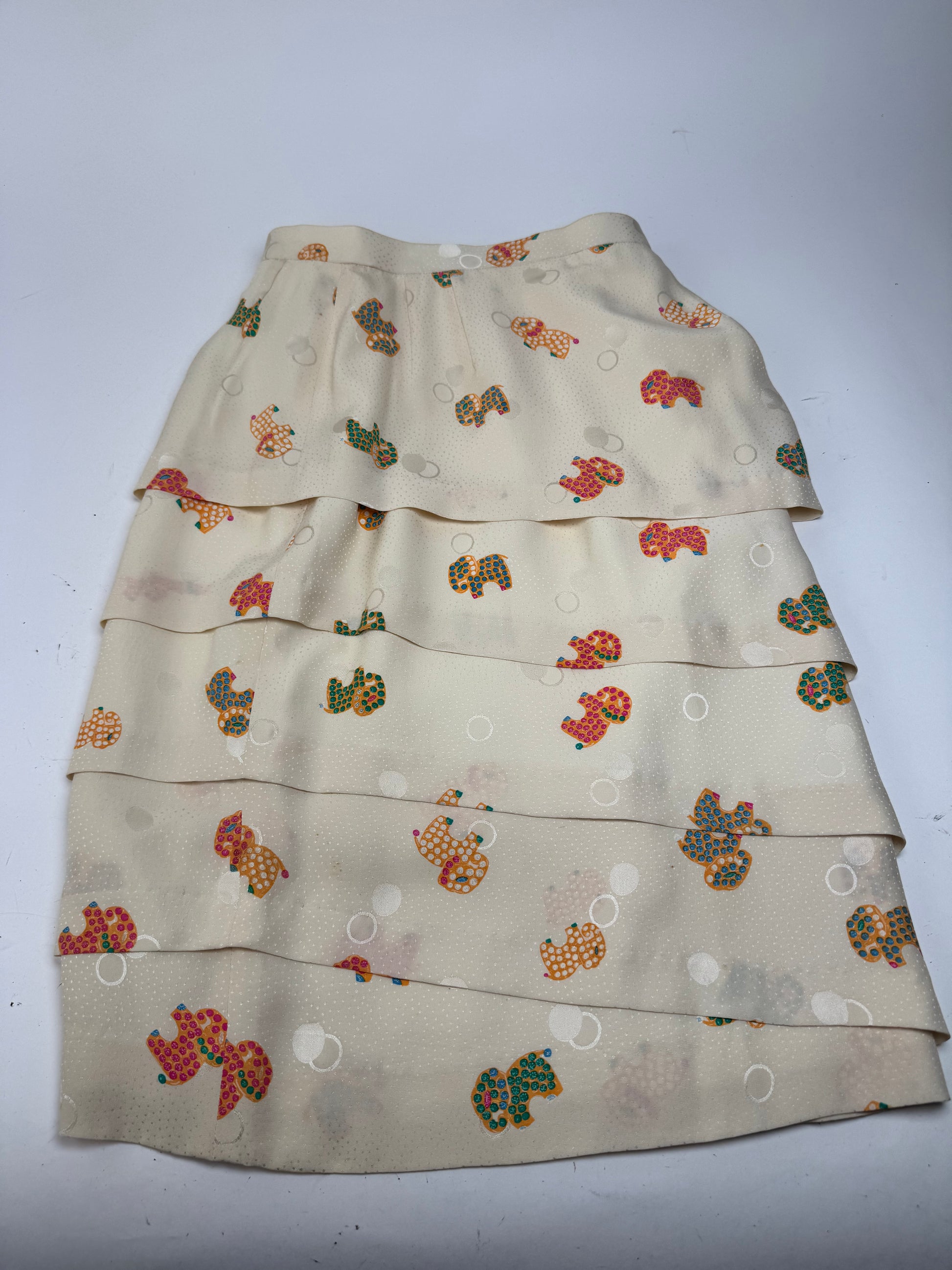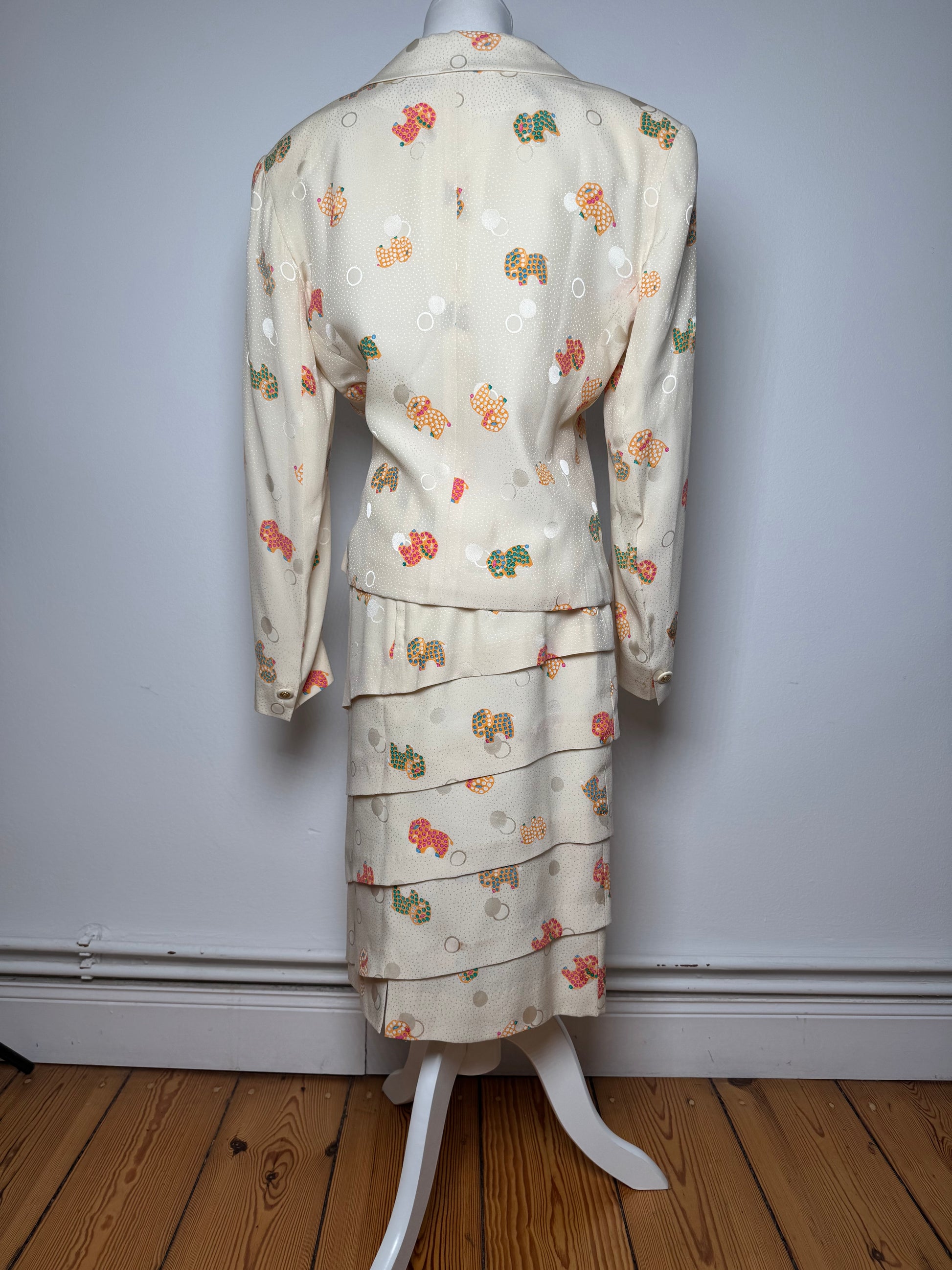 BALENCIAGA Vintage Silk Elephant Twin Set. This exceptional two-piece set is crafted from luxurious silk and features a vibrant print of red, gold, and green elephants with subtle dotted accents. The ensemble includes a sharply tailored blazer with shoulder pads and a matching high-waist skirt. Gold-tone steel buttons engraved with the Balenciaga BB logo complete the standout 1980s design. Model on photo is size 38/M.