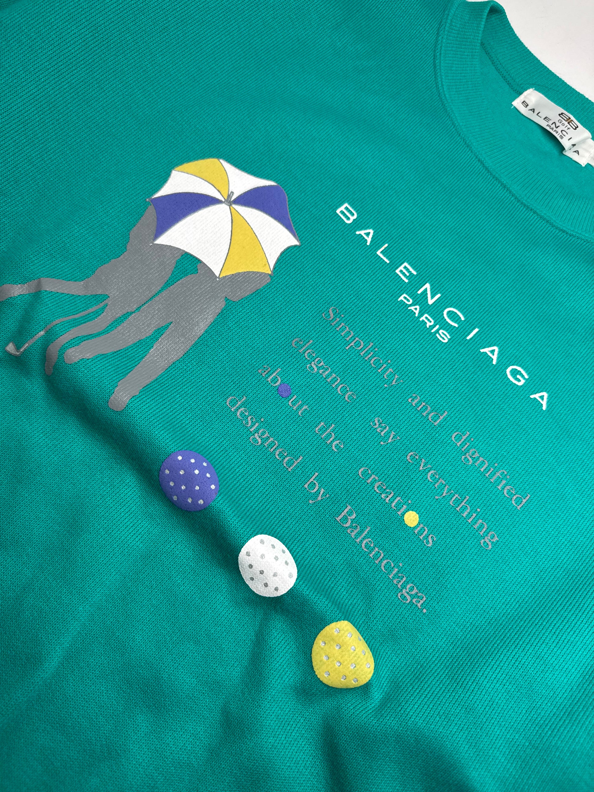 BALENCIAGA Vintage Wool Pullover. This unique vintage pullover is crafted from virgin wool in a vibrant turquoise hue and features a golf-playing couple with white, yellow, and blue umbrellas on the front. A printed Balenciaga logo is paired with the phrase: "Simplicity and dignified elegance say everything about the creation designed by Balenciaga." Model on photo is size 38/M.